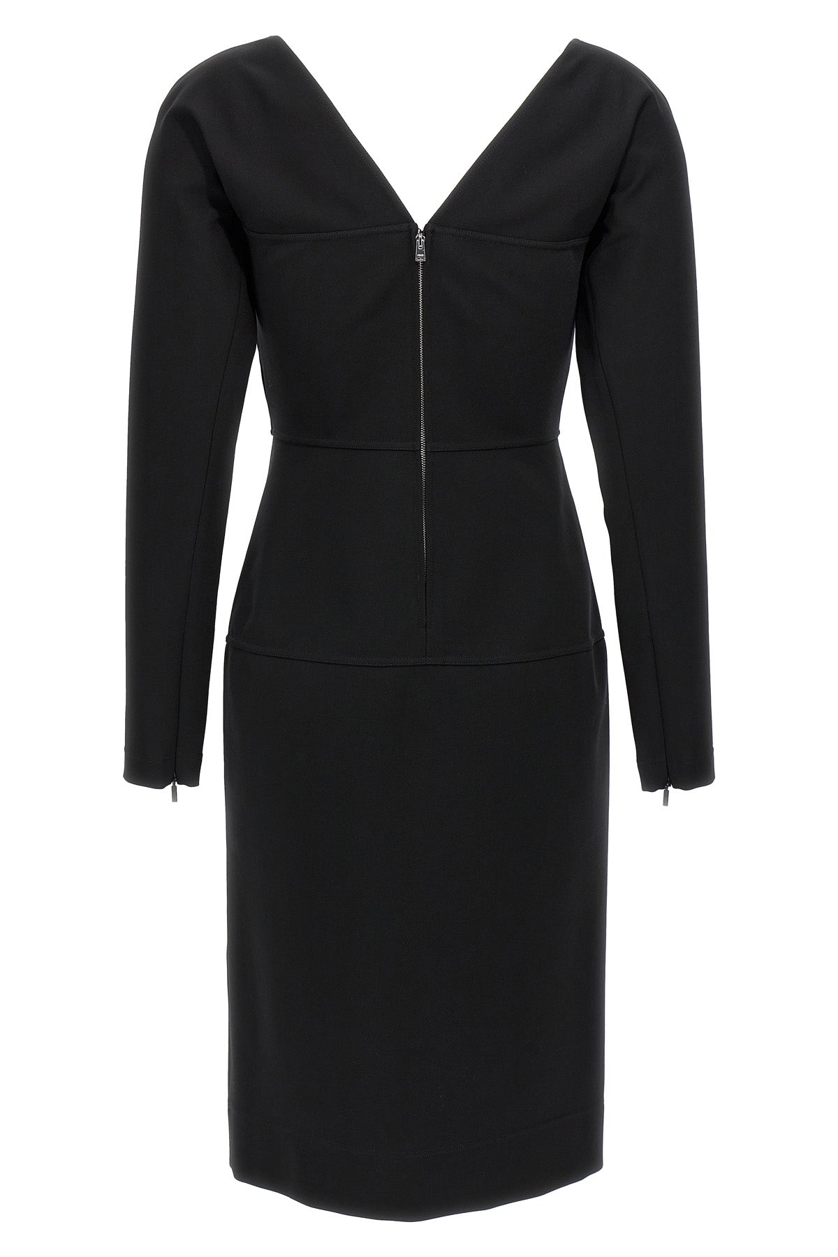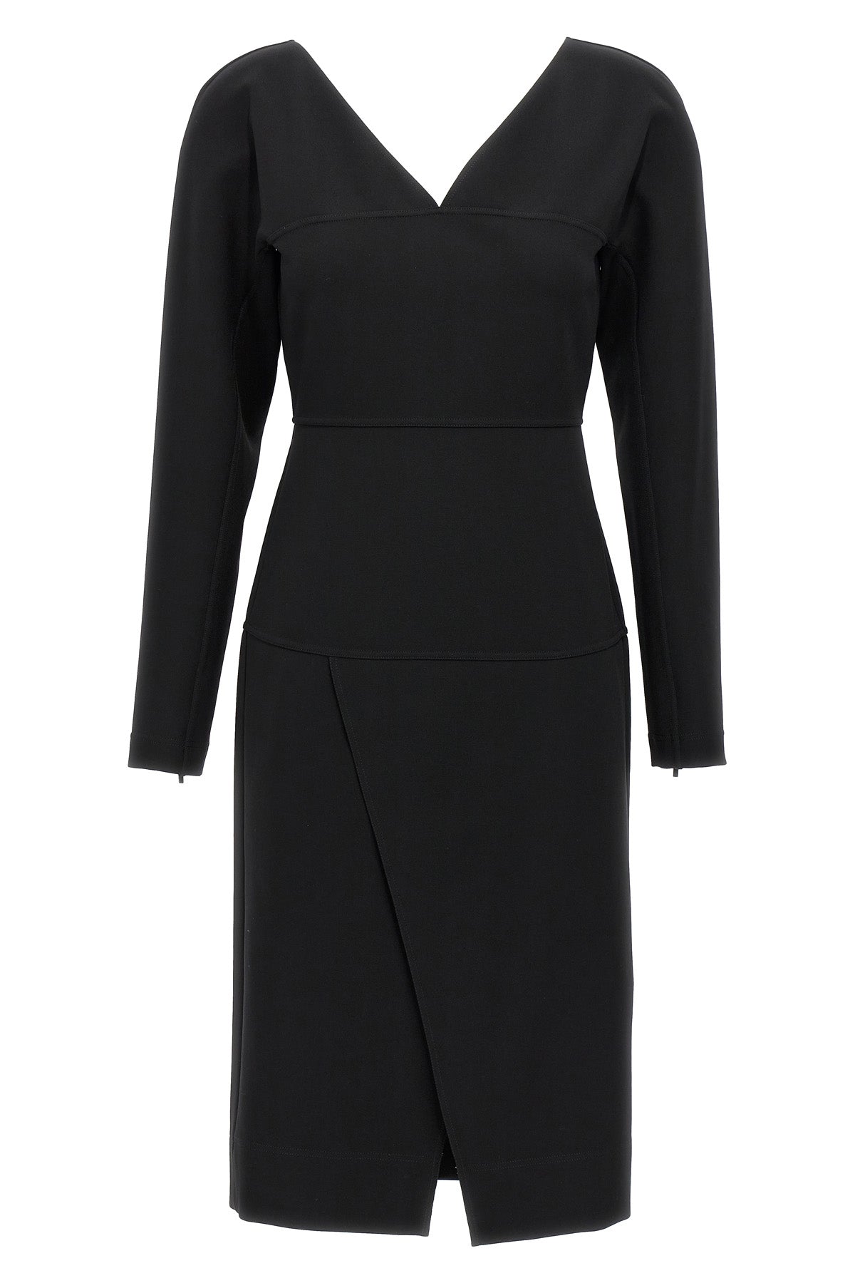 Robe en jersey technique, col en V devant et dos, manches longues avec fermeture éclair, fente sur le devant, fermeture éclair au dos.