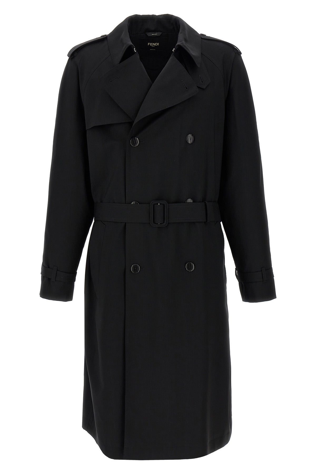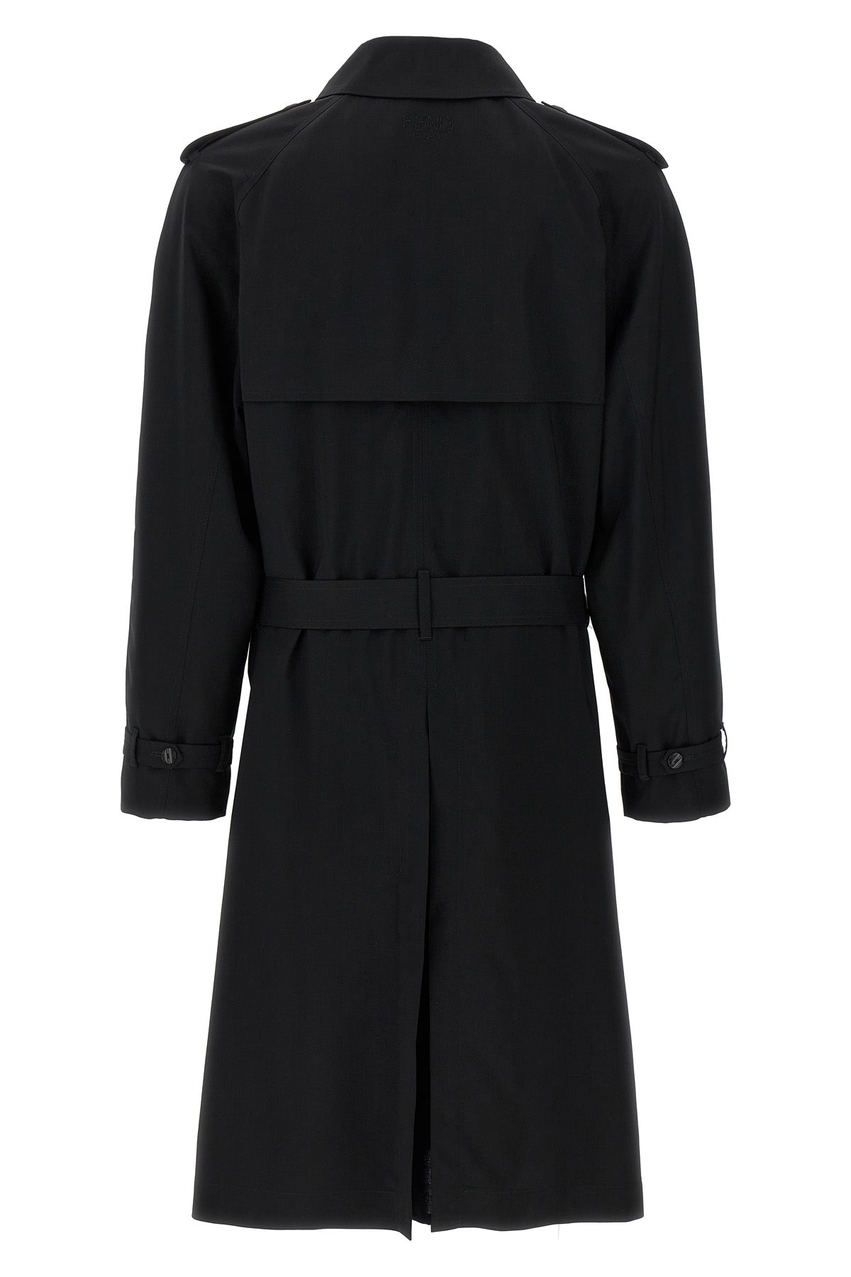 Trench-coat croisé en laine avec fermeture boutonnée sur le devant, mentonnière amovible, doublure en satin avec logo jacquard monogramme Ff, manches longues à poignets boutonnés, poches, fente et broderie logo ton sur ton au dos, et ceinture amovible.