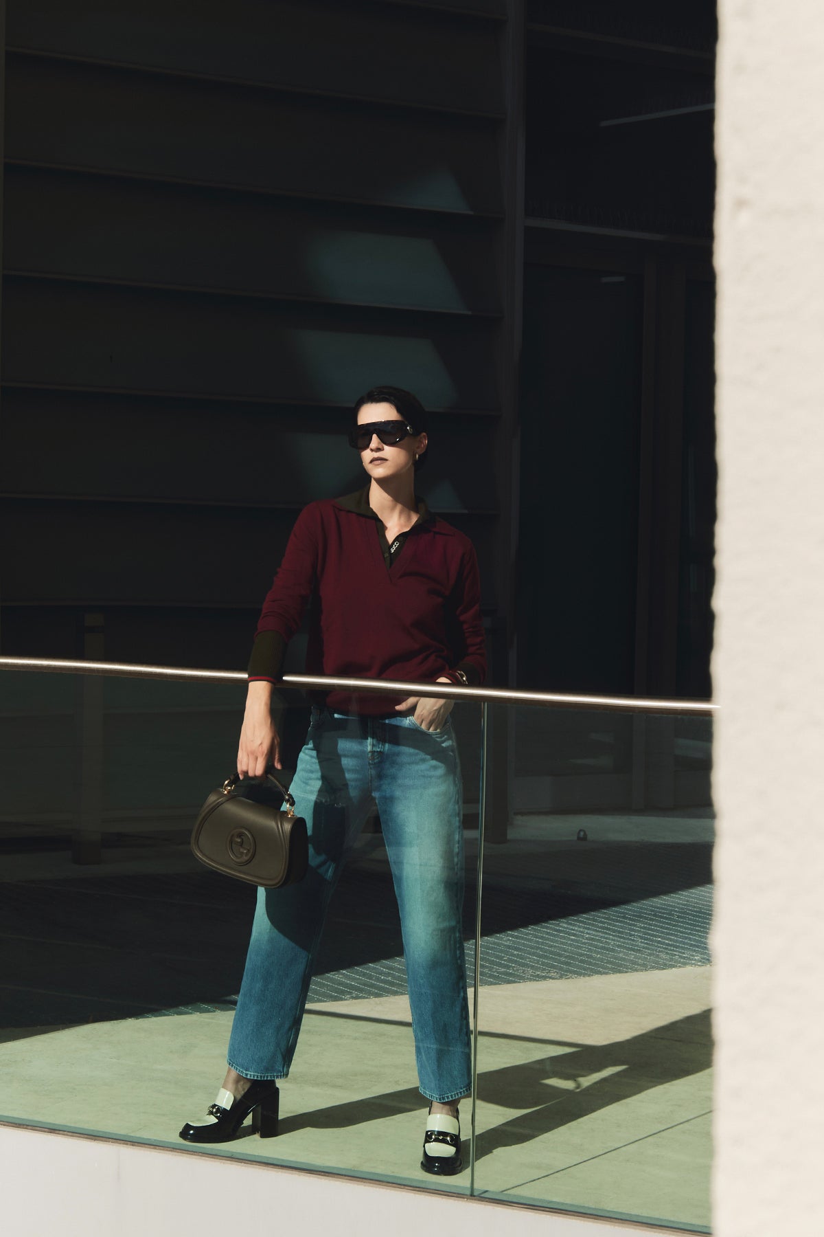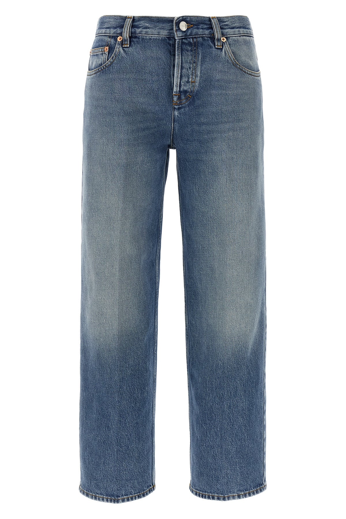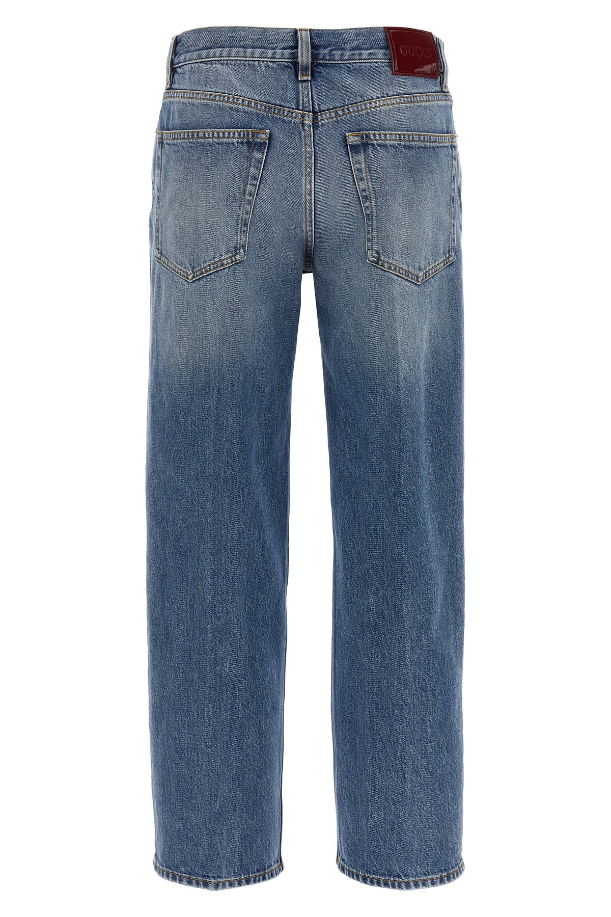 Jean en denim de coton lavé, coupe droite, plis étirés, fermeture boutonnée sur le devant, cinq poches, étiquette logo Gucci rouge Naplak à l'arrière.