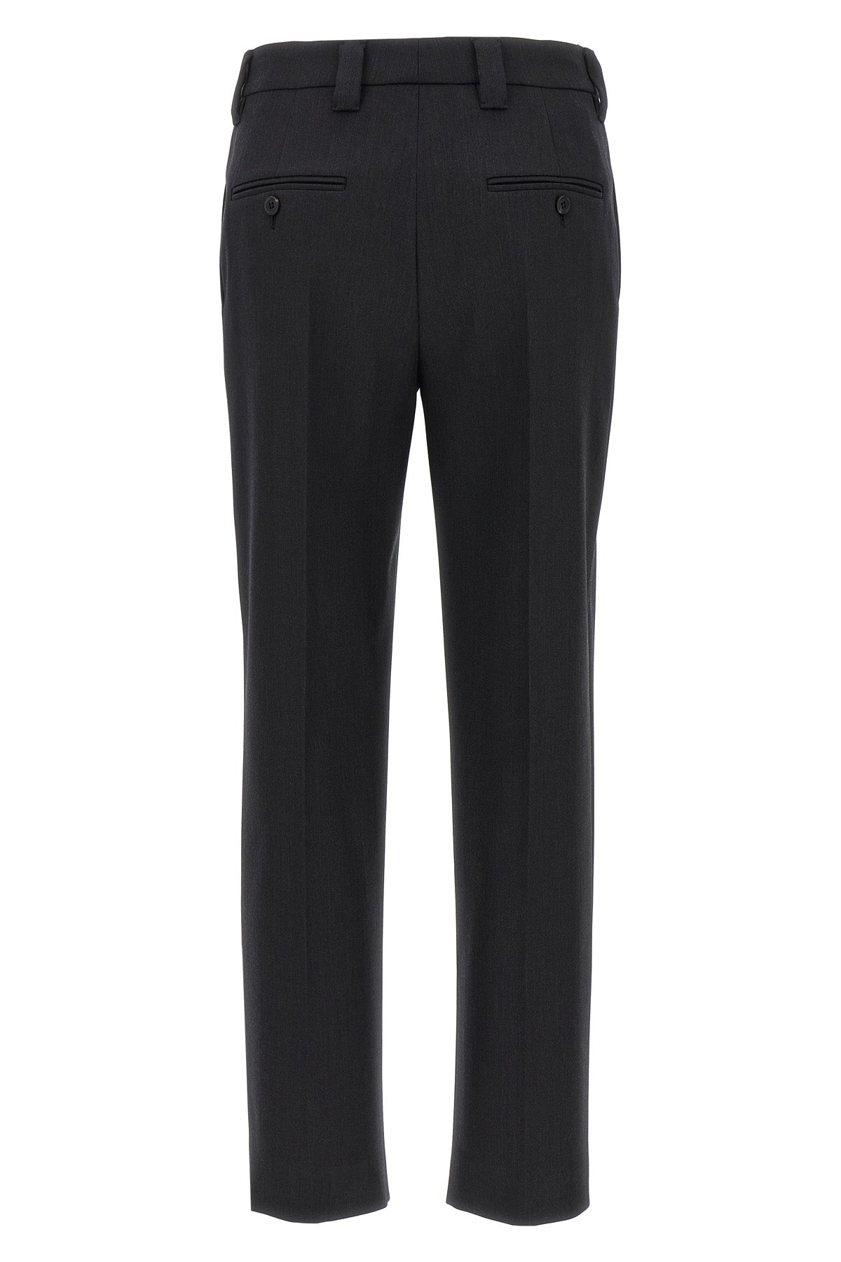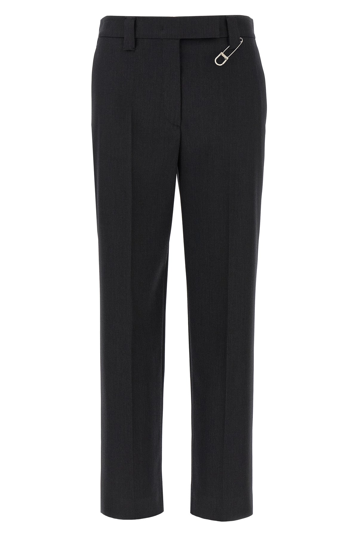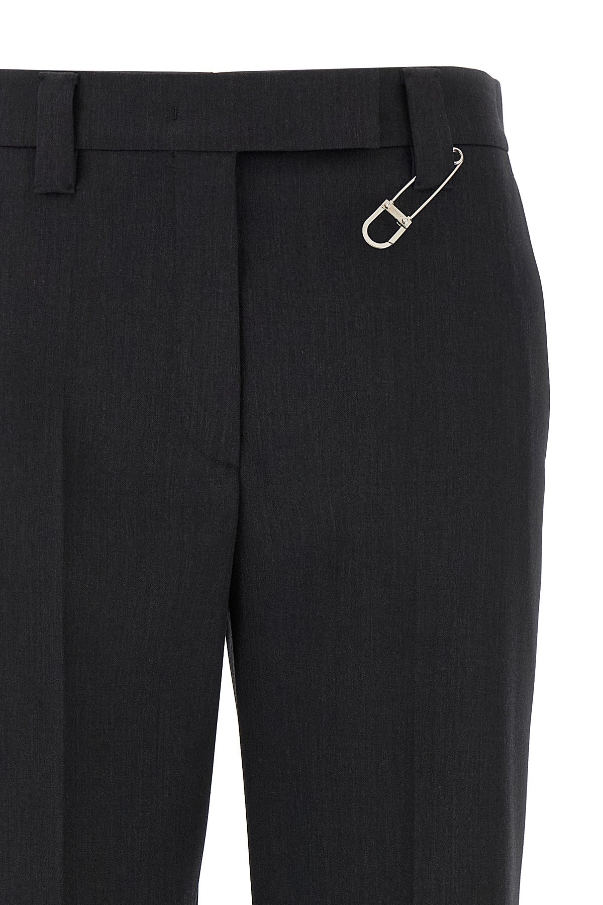Pantalon en laine vierge mélangée, broche en métal avec logo gravé amovible, pli extensible, jambe droite, fermeture éclair et bouton sur le devant, poches.