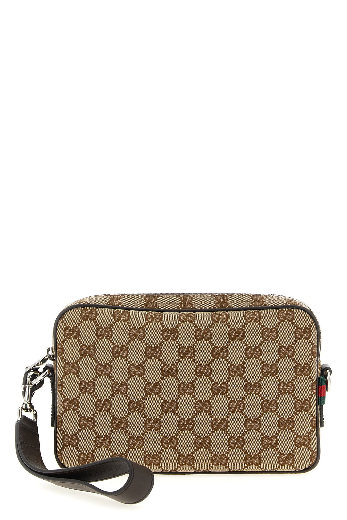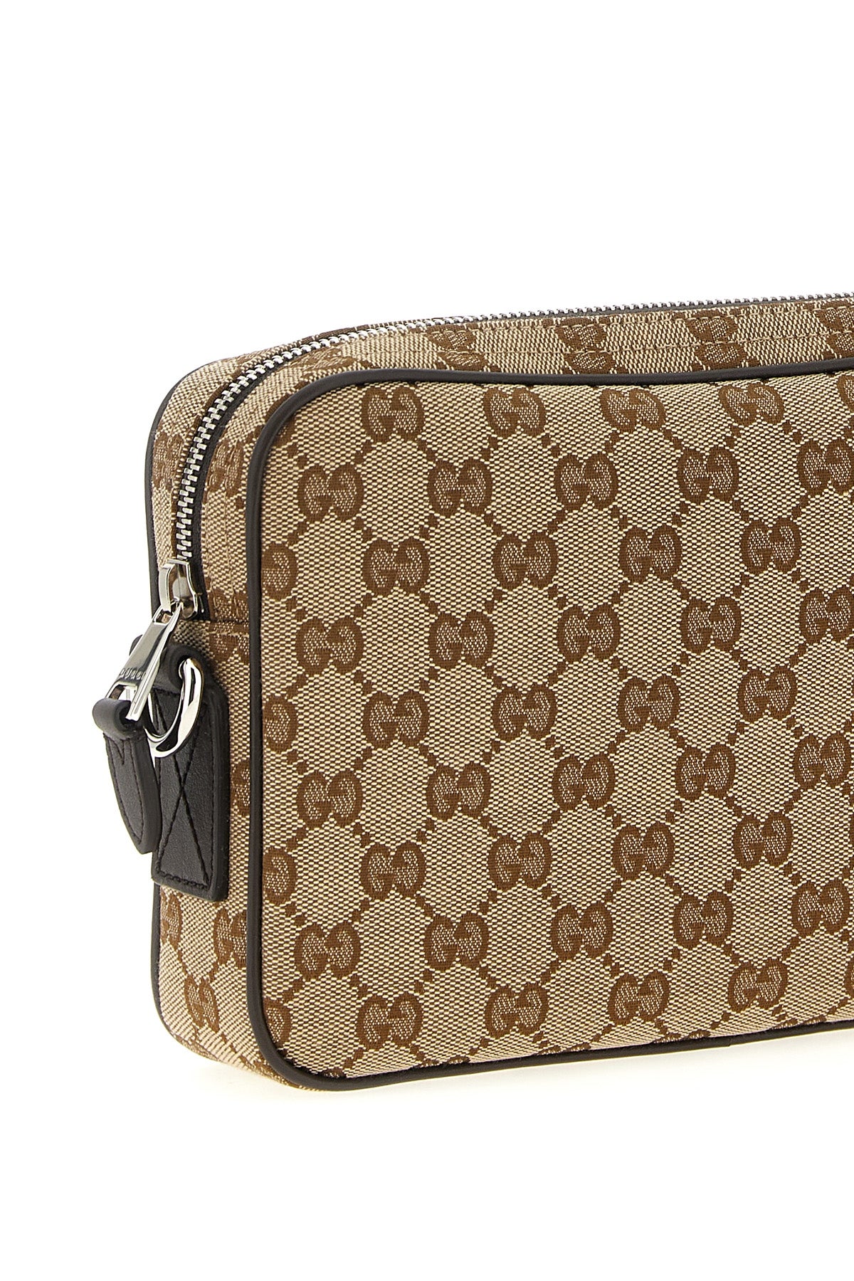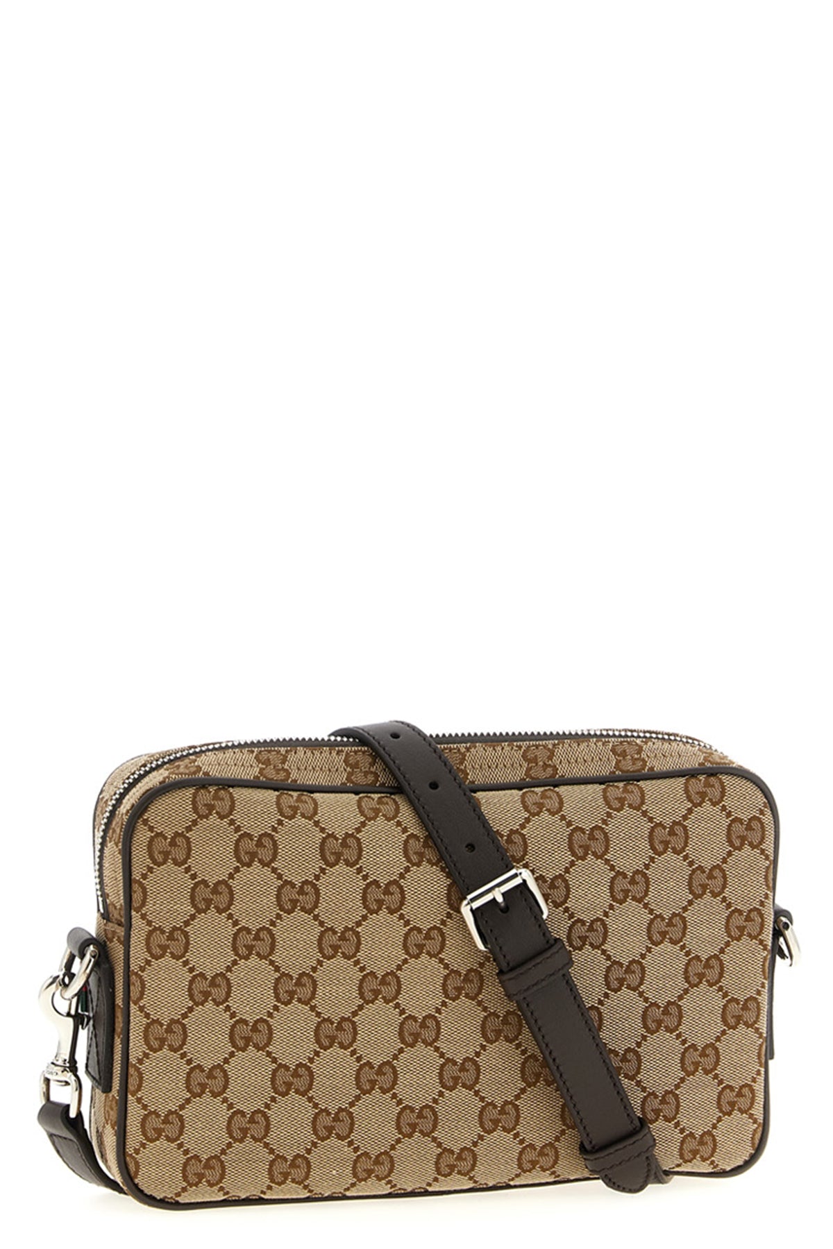 Petit sac bandoulière en tissu GG avec détails en cuir lisse, fermeture éclair sur le dessus, doublure en nylon, poignée de poignet amovible, bandoulière réglable et amovible.