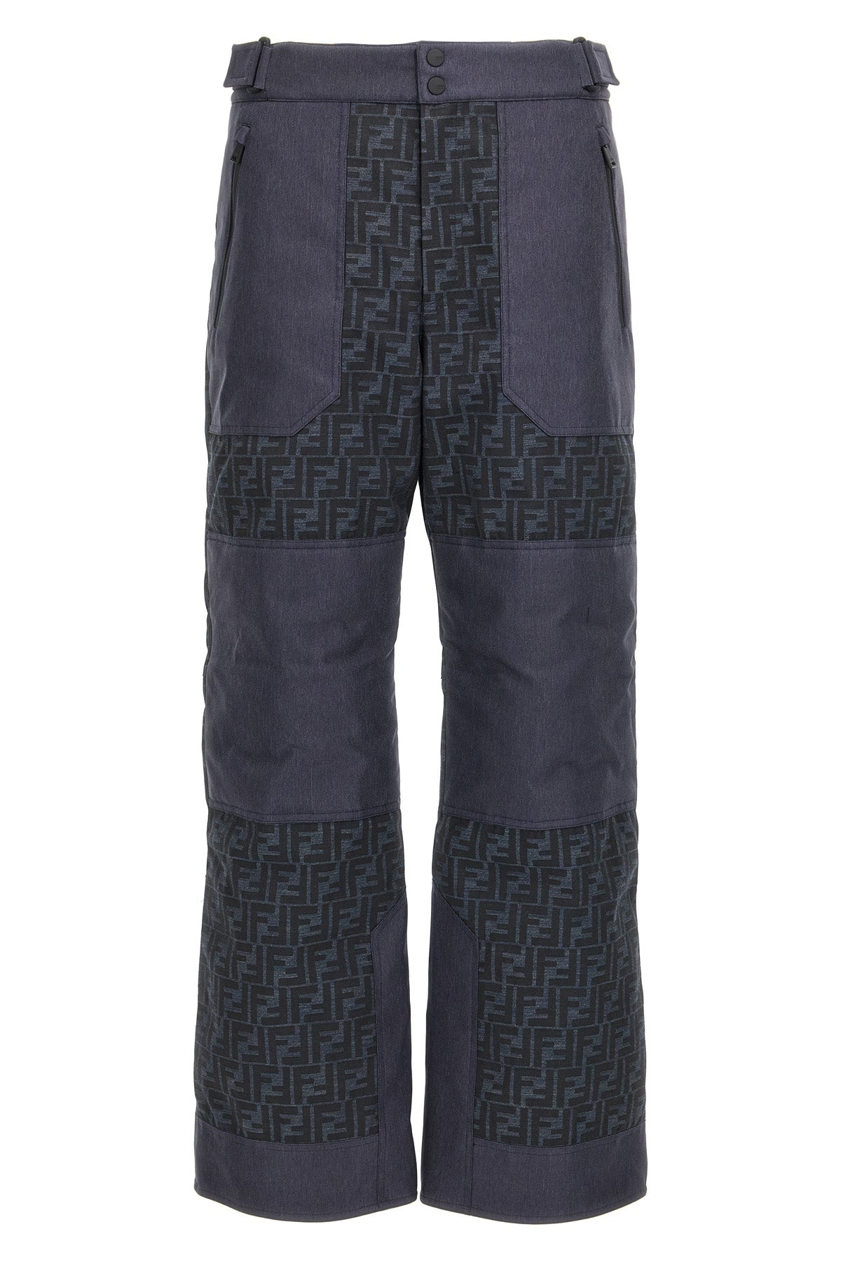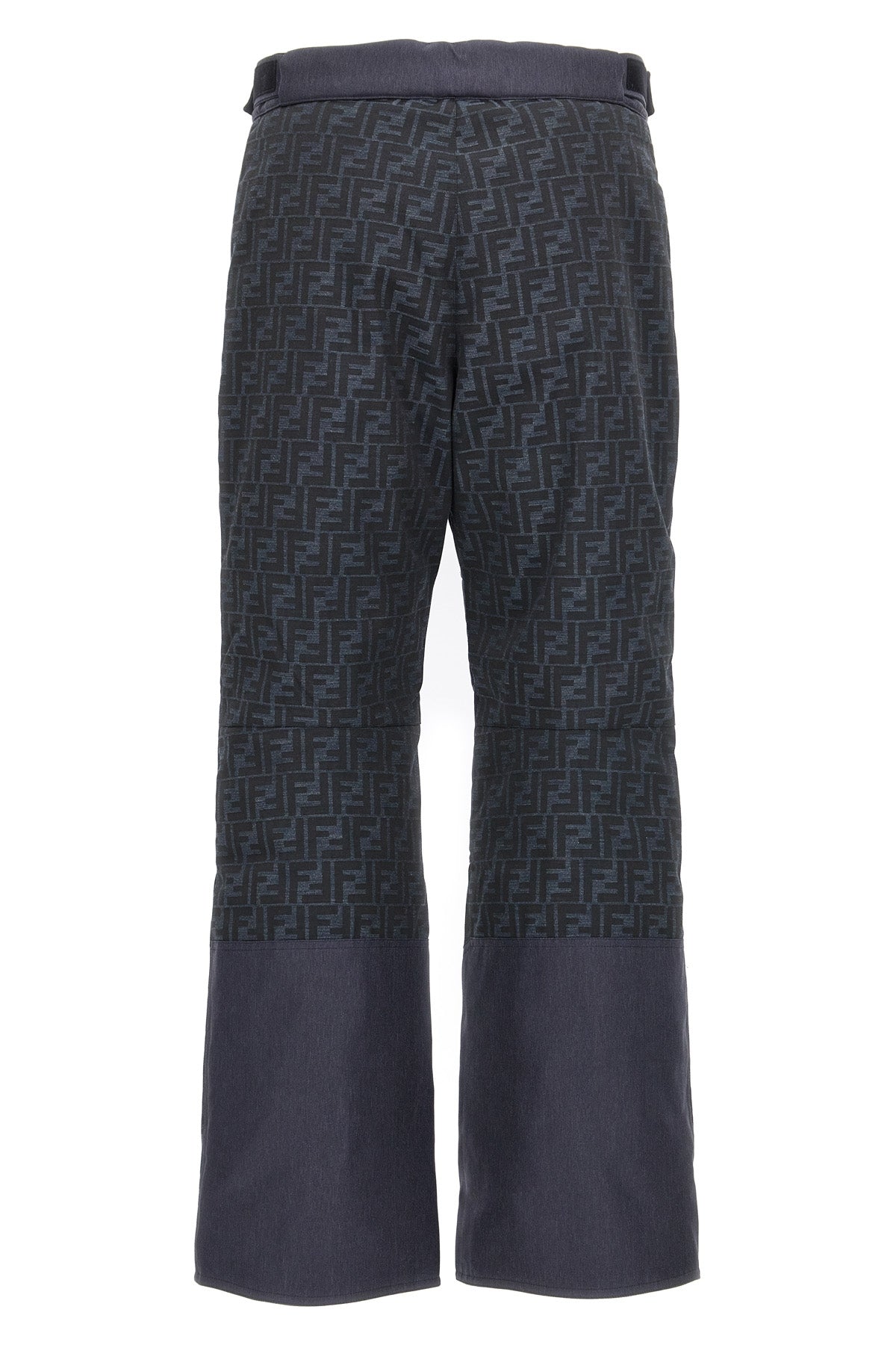 Pantalon de ski en tissu technique jacquard effet denim déperlant ' Ff ', modèle taille haute, sangles latérales réglables, fermeture éclair et bouton, poches.
