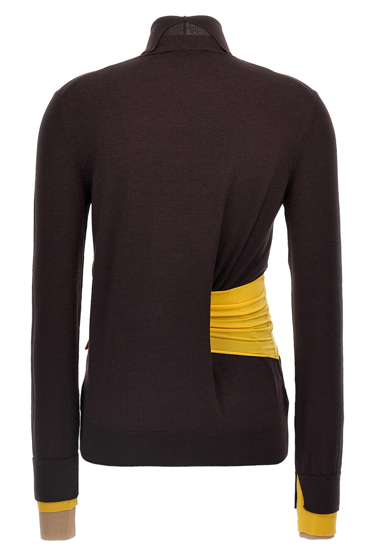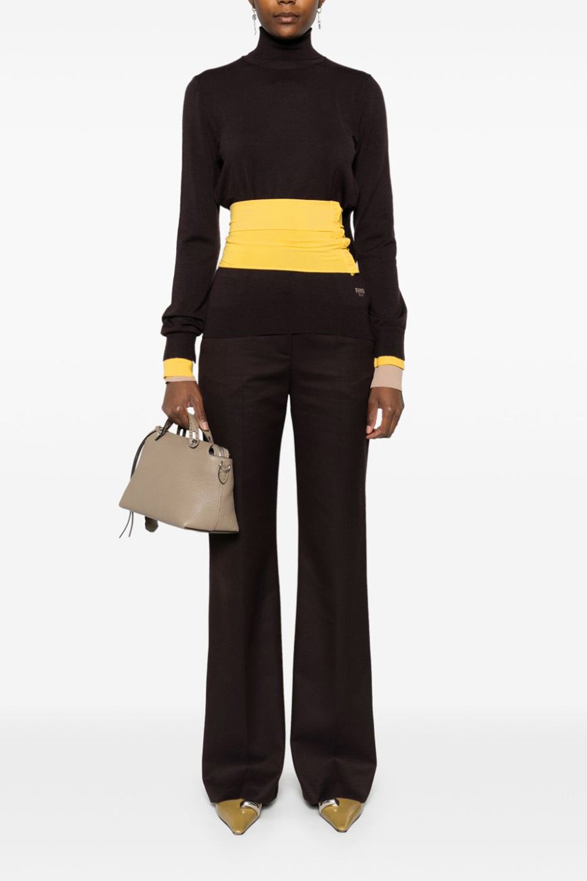 Pull à col roulé en laine, ceinture en tissu extensible et fermeture à boutons, manches longues avec poignets multicouches, logo brodé sur le devant.