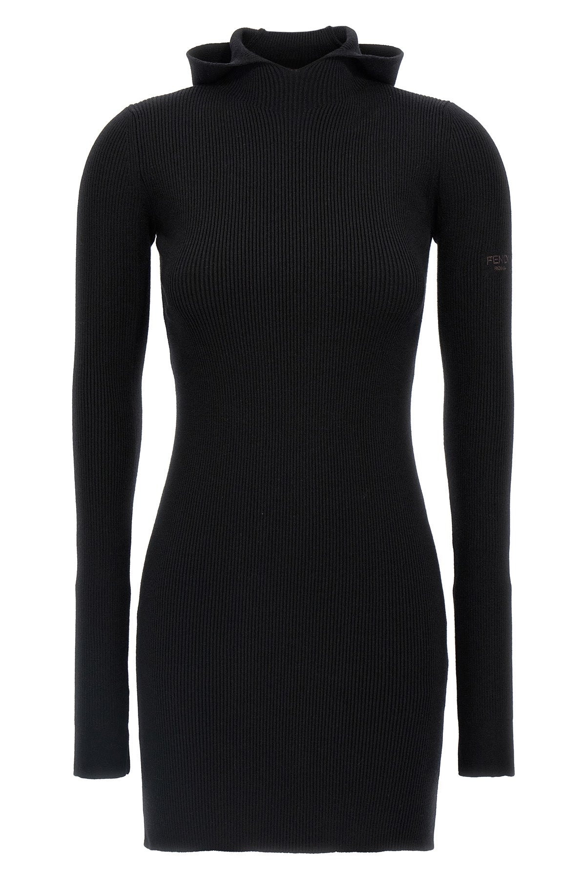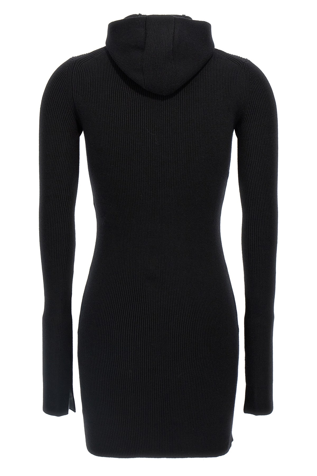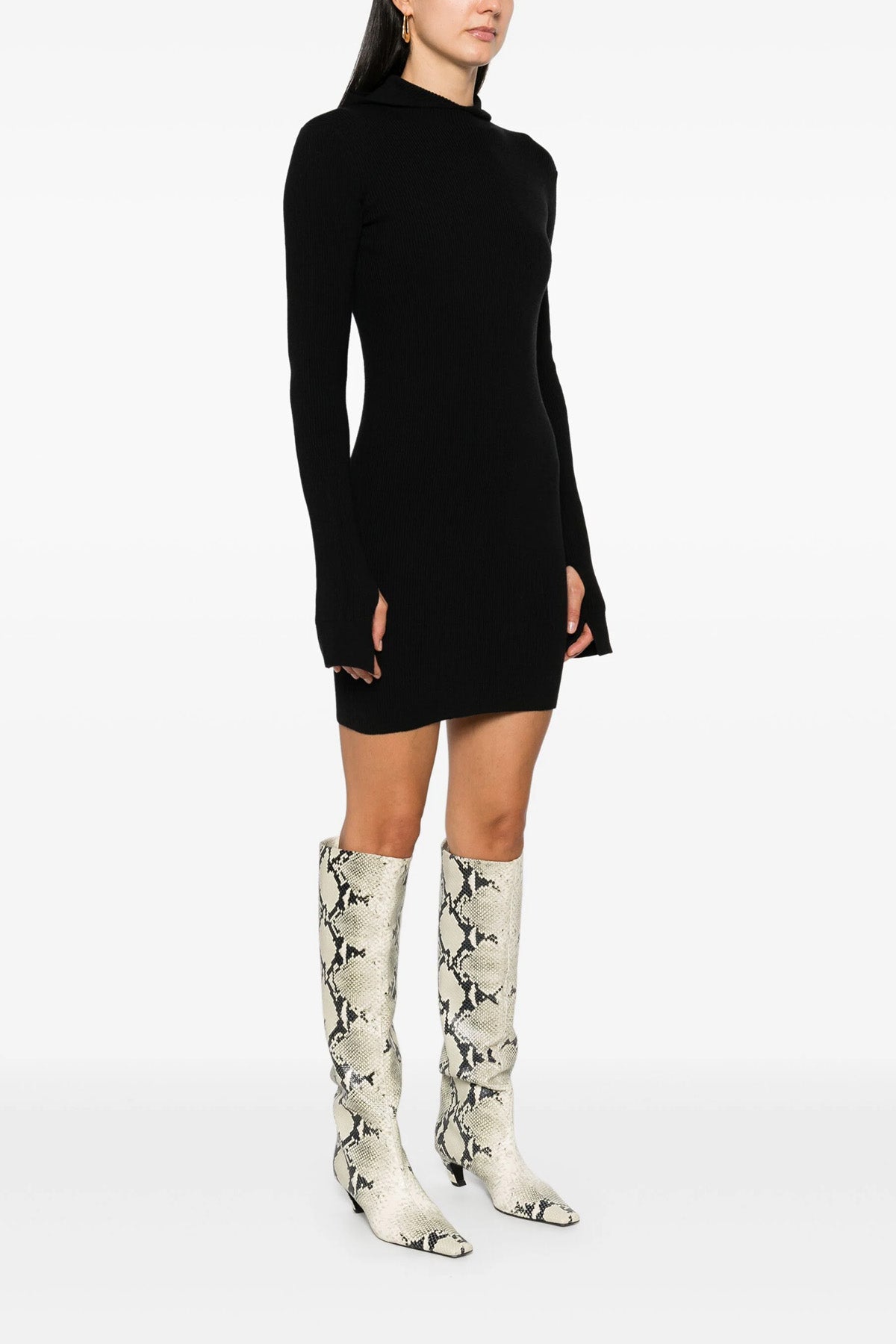 Robe à capuche en laine côtelée et soie, manches longues et fentes.
