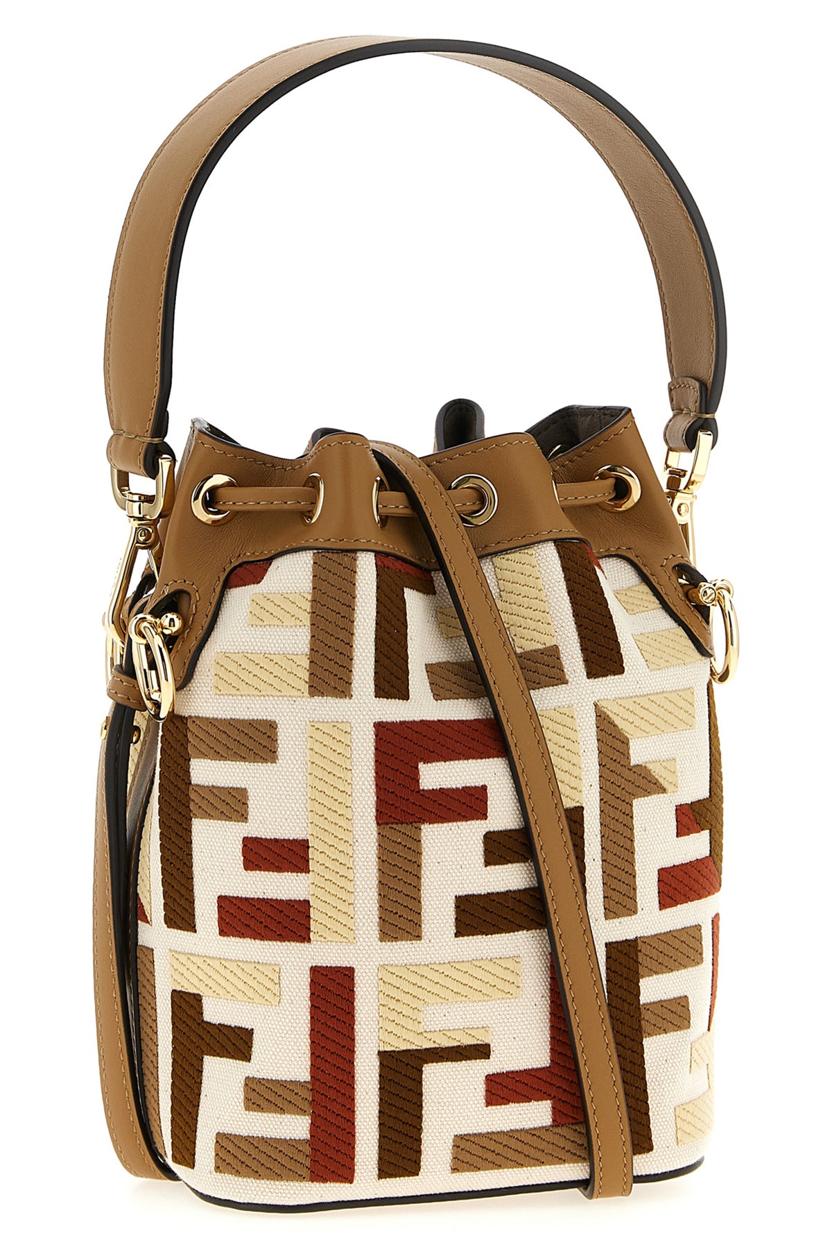 Mon Trésor Mini Bucket Bag en toile de coton avec motif FF iconique en relief, fil multicolore, détails en métal et cuir, fermeture à cordon, poignée amovible, bandoulière amovible.