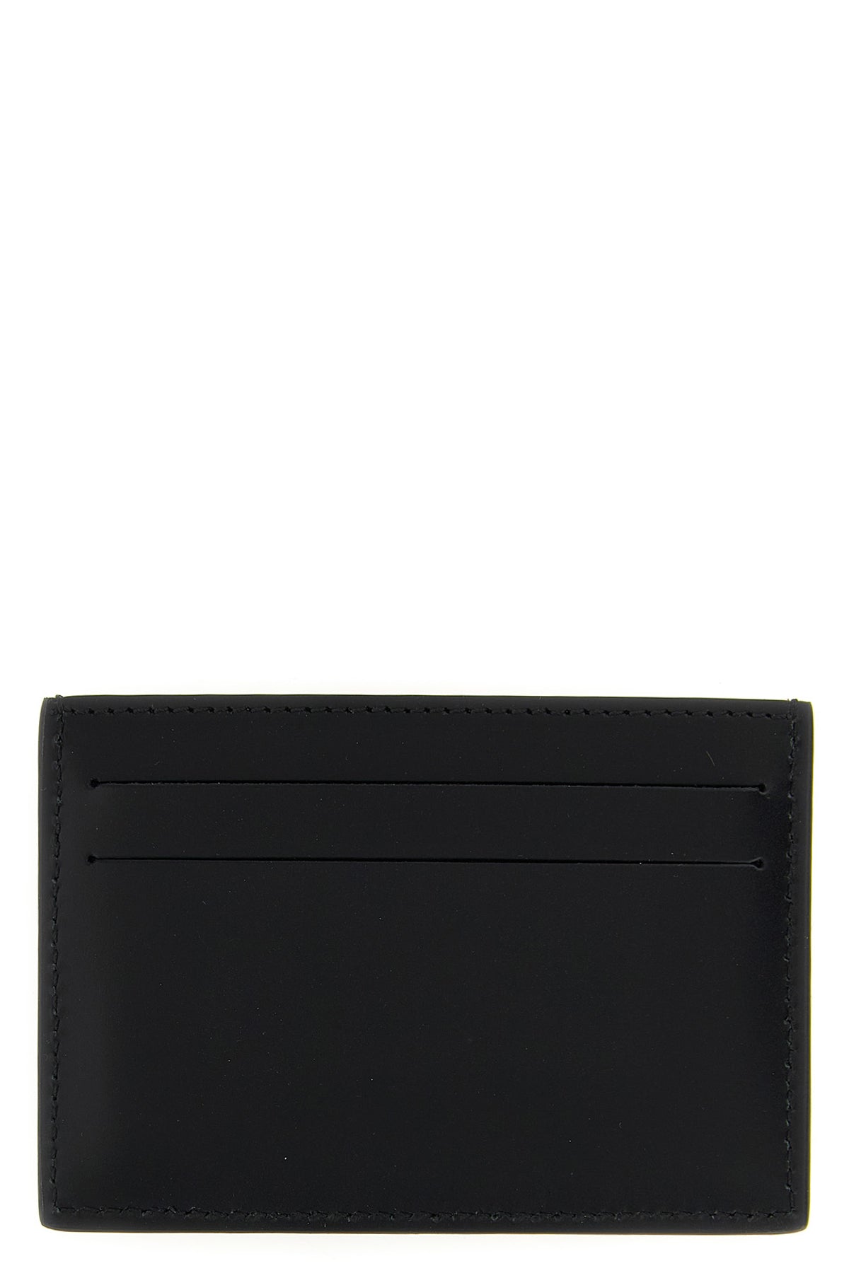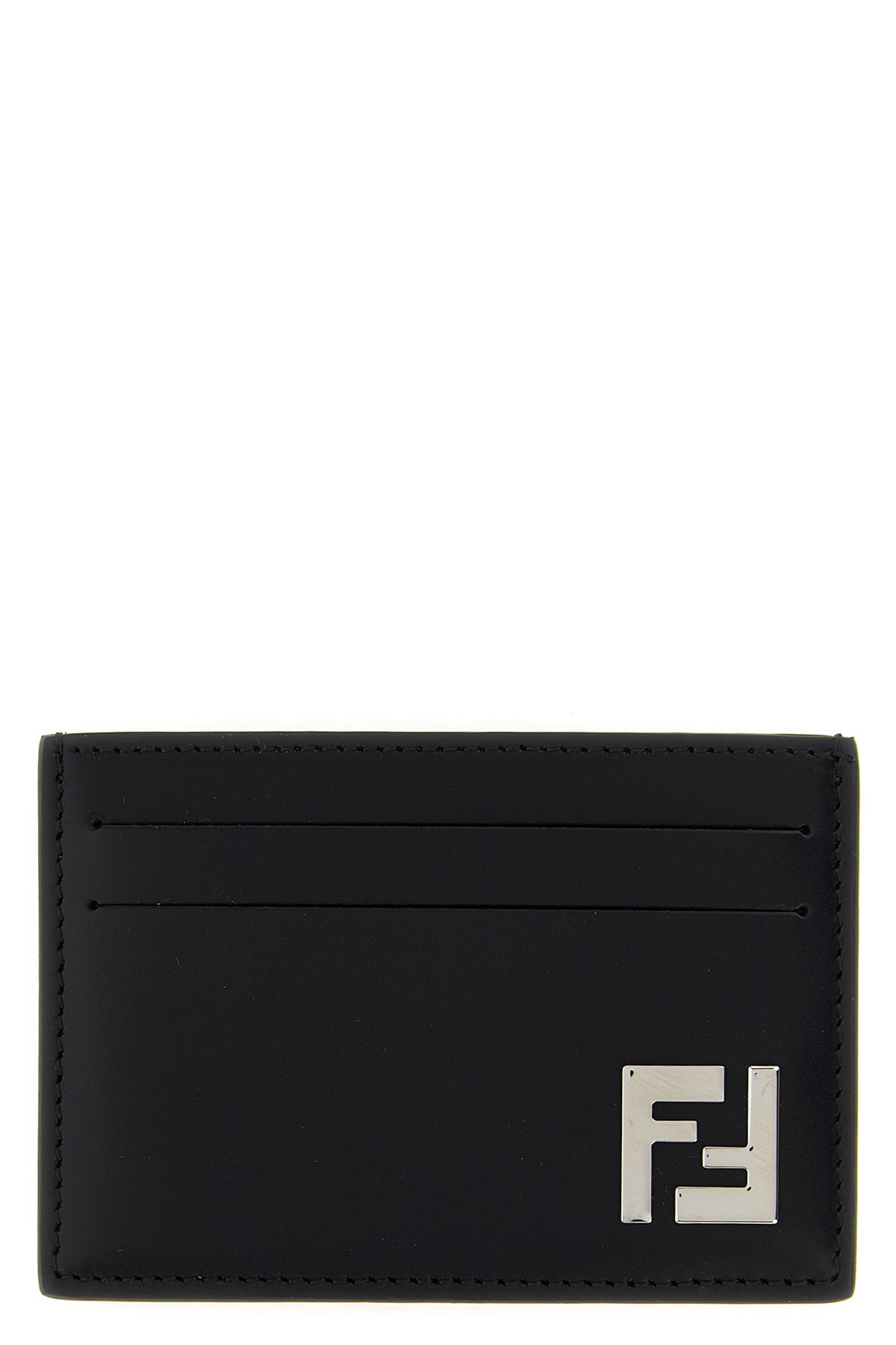 Porte-cartes fin et carré en cuir avec logo métallique sur le devant.