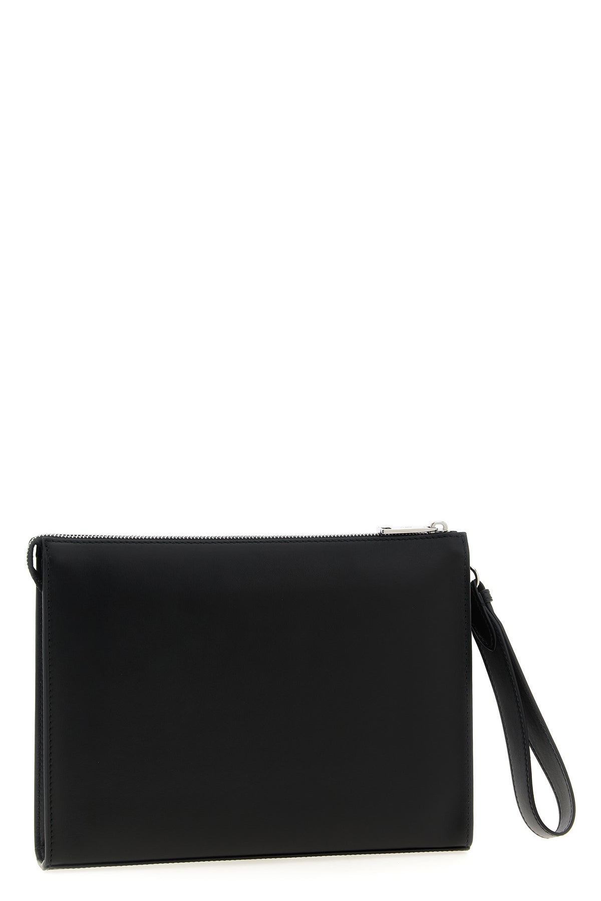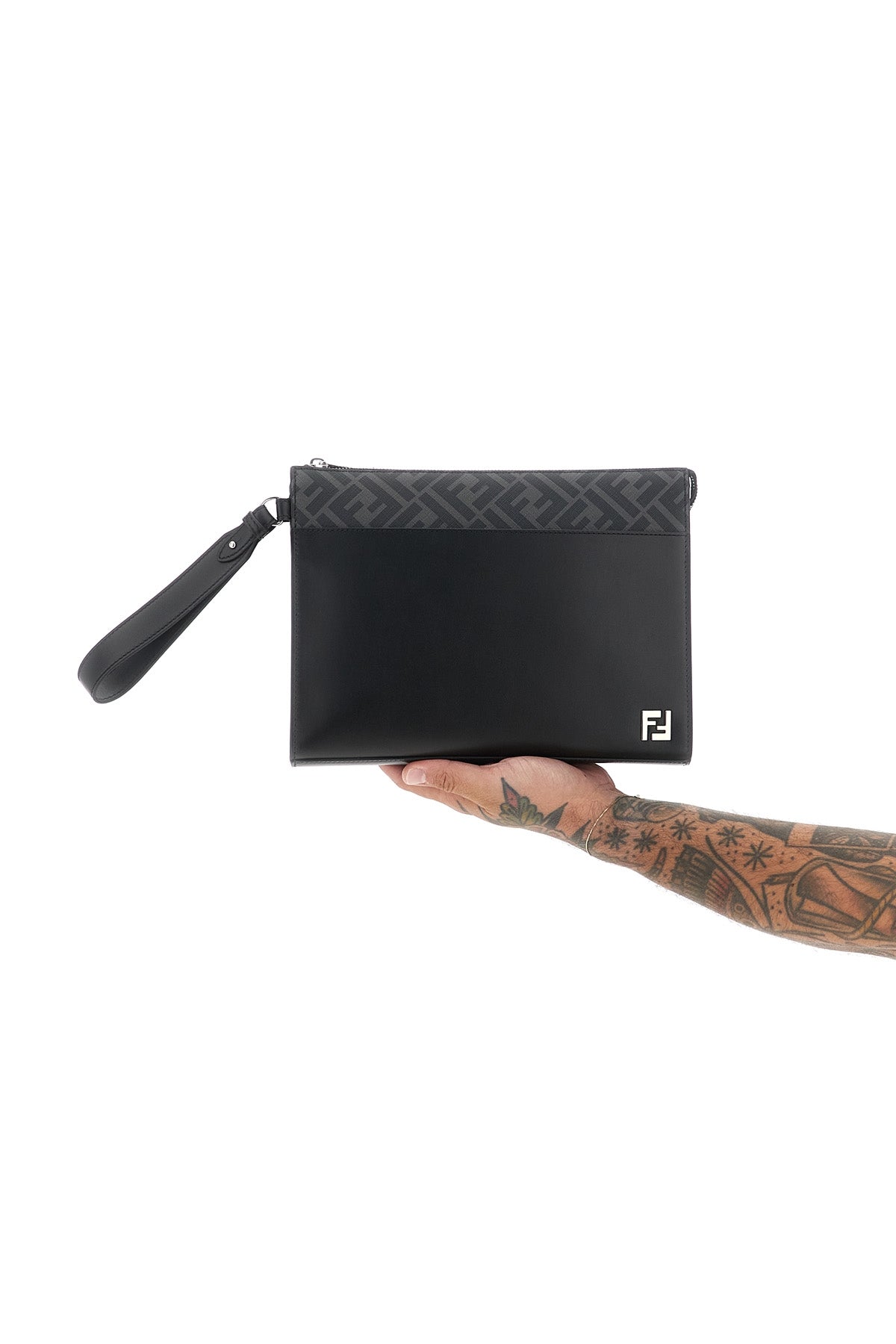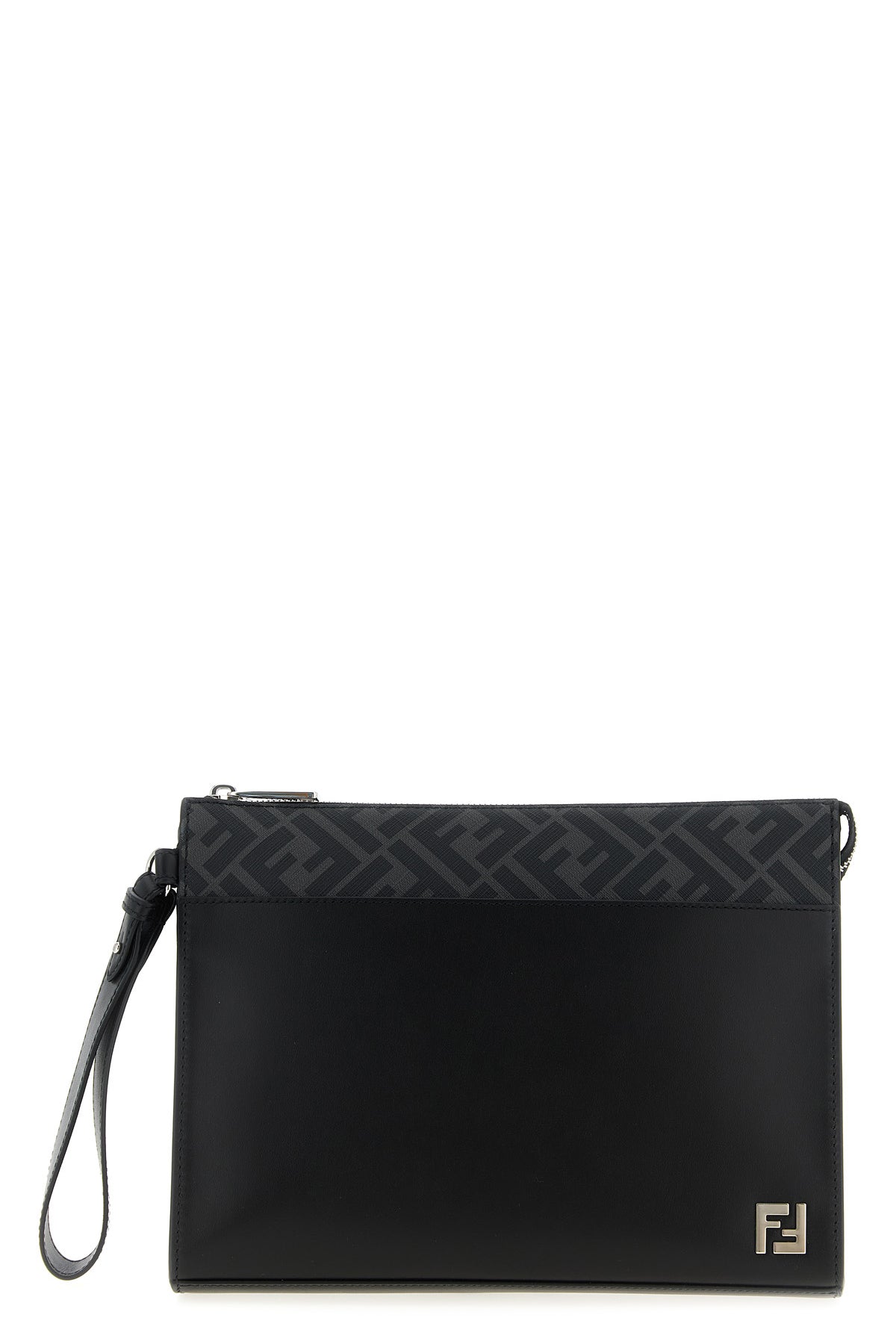 Pochette carrée en cuir lisse et toile Ff, logo métallique sur le devant, fermeture éclair sur le dessus, poignée bracelet amovible.