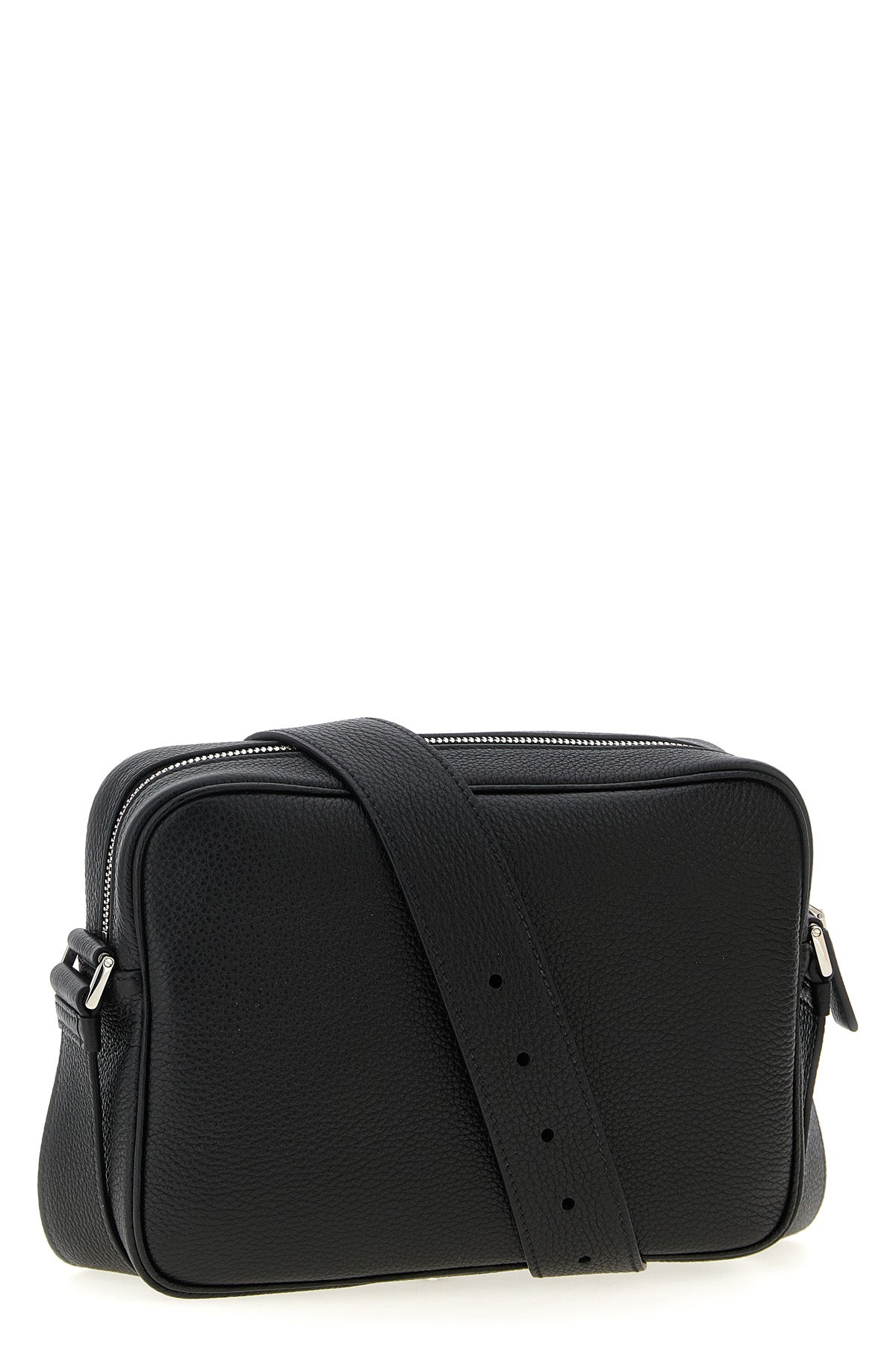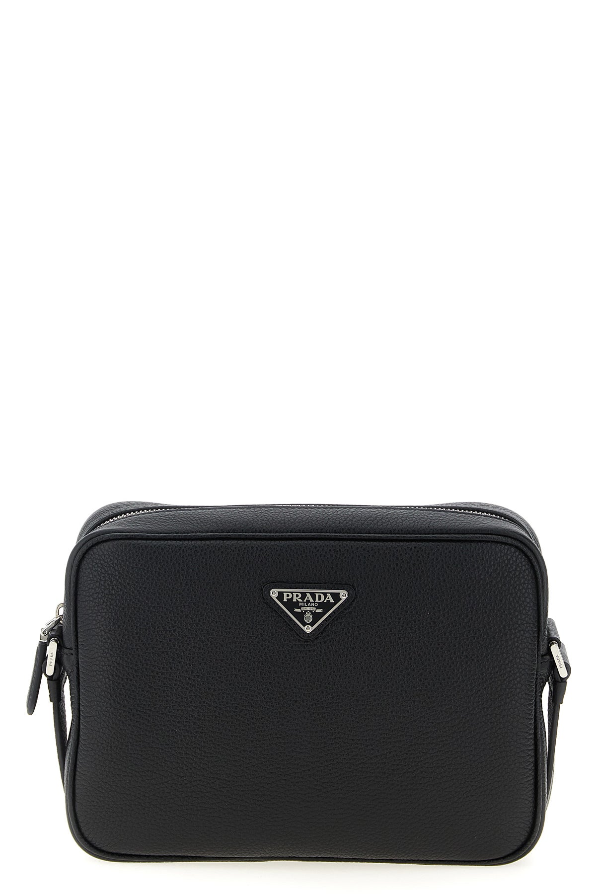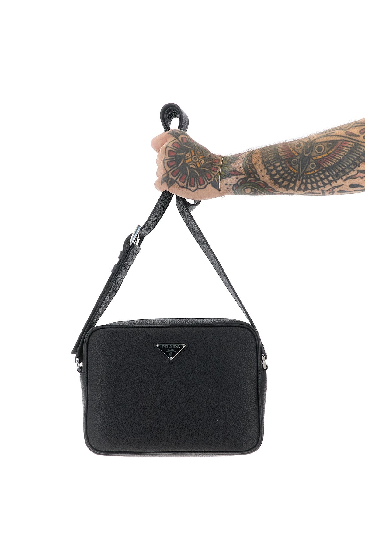 Bandoulière en cuir grenat, logo triangulaire en métal émaillé sur le devant, fermeture éclair sur le dessus, bandoulière réglable.