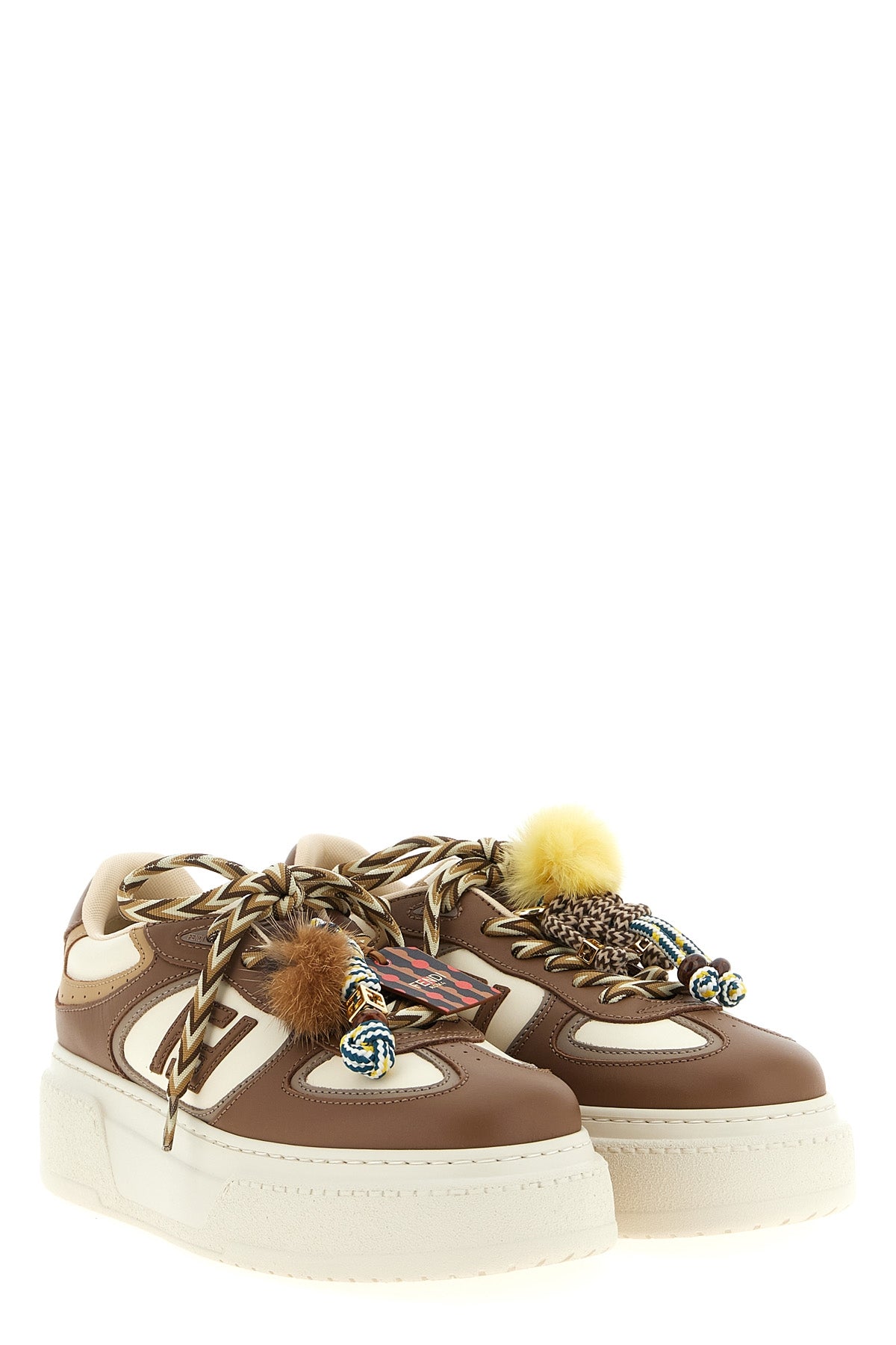 Baskets Fendi Match en cuir, logo embossé au talon et sur la languette, fermeture à lacets avec breloque en corde et doublure amovible en vison, semelle plateforme en caoutchouc avec logo macro embossé à l'arrière.
