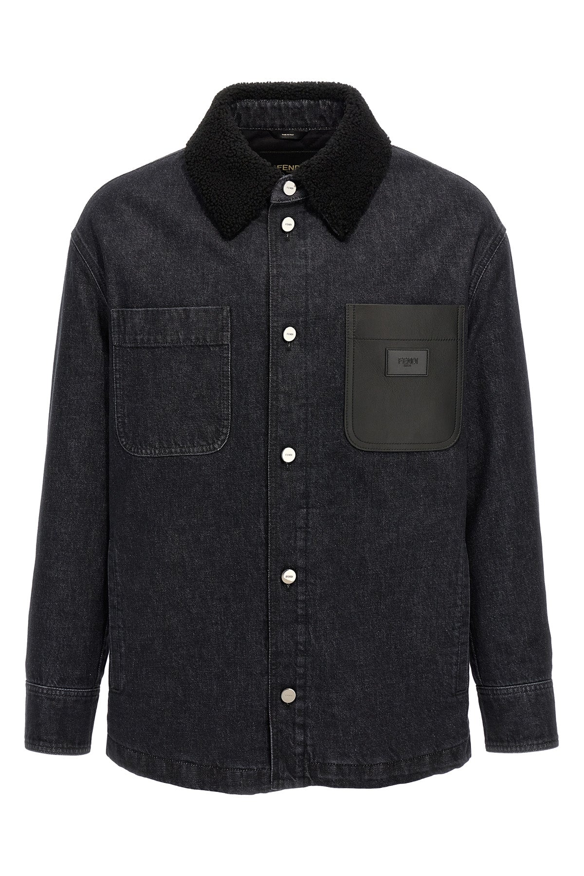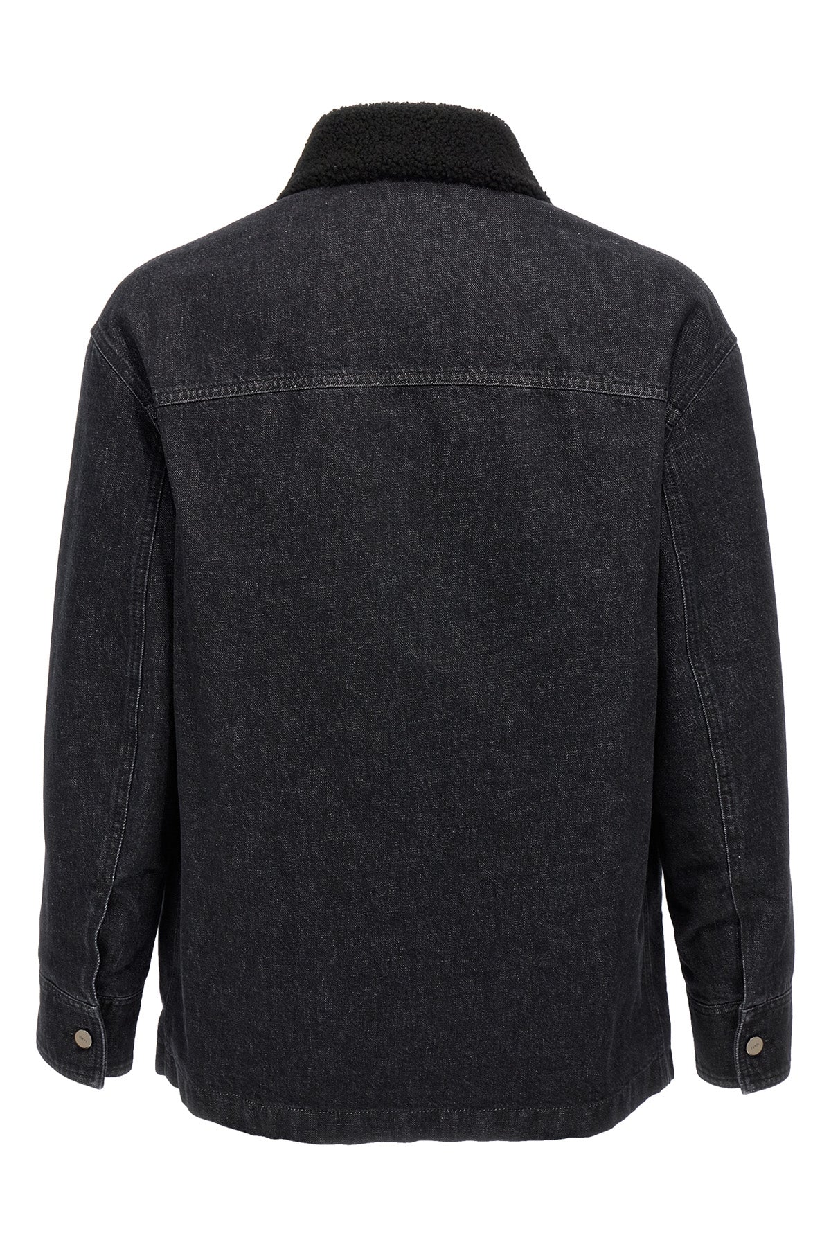 Veste en denim de coton légèrement rembourrée avec col en peau de mouton ton sur ton, poche en cuir avec écusson logo, fermeture boutonnée, poches, manches longues à poignets retroussés.
