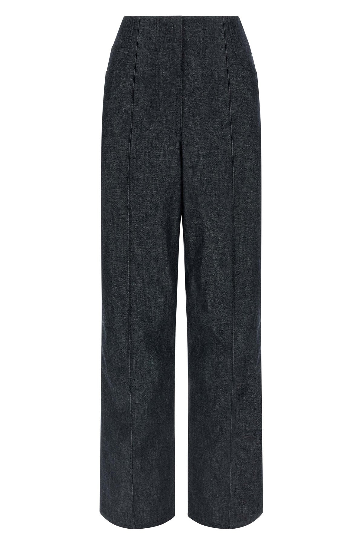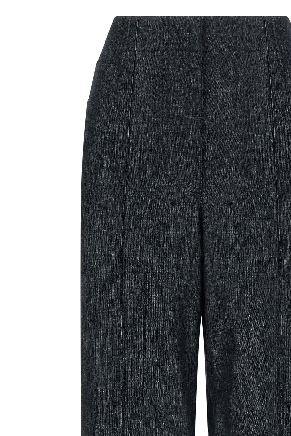 Jean en chambray denim ultra léger, taille haute, jambe large, pli cousu, fermeture éclair et bouton-pression sur le devant, cinq poches, écusson en cuir ' Fendi Roma ' à l'arrière.