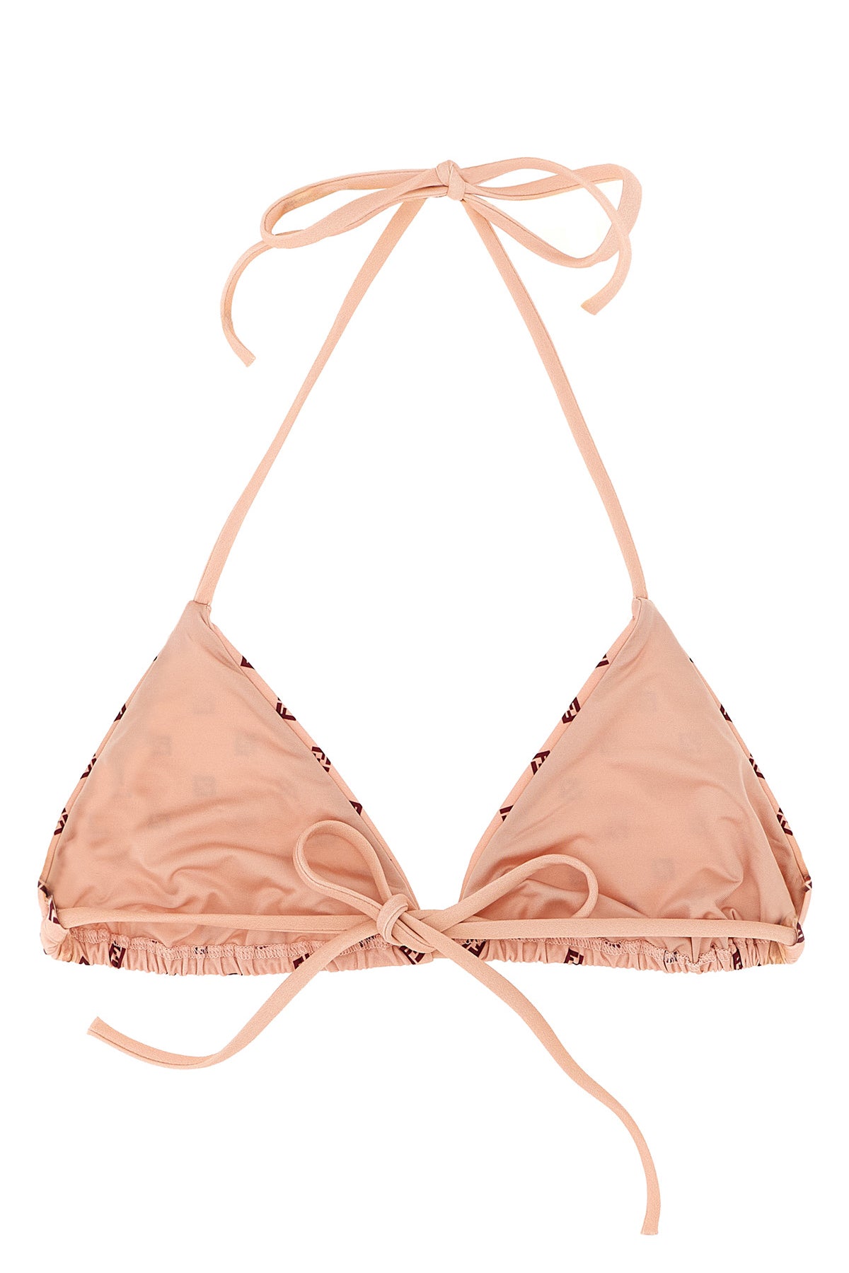 Haut de bikini en Lycra® avec imprimé micro-patchwork reproduisant un mélange de logos et de motifs d'archives, modèle triangle, fermeture à lacets réglables.