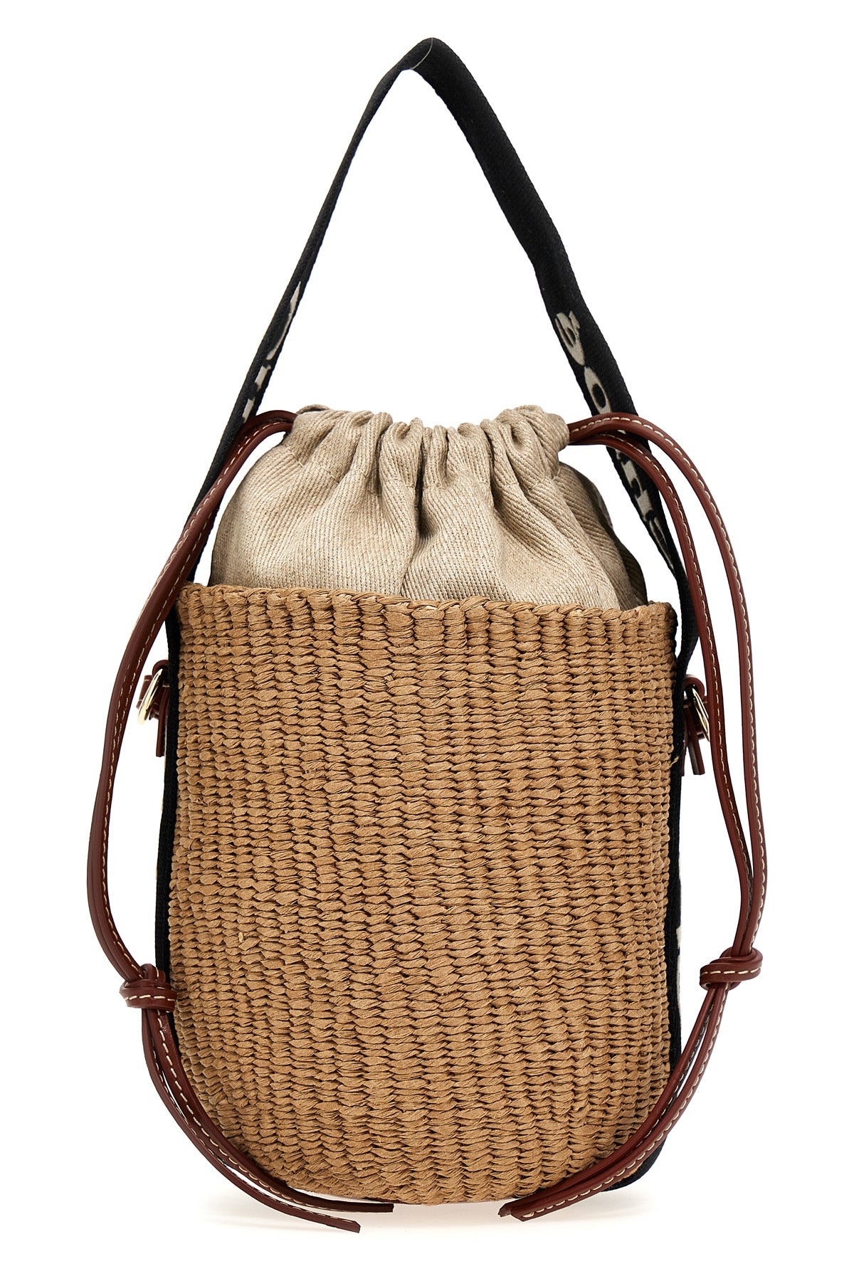 Sac seau en papier tressé Woody, petit modèle, avec détails en cuir, ruban brodé du logo, fermeture à cordon et bandoulière en cuir.