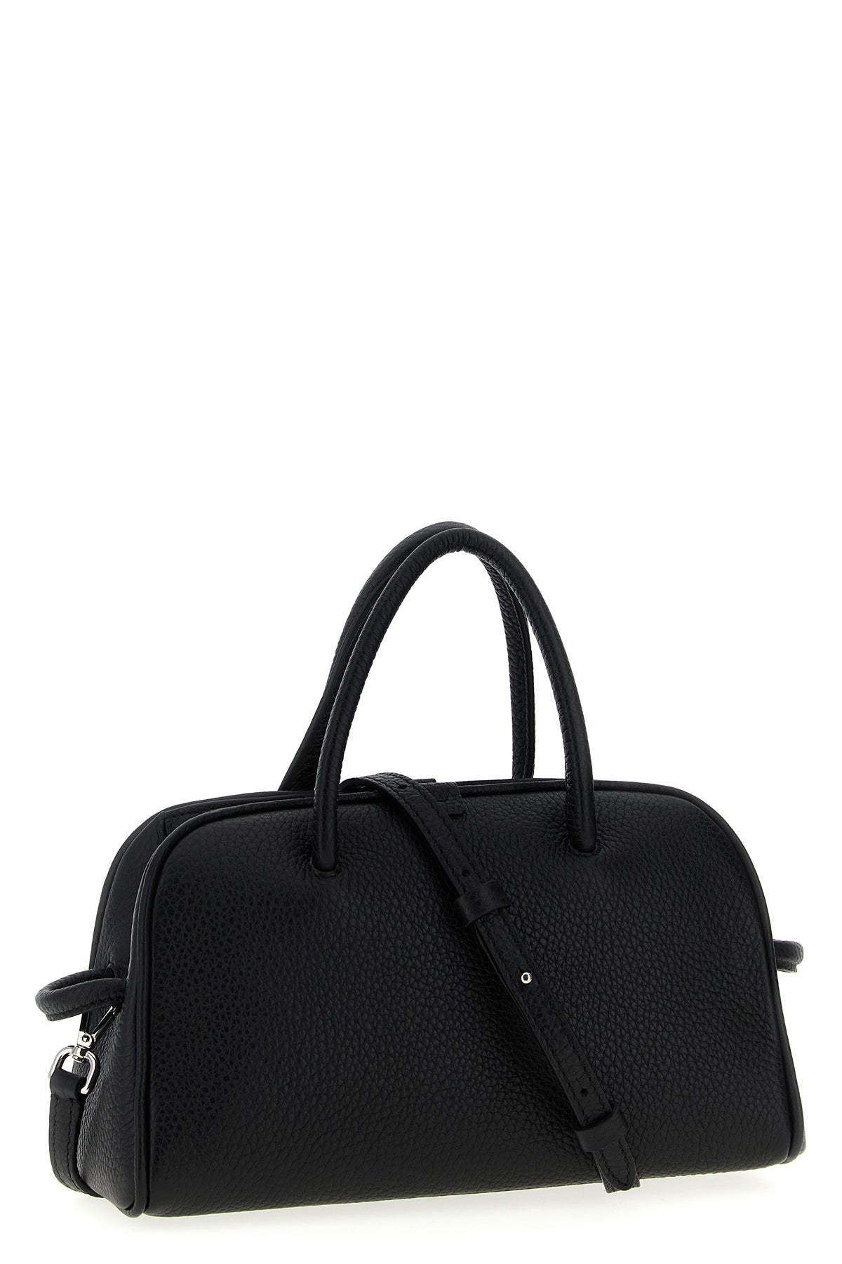 Sac bowling Le Petit Turismo en cuir martelé, orné du logo embossé sur le devant, d'une double anse fixe avec nœud ton sur ton, d'une fermeture zippée sur le dessus et d'une bandoulière ajustable et amovible.