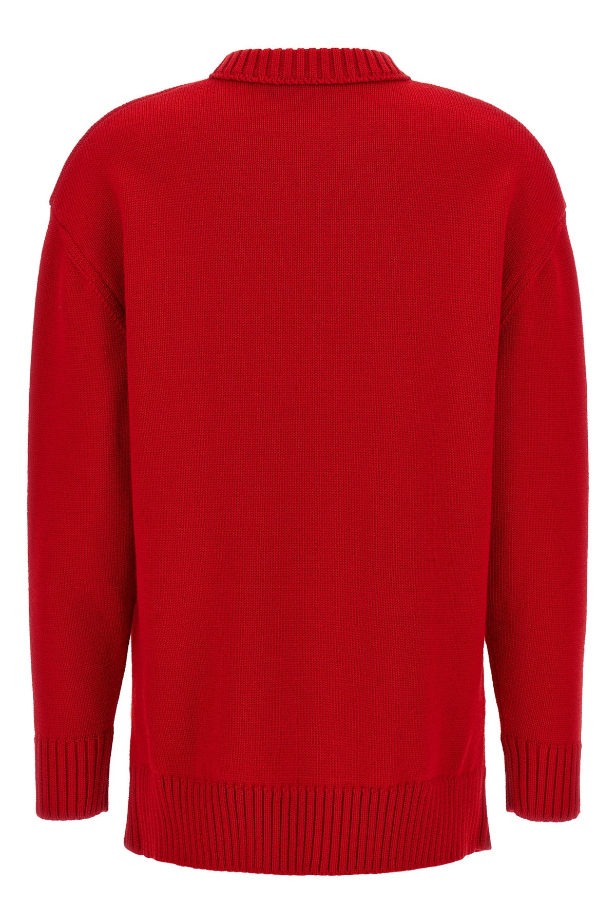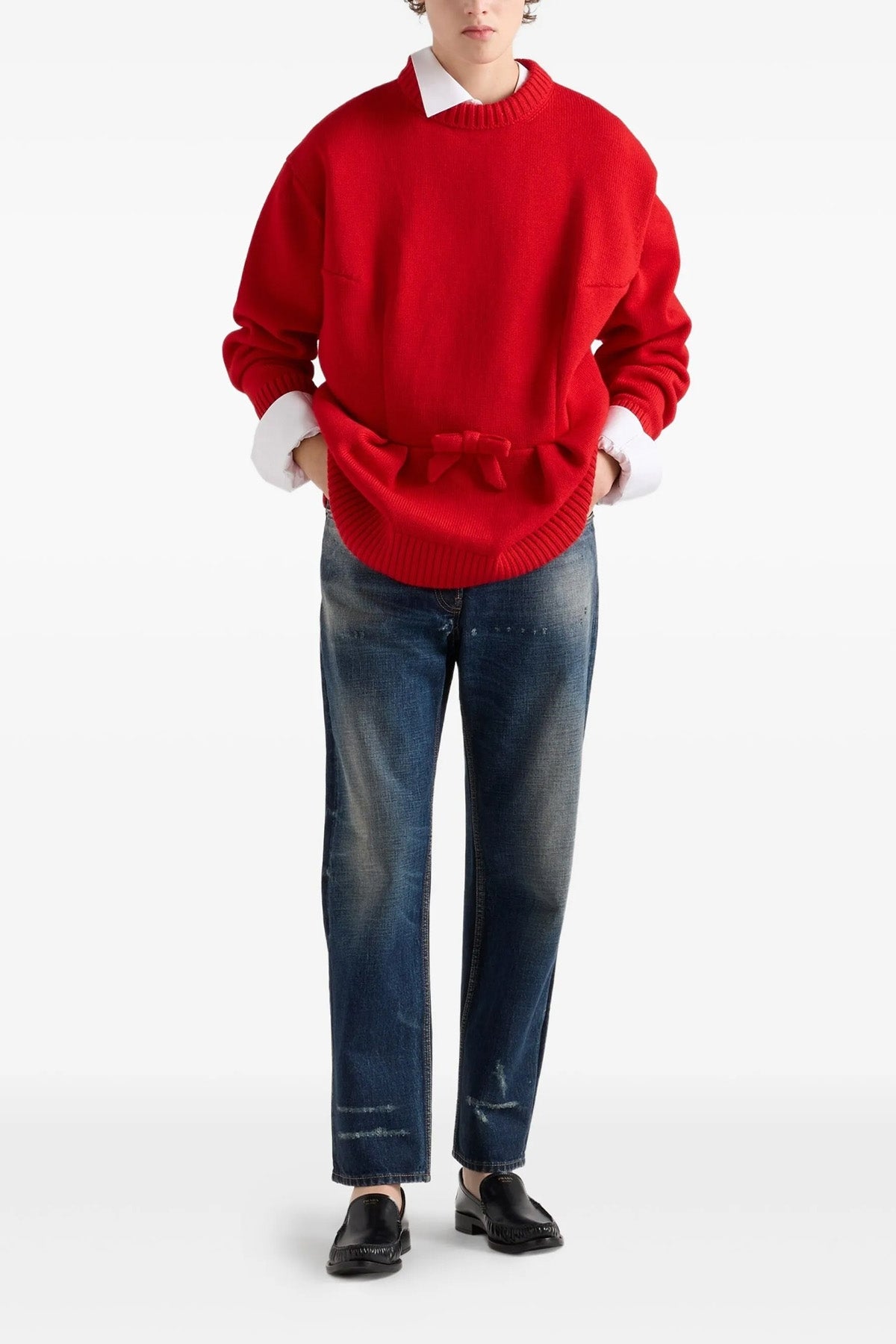 Pull en laine vierge avec nœud papillon et plis sur le devant, col rond, manches longues à poignets boutonnés et épaules tombantes.