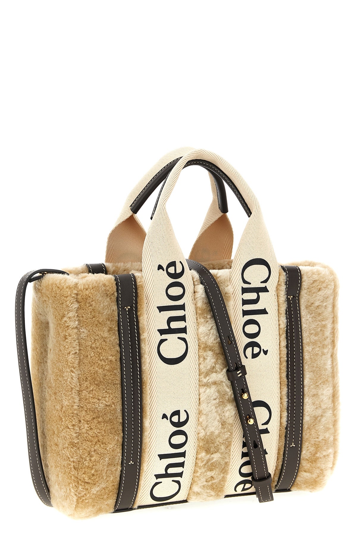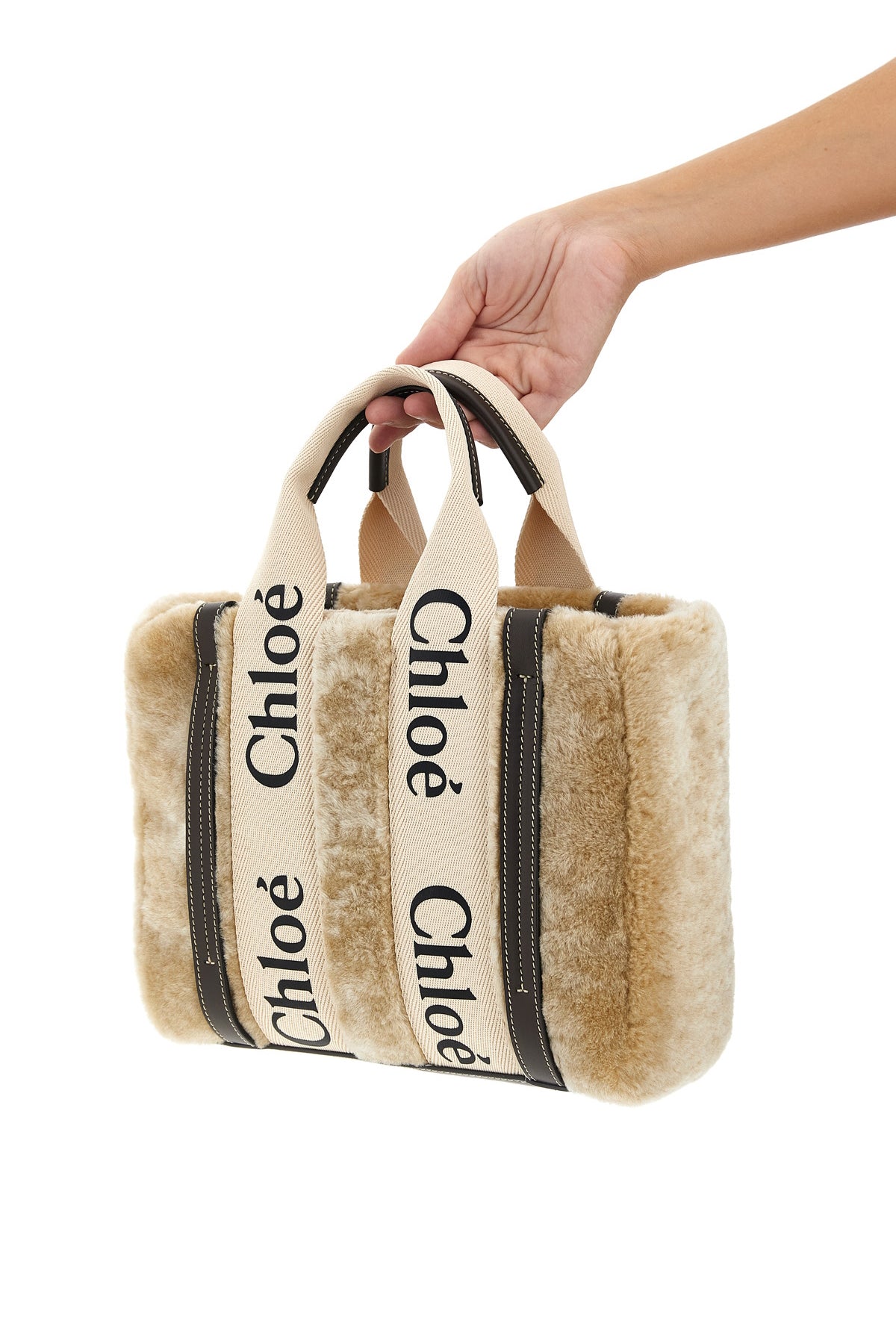 Petit sac à main ' Woody ' en peau lainée avec détails en cuir contrastants, double poignée fixe en toile de coton jacquard avec logo surdimensionné, bandoulière réglable et amovible.