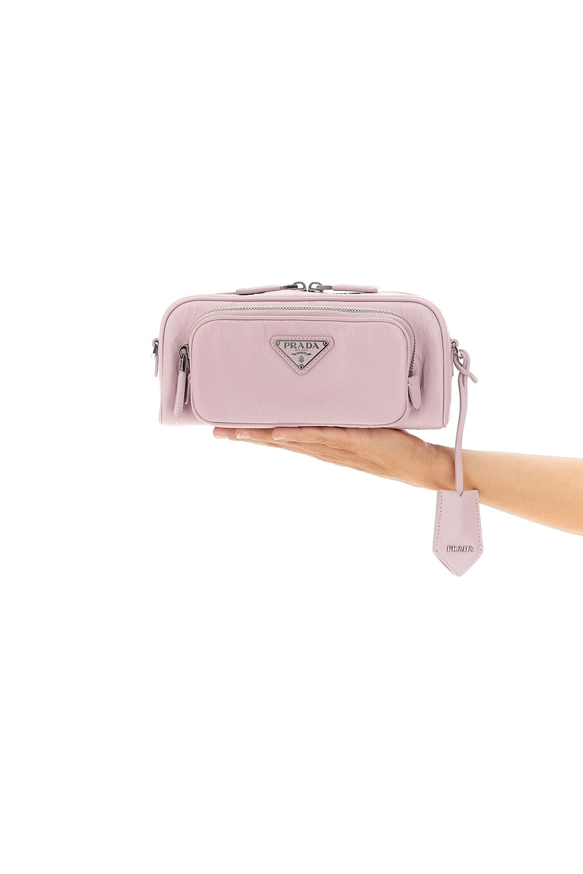 Sac bandoulière en cuir nappa antique avec logo triangulaire en métal émaillé, fermeture éclair, poche extérieure zippée, bandoulière réglable et amovible et étiquette logo en cuir.