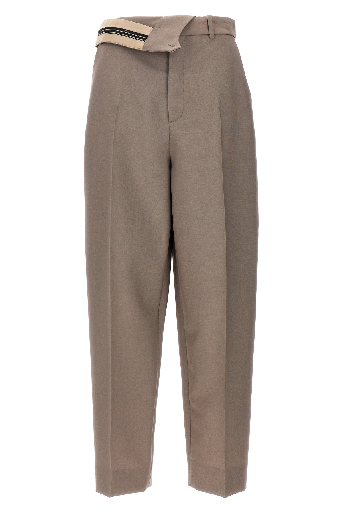 Pantalon en laine mélangée mohair, coupe carotte, taille asymétrique, fermeture éclair et crochet.