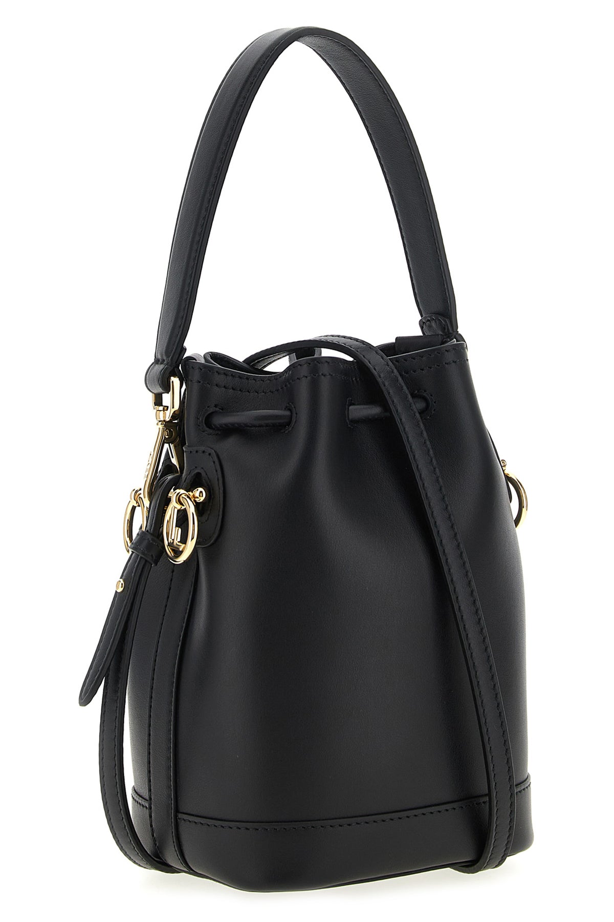 Sac seau Mini Mon Trésor en cuir de veau, logo lettré sur le devant et détails métalliques finition dorée, fermeture à cordon, poignée amovible, bandoulière amovible.
