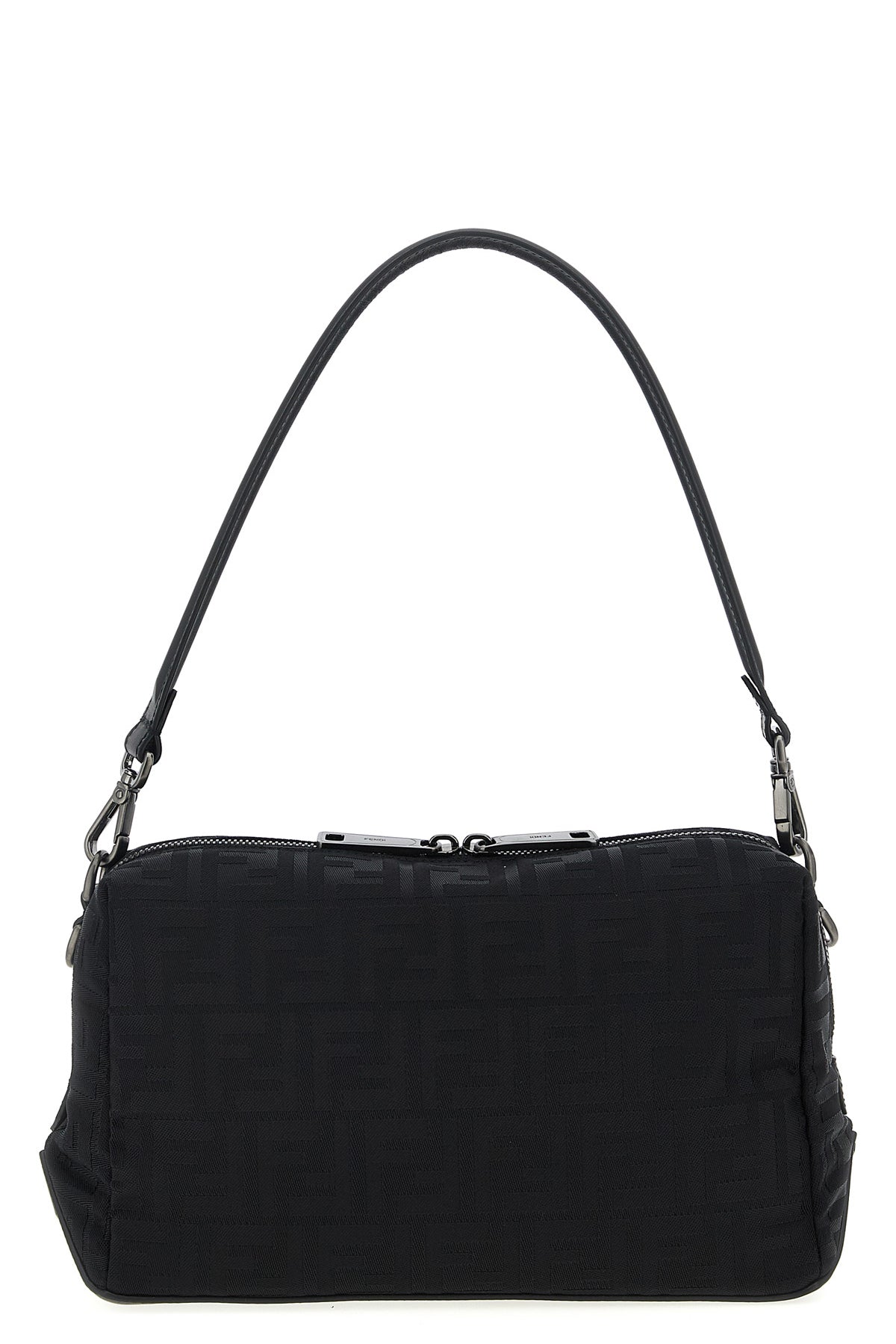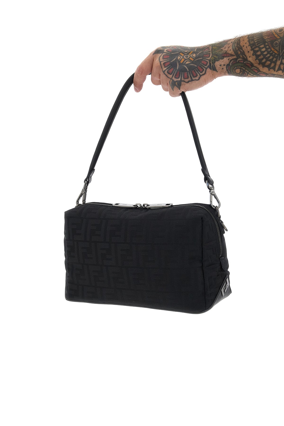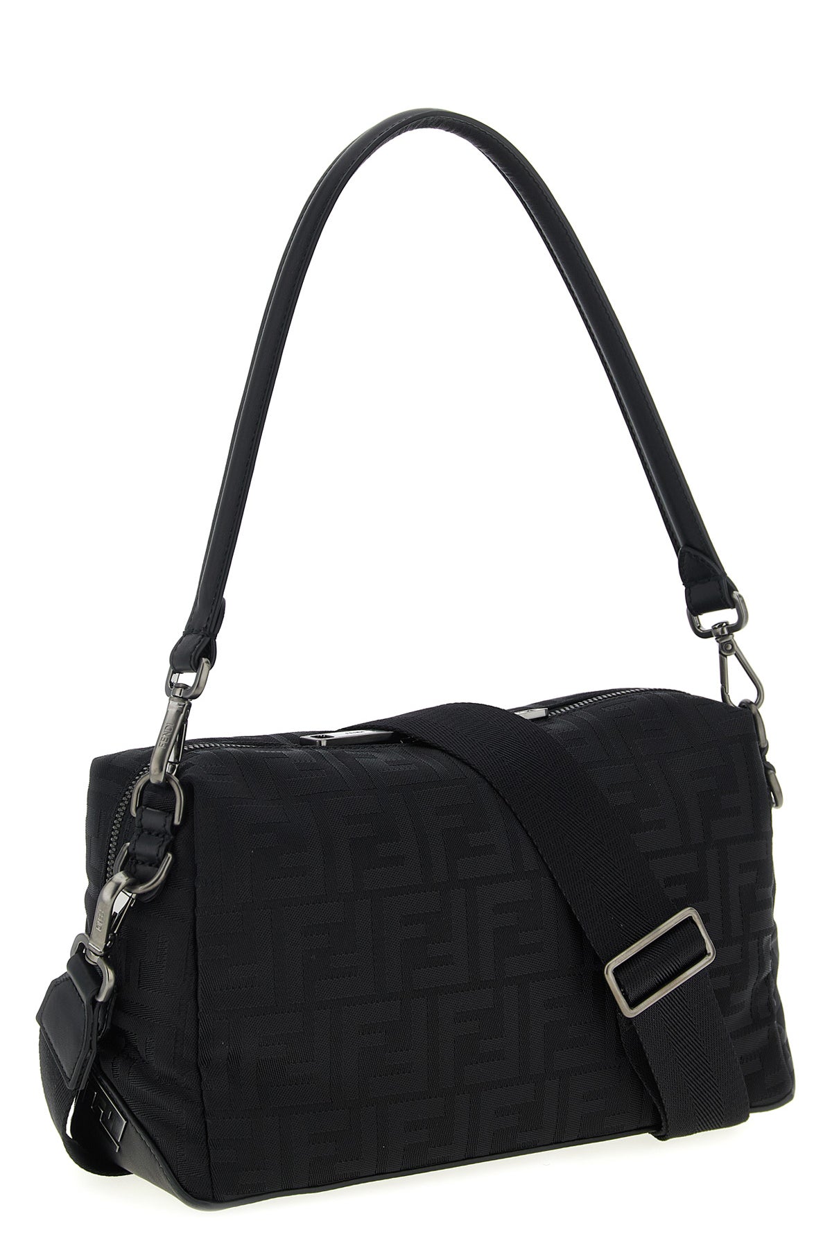 Sac bandoulière Fendi Lui Medium Squared en nylon rembourré avec base et poignée en cuir de veau lisse ton sur ton, logo métallique avec finition ruthénium satiné sur les côtés, fermeture éclair sur le dessus, poignée amovible, bandoulière réglable et amovible.