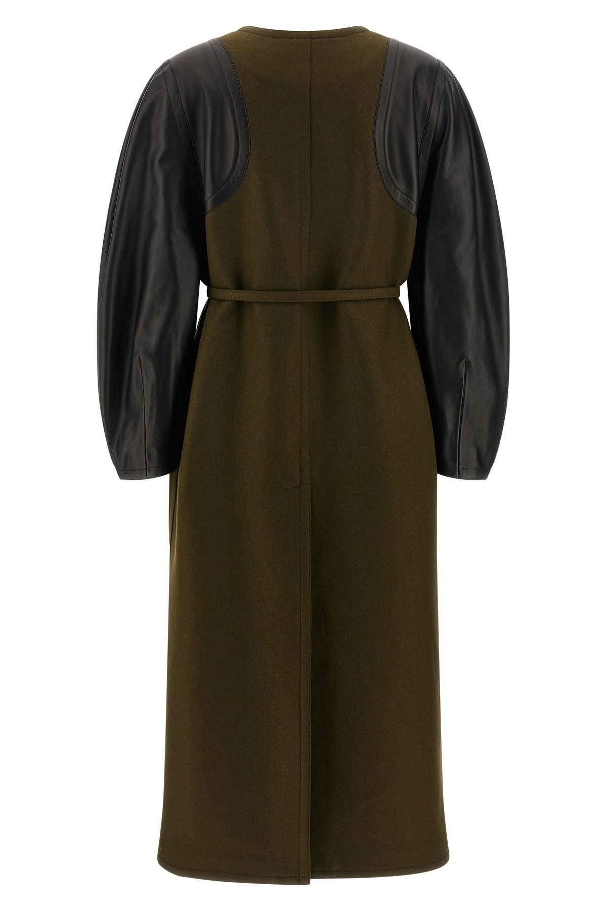 Manteau en feutre de laine à col rond avec fermeture boutonnée dissimulée sur le devant, manches longues en cuir, poches latérales, mini ceinture à la taille avec logo ajustable et amovible.