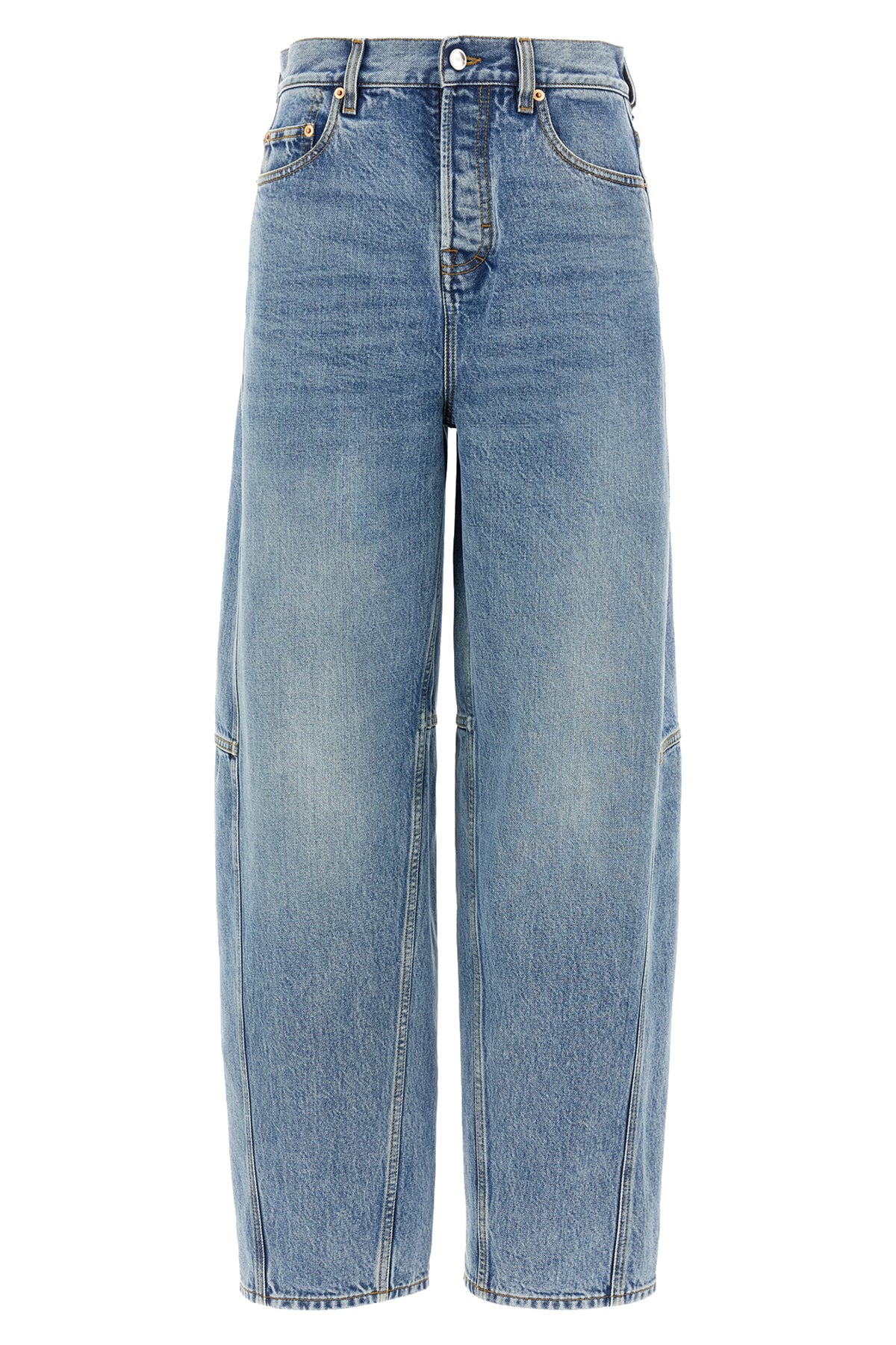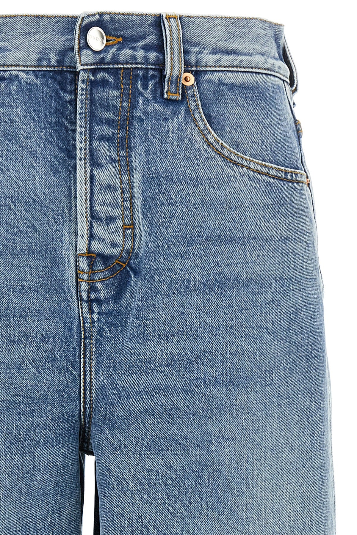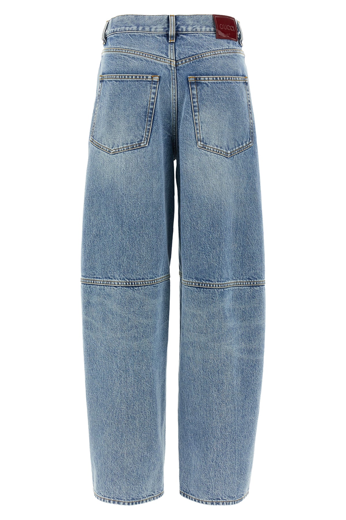 Jean Ballon en denim de coton délavé à la pierre, taille mi-haute, fermeture boutonnée sur le devant, cinq poches, jambes larges, étiquette logo Naplak ' Gucci Rosso Ancora ' à l'arrière.