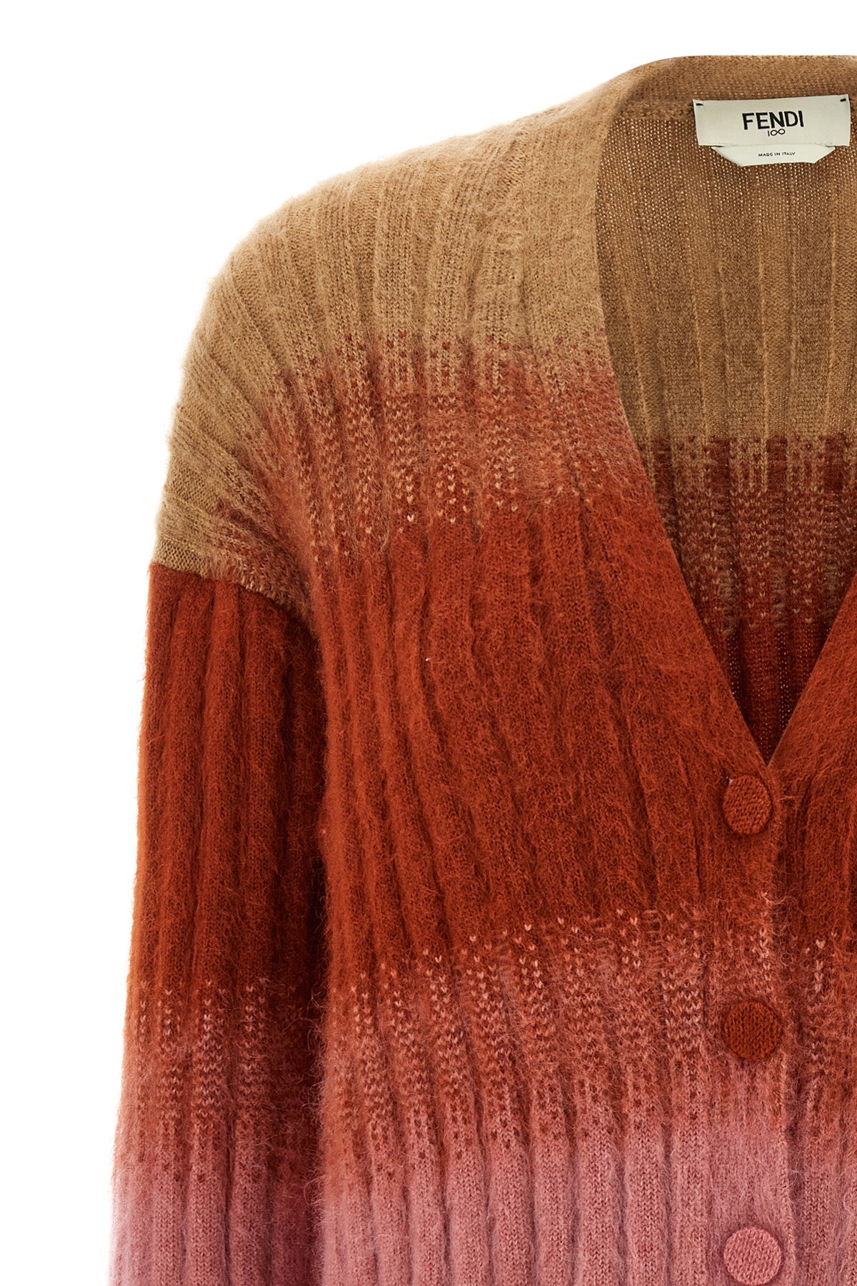 Gilet en maille côtelée Vanisé, mélange de mohair et de laine, motif dégradé, col en V, fermeture boutonnée sur le devant, poches, manches longues à épaules tombantes.