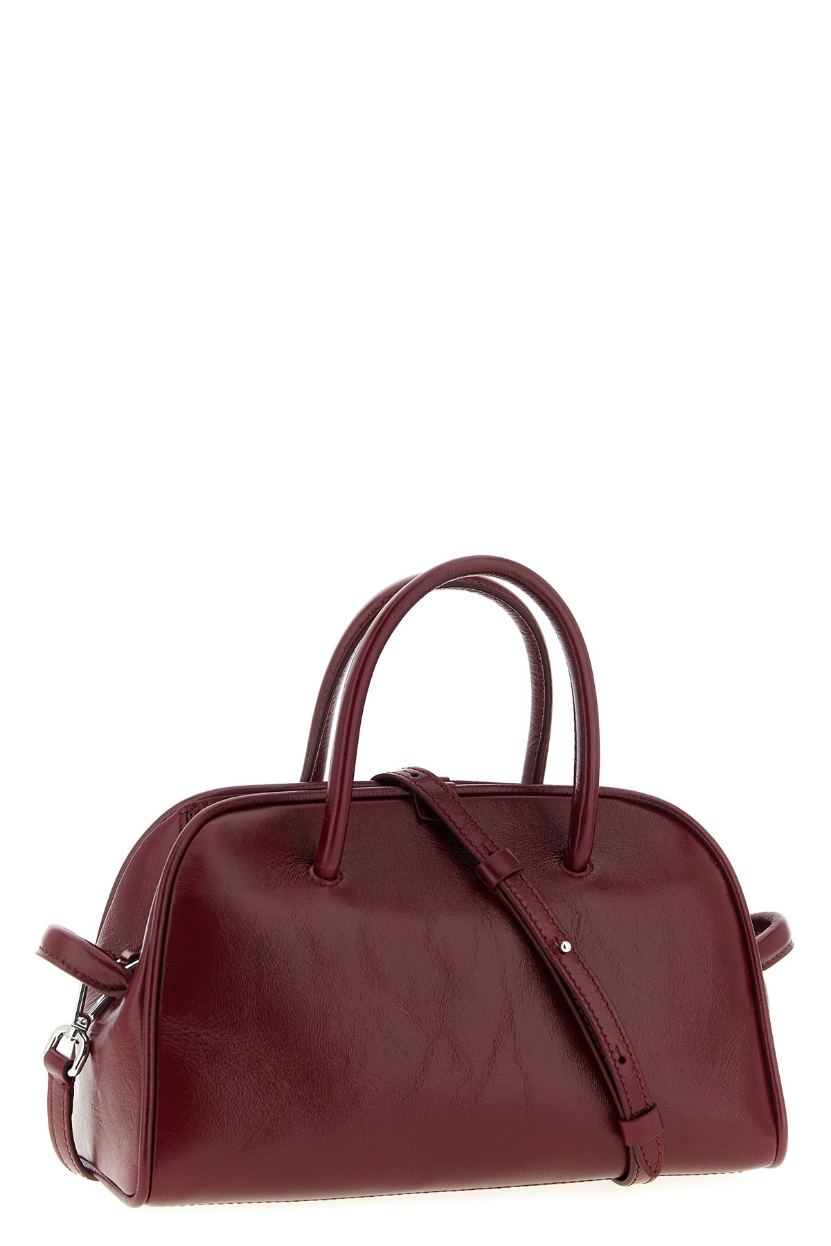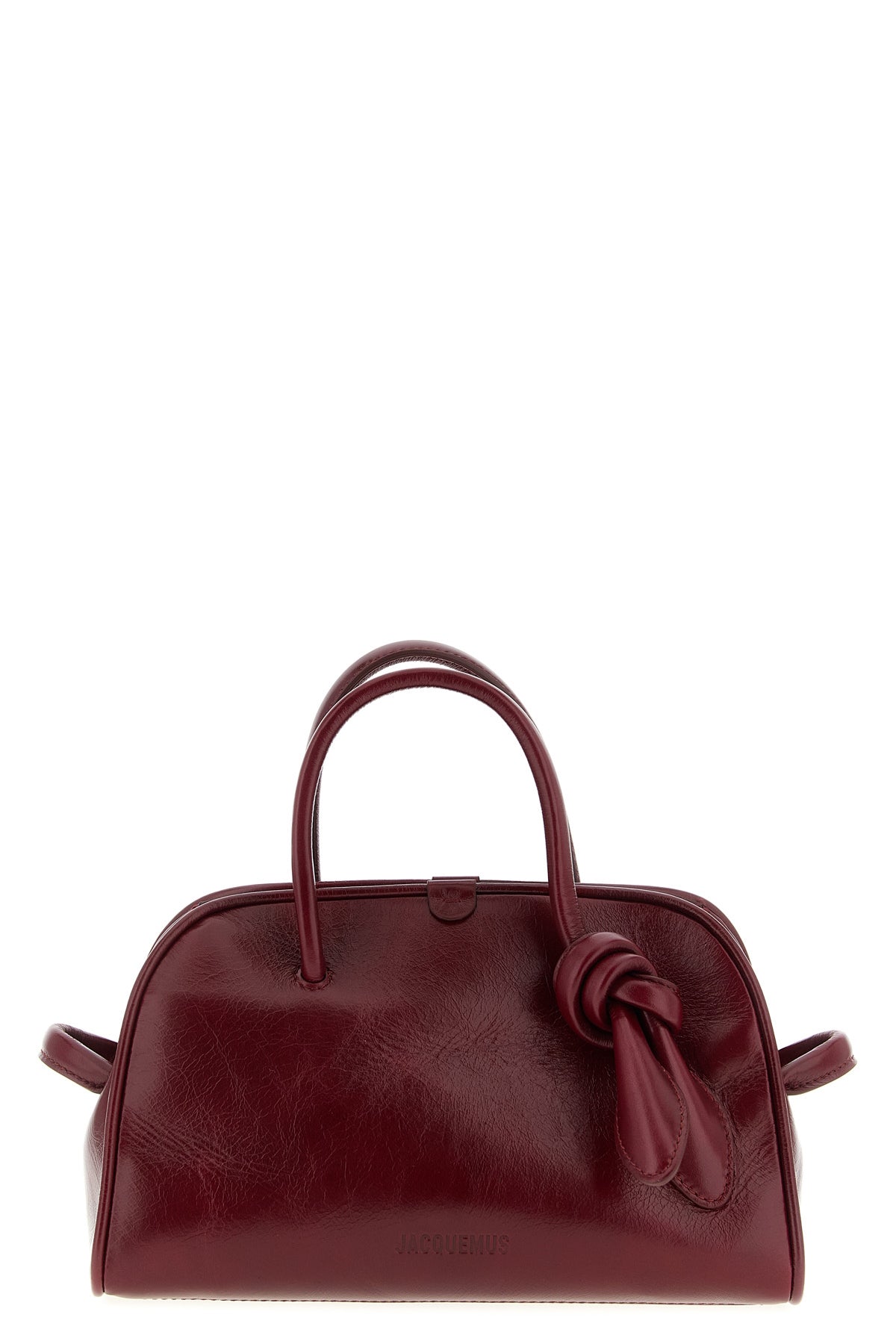 Sac bowling Le Petit Turismo en cuir brillant à l'aspect vintage, logo embossé sur le devant, double anse fixe ornée d'un nœud ton sur ton, fermeture zippée sur le dessus et bandoulière ajustable et amovible.