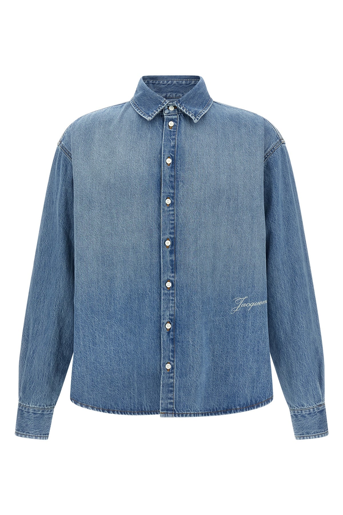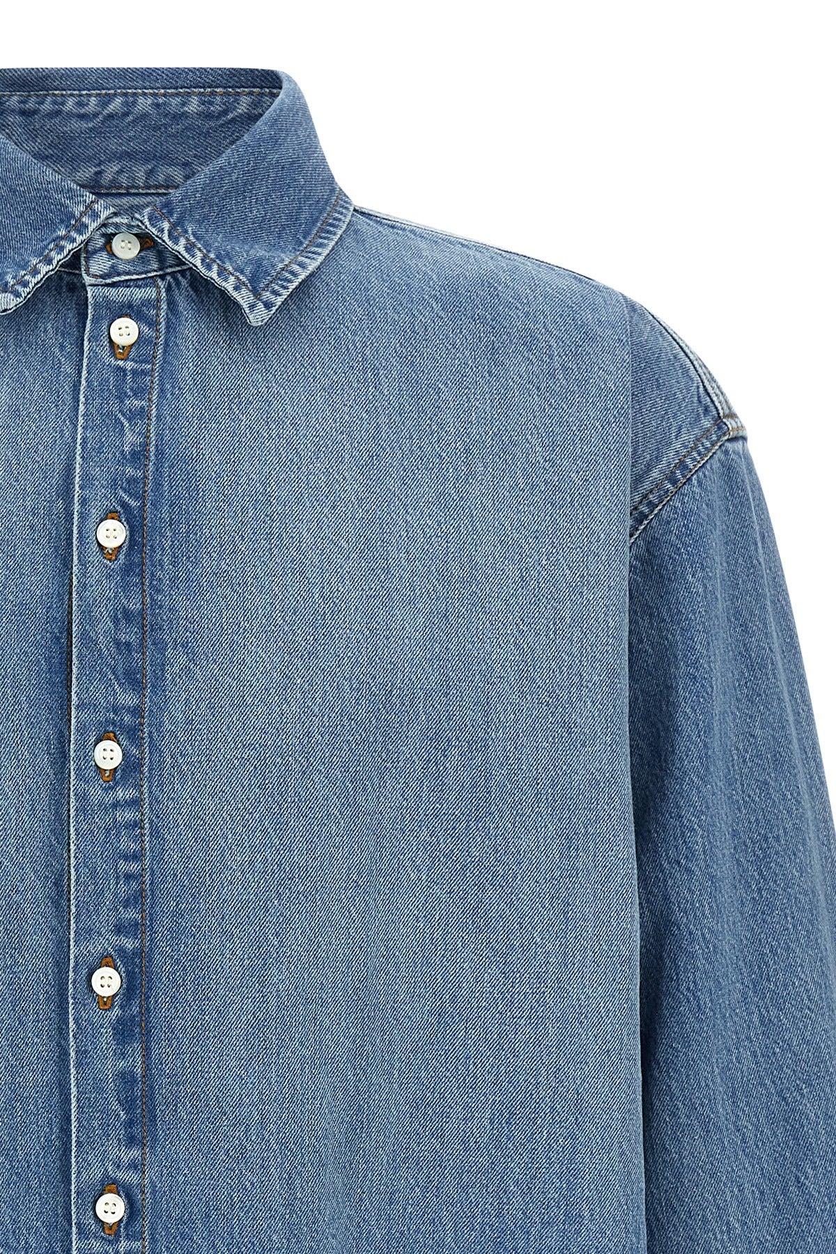 Chemise de Nîmes Simon' en denim de coton lavé avec surpiqûres contrastées, logo intarsia et fermeture boutonnée sur le devant, manches longues avec poignets et épaules tombantes, ourlet asymétrique.
