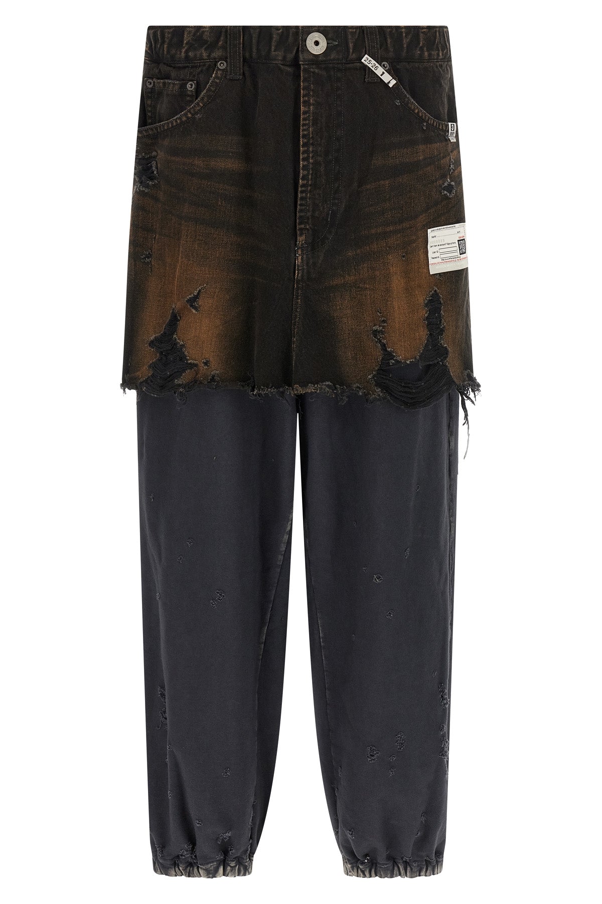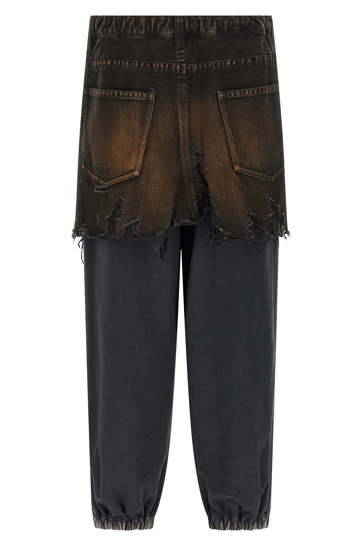 Pantalon en denim superposé à la taille, en coton à effet usé avec empiècement en denim de coton délavé à la pierre et déchirures superposées, ceinture élastique à cordon de serrage, écusson logo, fermeture éclair et bouton sur le devant, jambes larges, poches, ourlets élastiques aux chevilles.