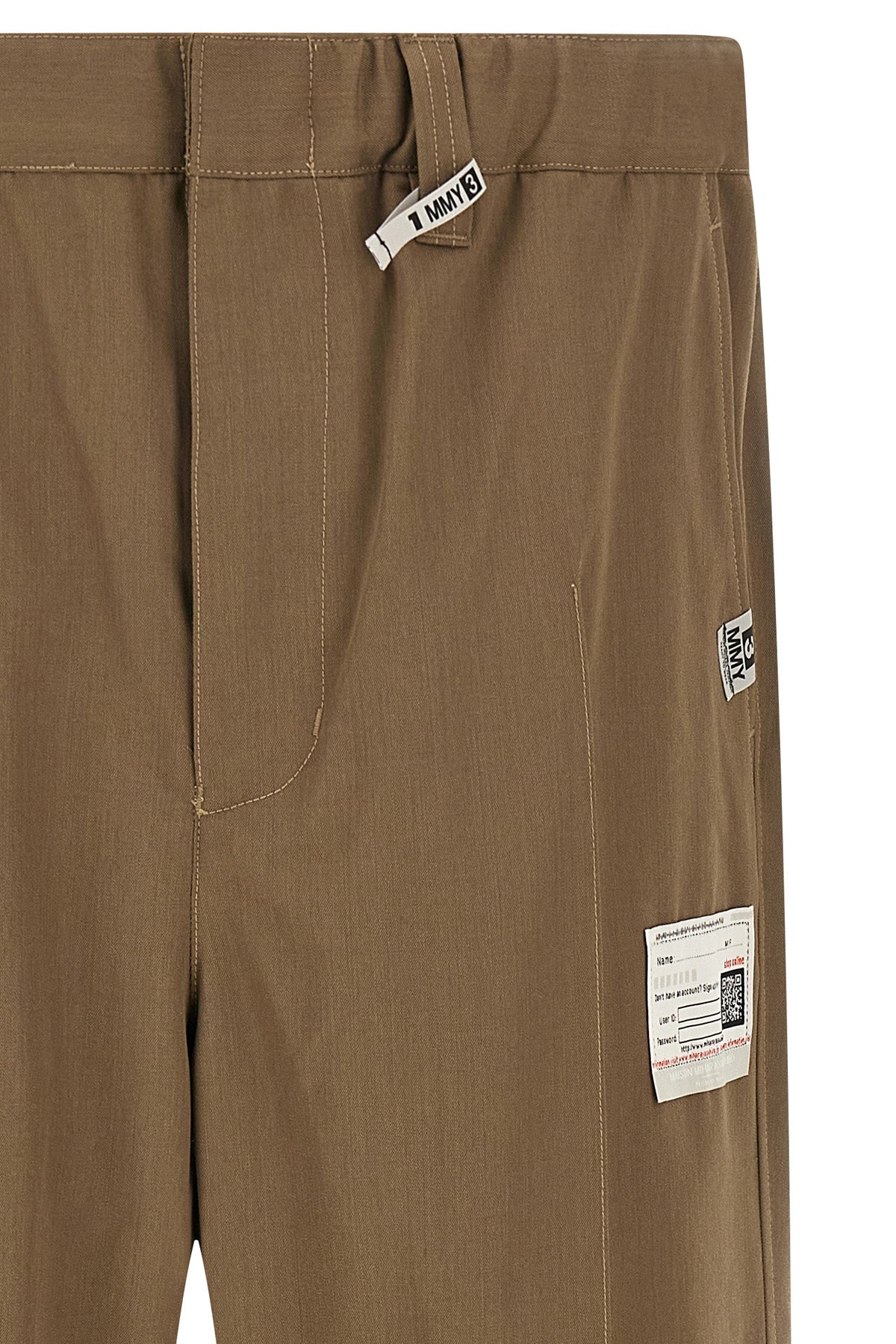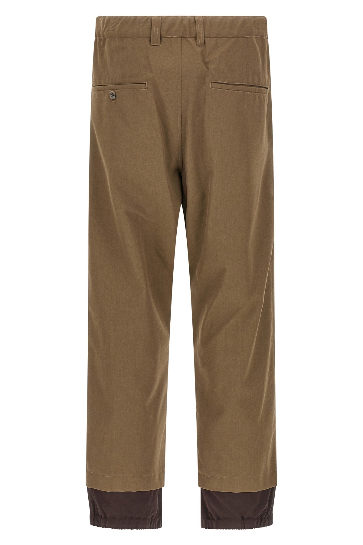 Pantalon en gabardine de laine mélangée, taille élastiquée, fermeture zippée et boutonnée, écusson logo et surpiqûres sur le devant, poches, empiècement contrastant en coton et rayonne aux chevilles avec poignets élastiqués.