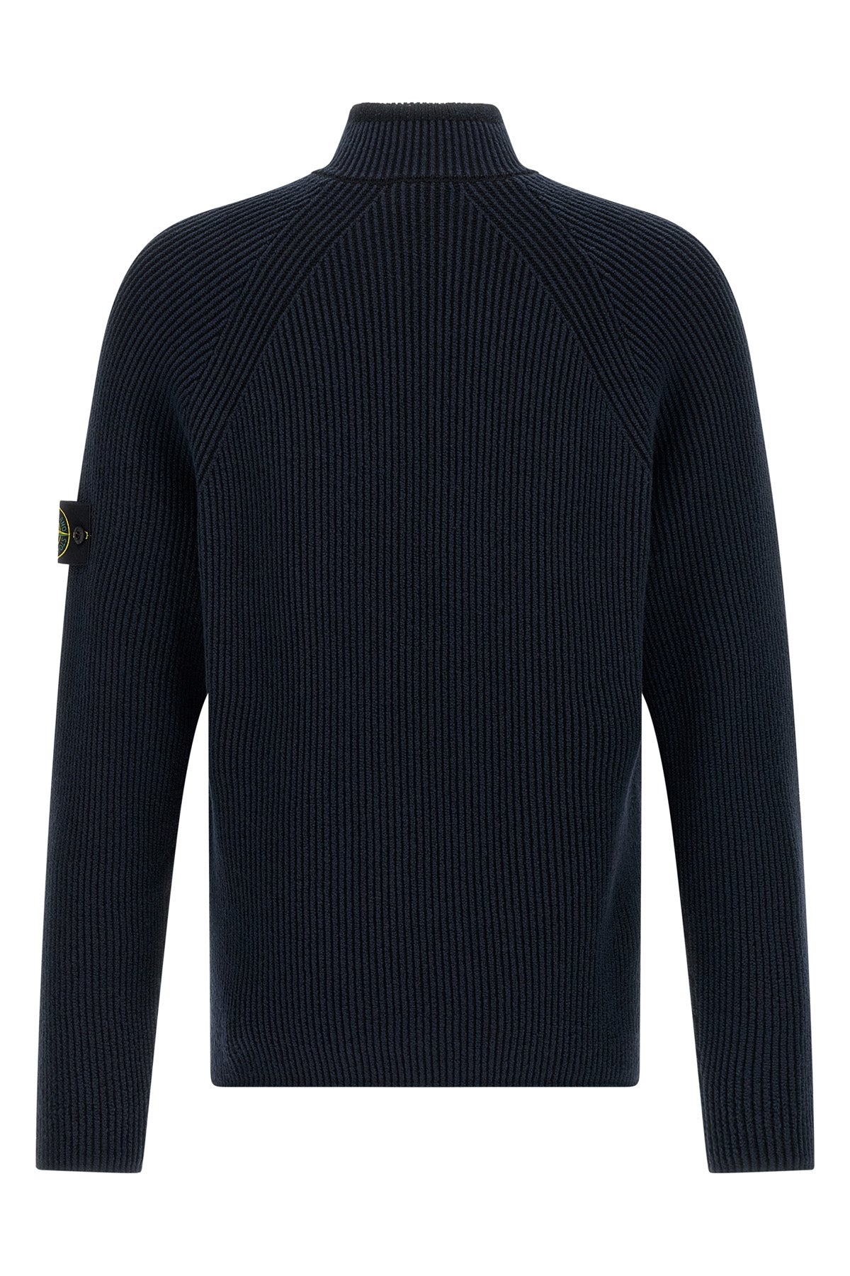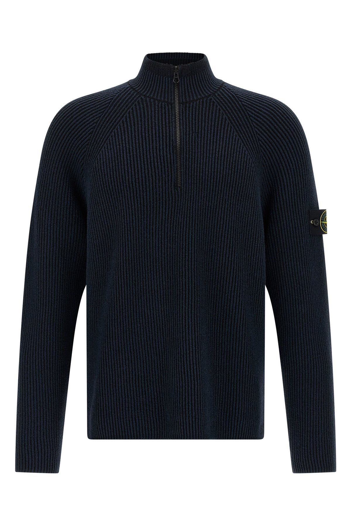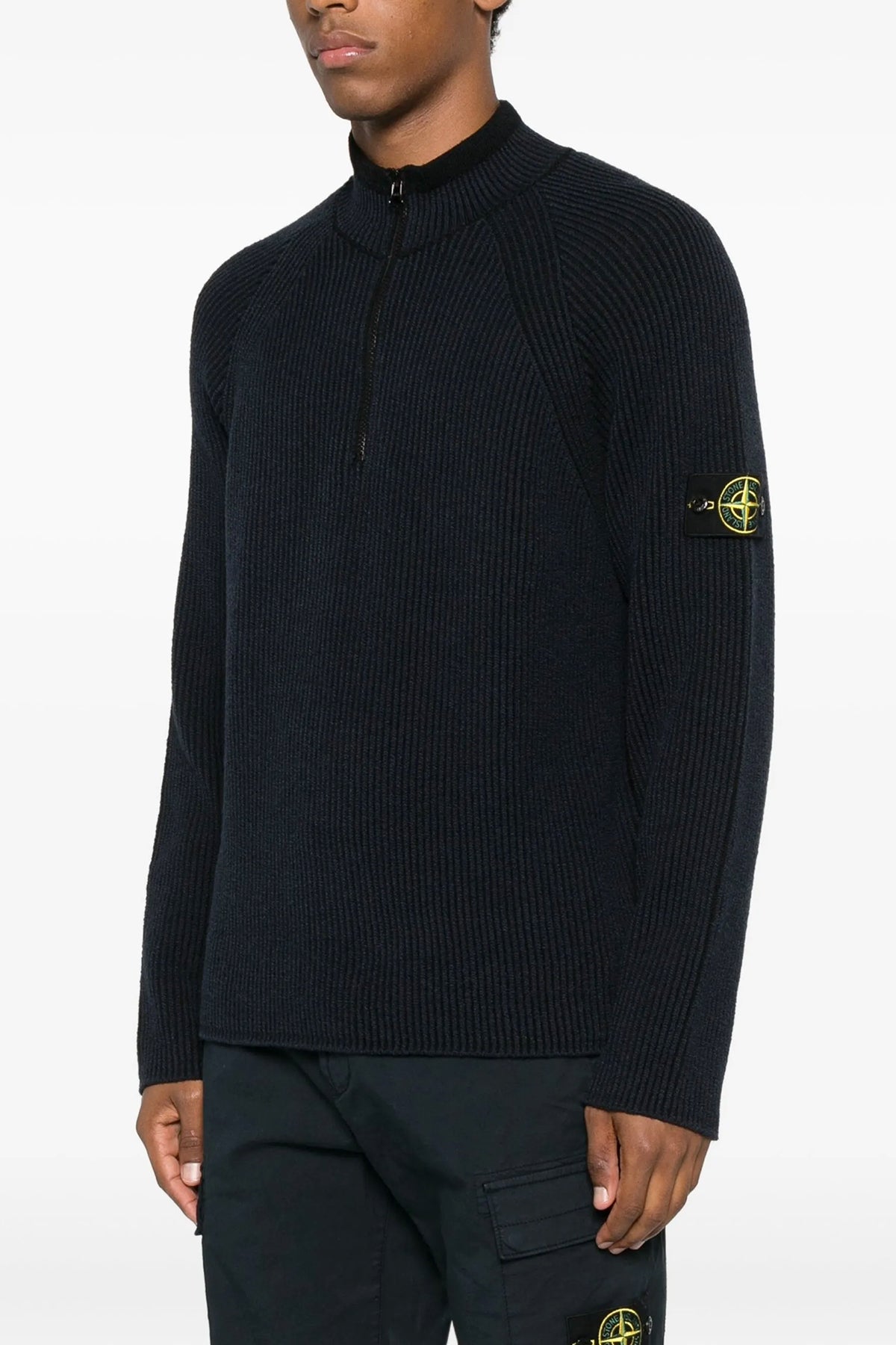 Gilet en laine vierge côtelée et mélange de coton stretch, demi-zip, col montant, manches longues avec écusson logo.