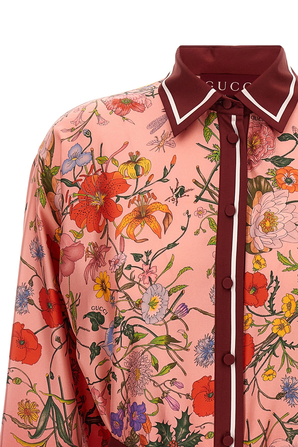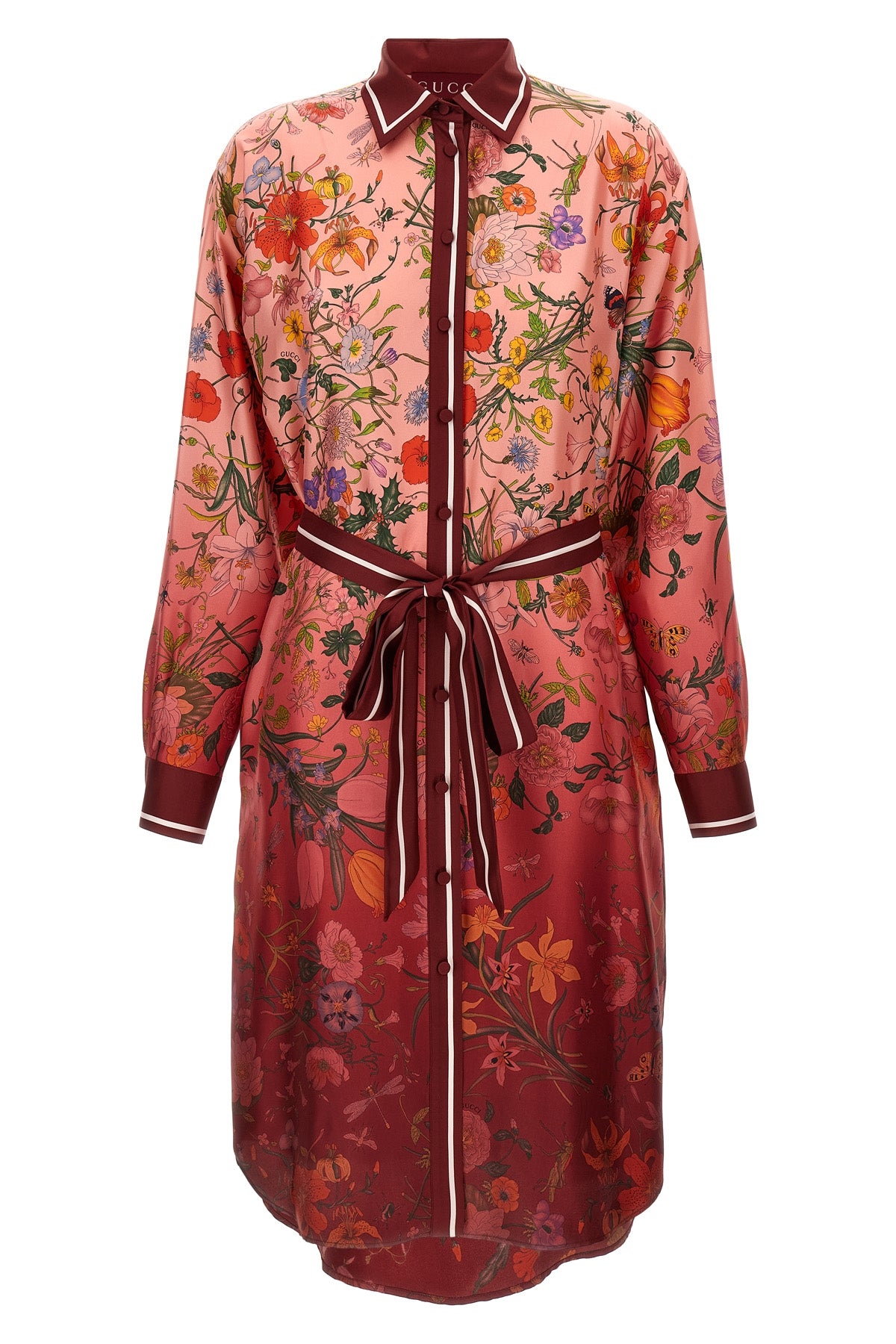 Robe midi en sergé de soie rose et imprimé dégradé rouge Gucci ' Gucci Flora ', modèle chemisier, fermeture boutonnée sur le devant, manches longues à poignets boutonnés, ceinture amovible.