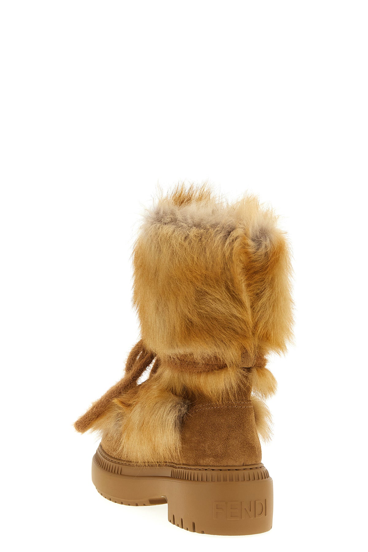 Bottes Apres Chic en peau de mouton et fourrure, bout rond, détails en daim ton sur ton, lacets tubulaires avec crochets et détails métalliques dorés, semelle épaisse en caoutchouc avec logo lettré sur le talon.