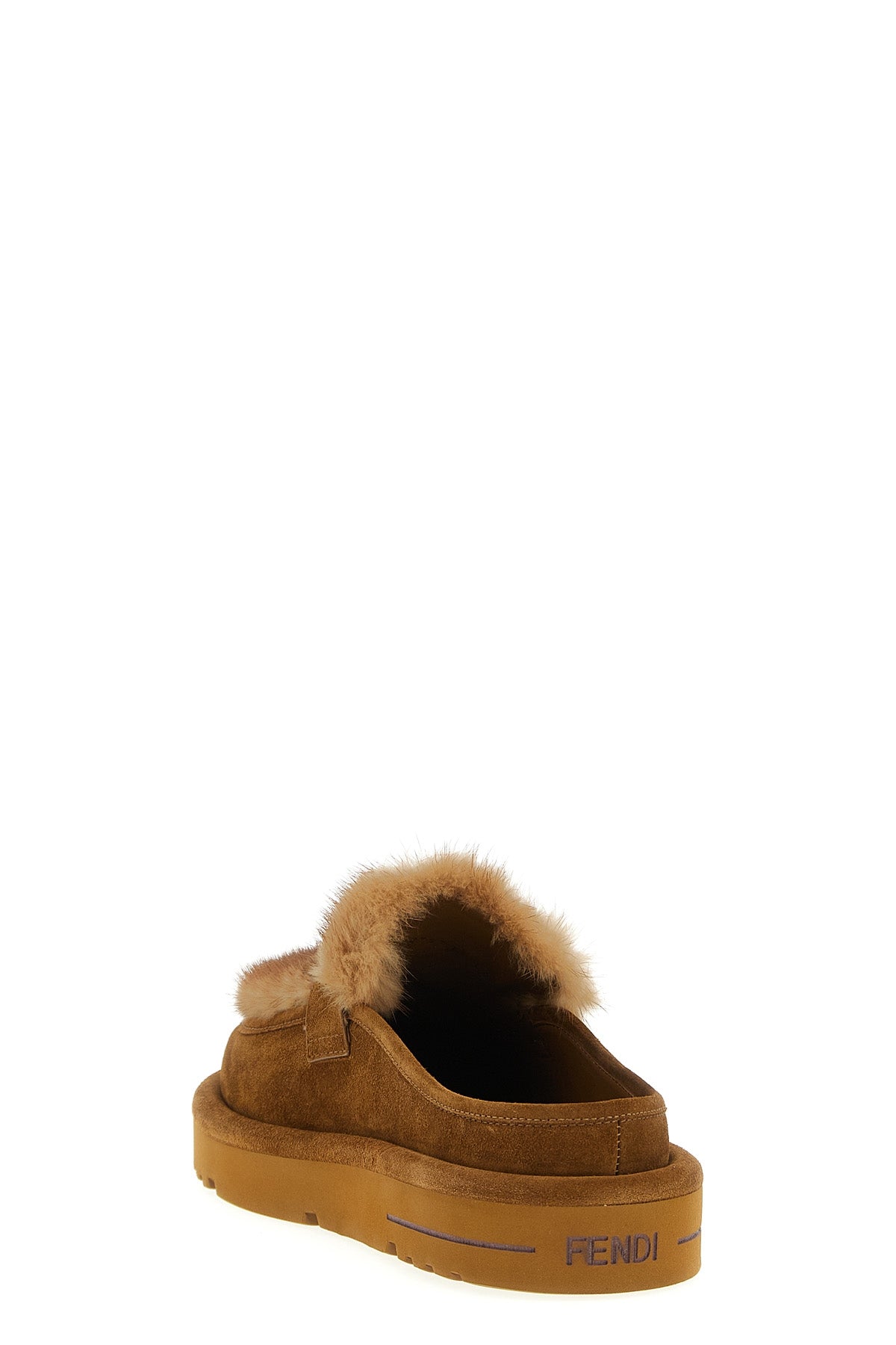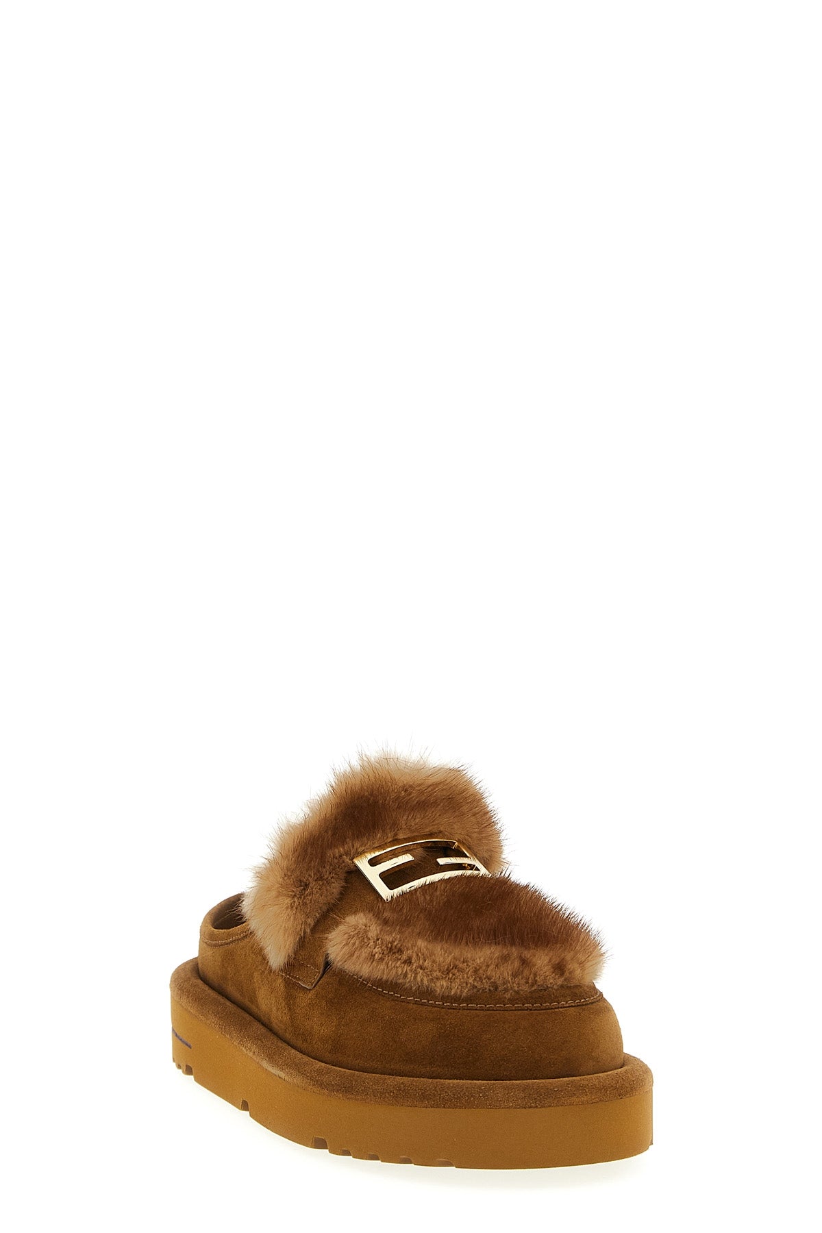 Sabots en daim, empeigne en fourrure de vison avec boucle en métal doré sur le devant et logo ' Baguette ', semelle en caoutchouc avec insert et inscription logo sur le talon.