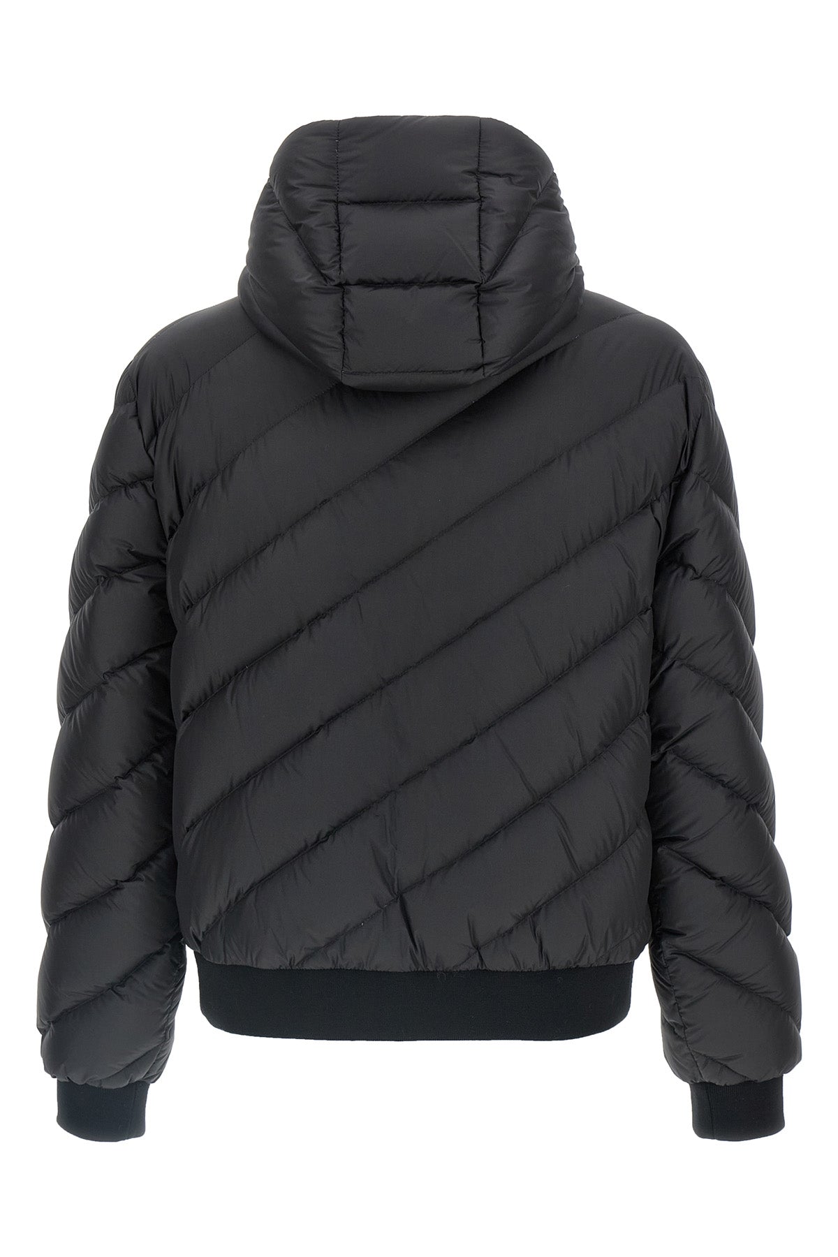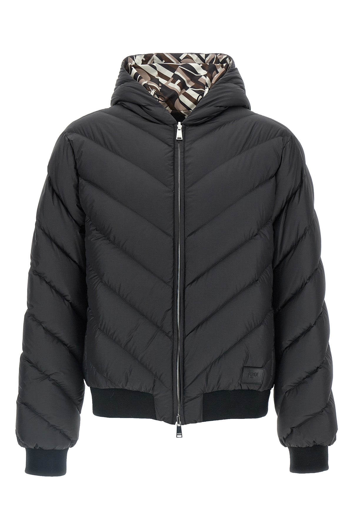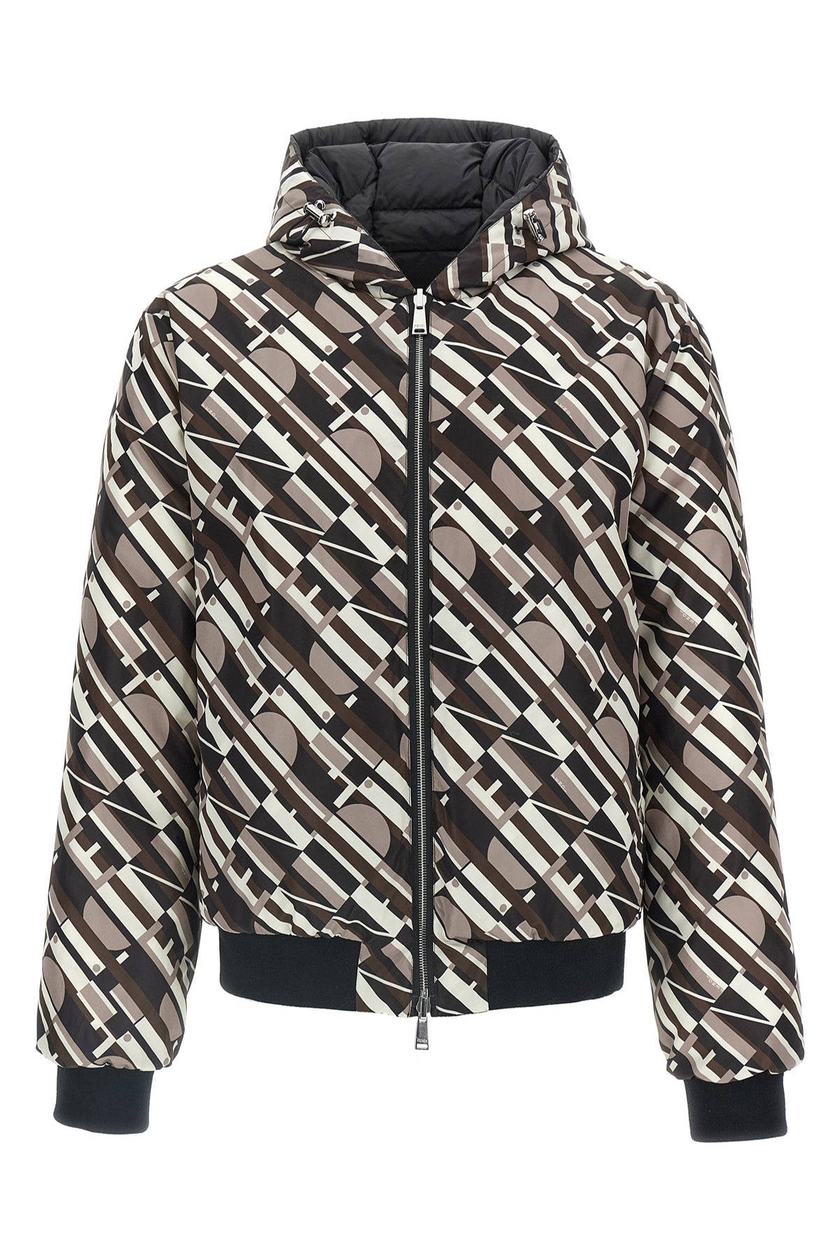 Doudoune réversible matelassée en nylon avec capuche, fermeture éclair double curseur sur le devant, intérieur imprimé ' Fendi Tape ' sur toute la surface, manches longues avec poignets.