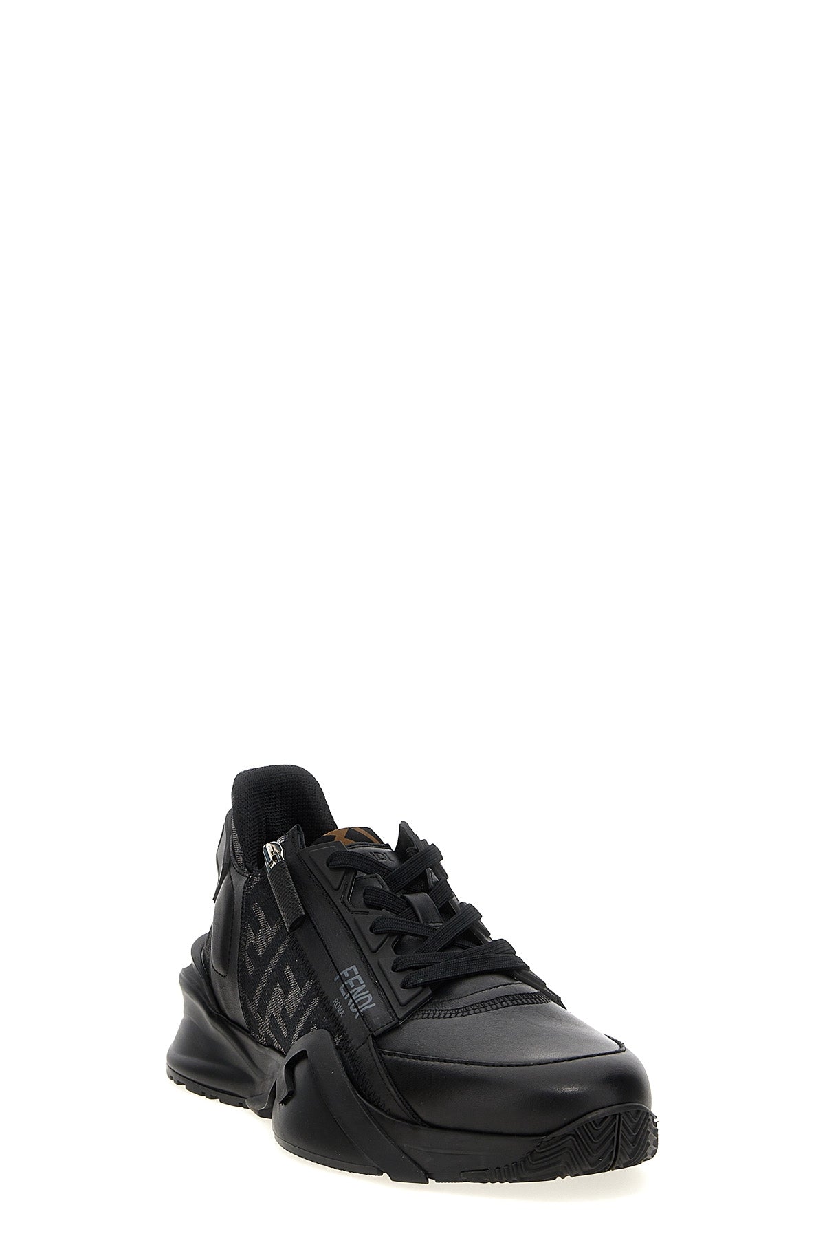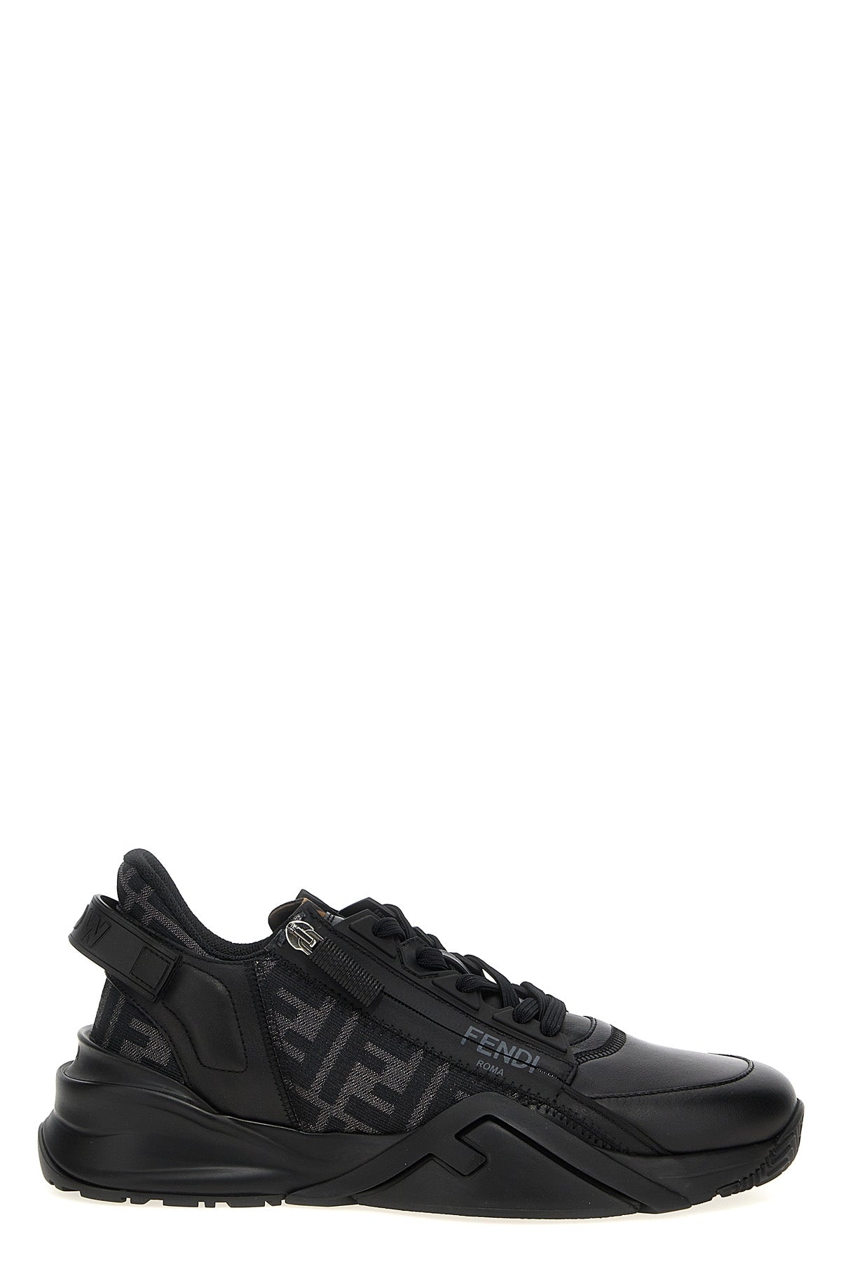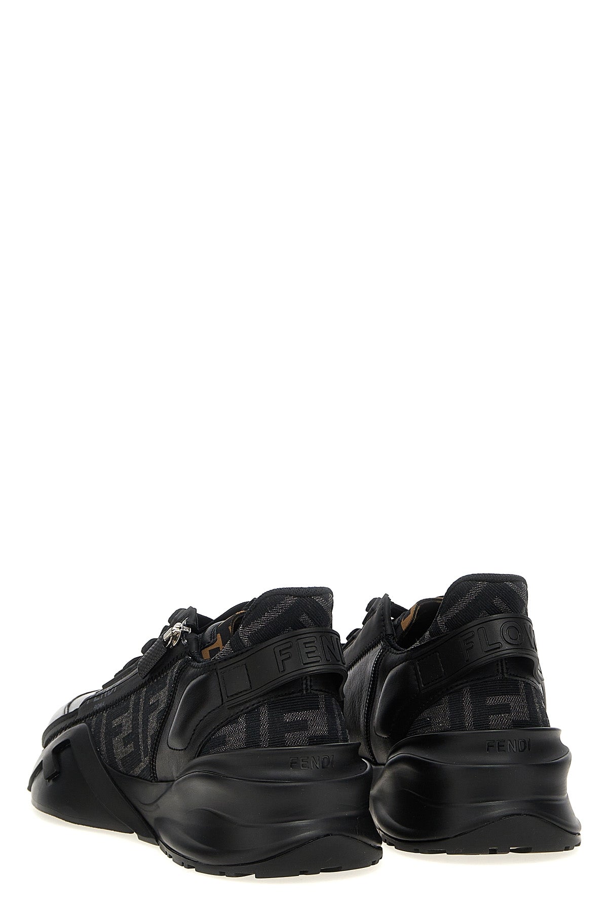 Baskets en cuir Flow avec lacets élastiques, fermeture éclair sur le côté et semelle ondulée avec F gravé, logo Fendi Flow en relief sur le talon, détails en tissu jacquard Ff, détail Ff sur la languette en Lycra®, semelle en caoutchouc légère avec détail F en diagonale.