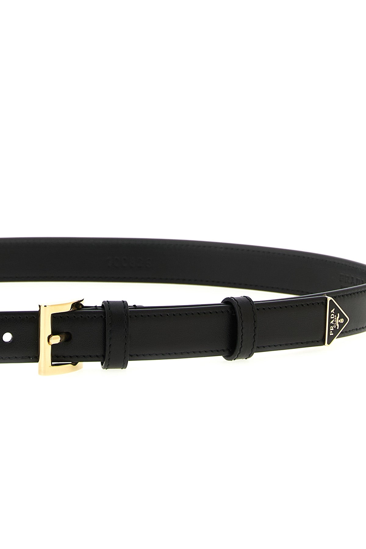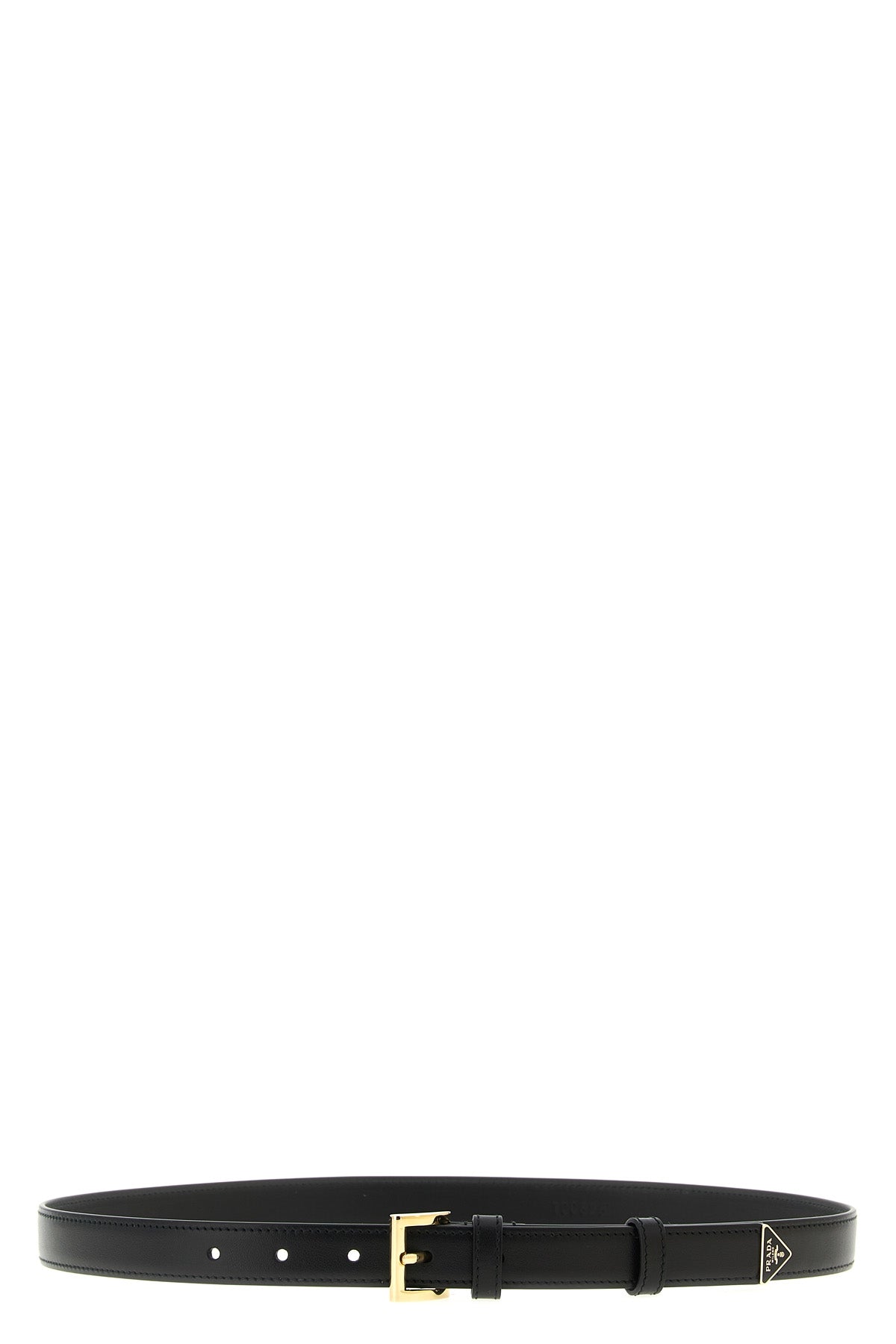 Ceinture en cuir, boucle en métal, logo triangulaire en métal émaillé.
