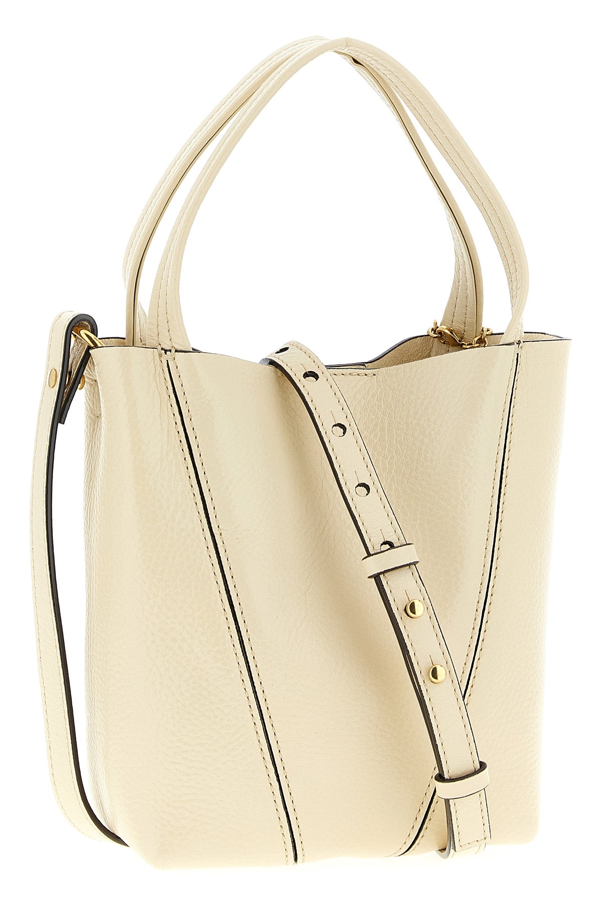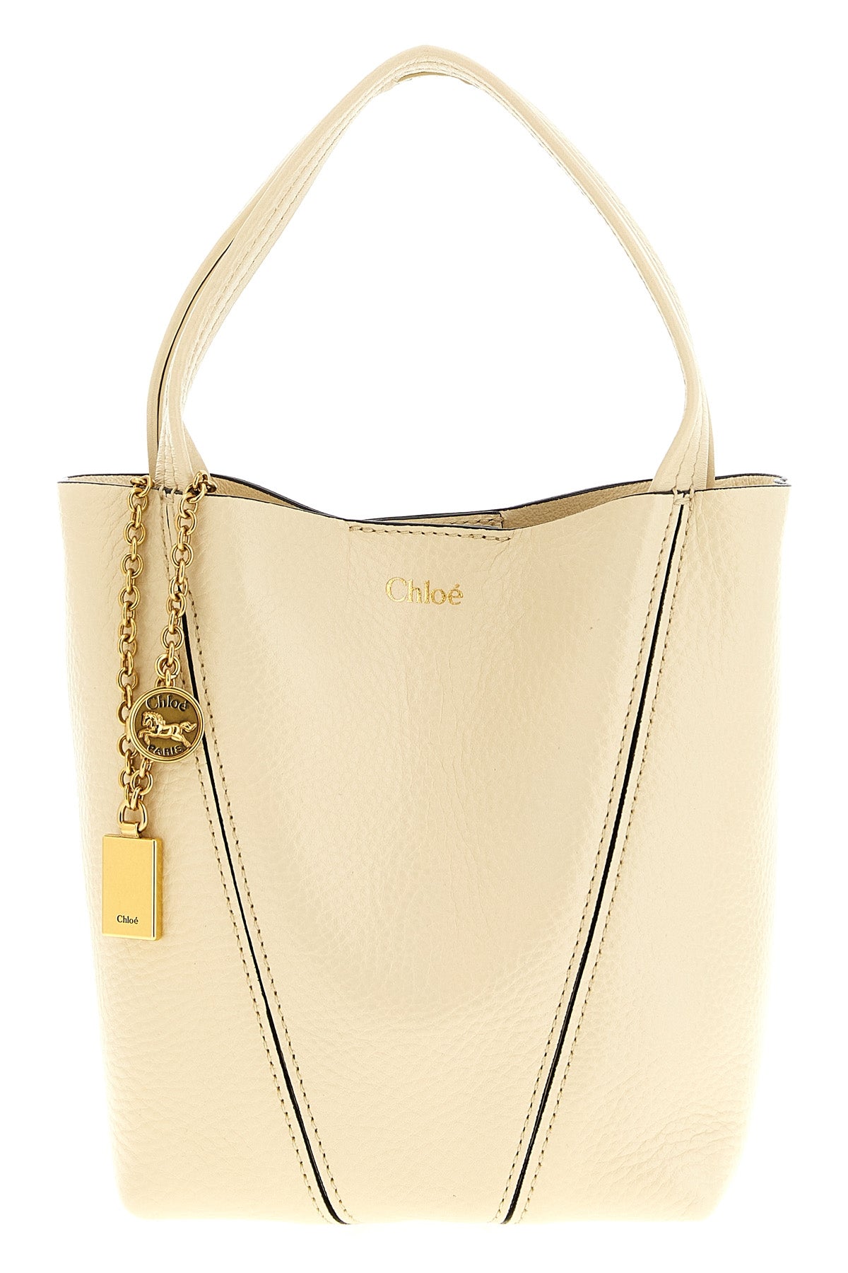 Sac à main Chloé Spin en cuir grainé avec logo embossé sur le devant, double anse, chaîne pendentif avec médailles Chloé et cheval, anneau à insérer dans les anses, bandoulière réglable et amovible.
