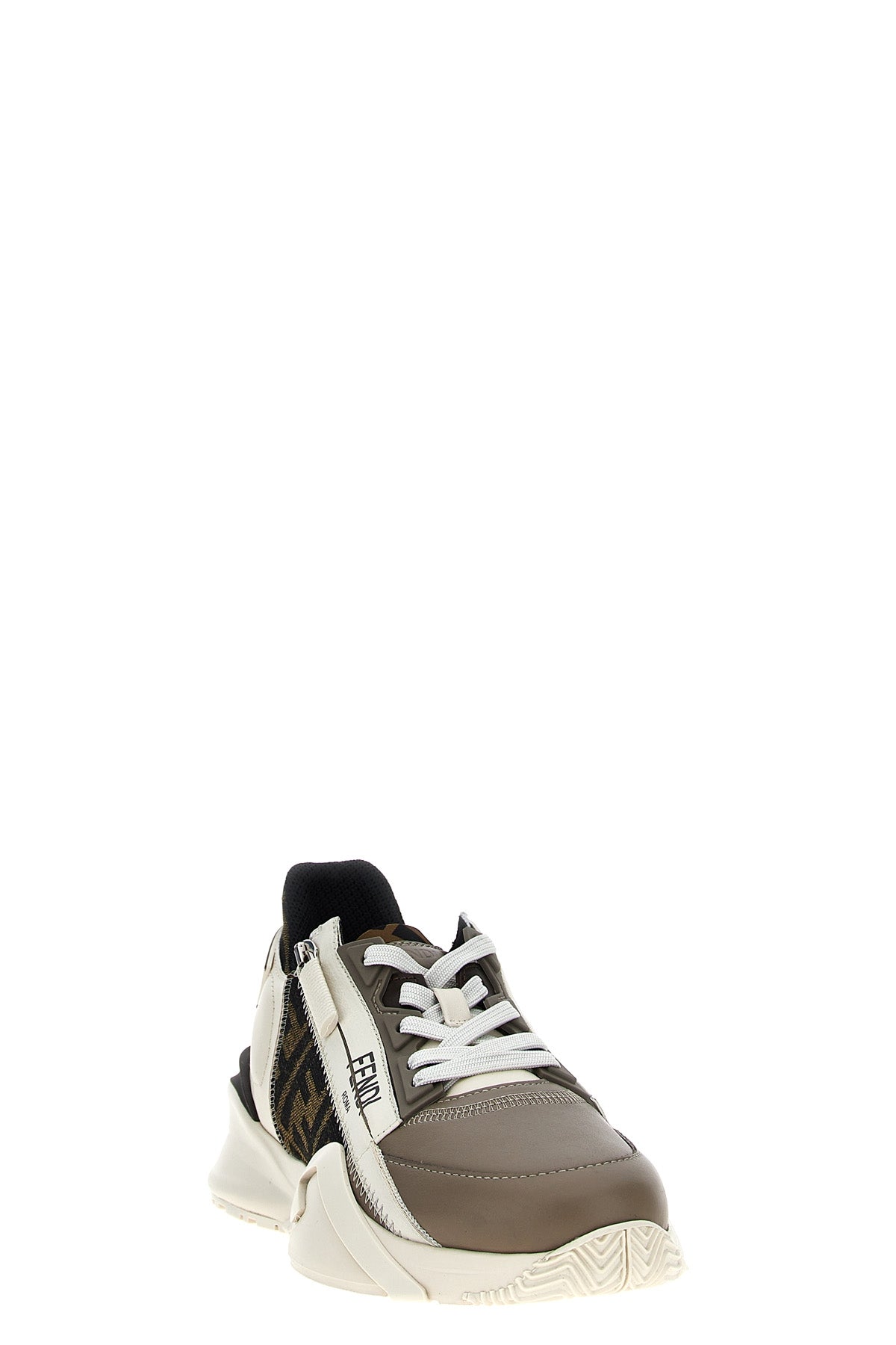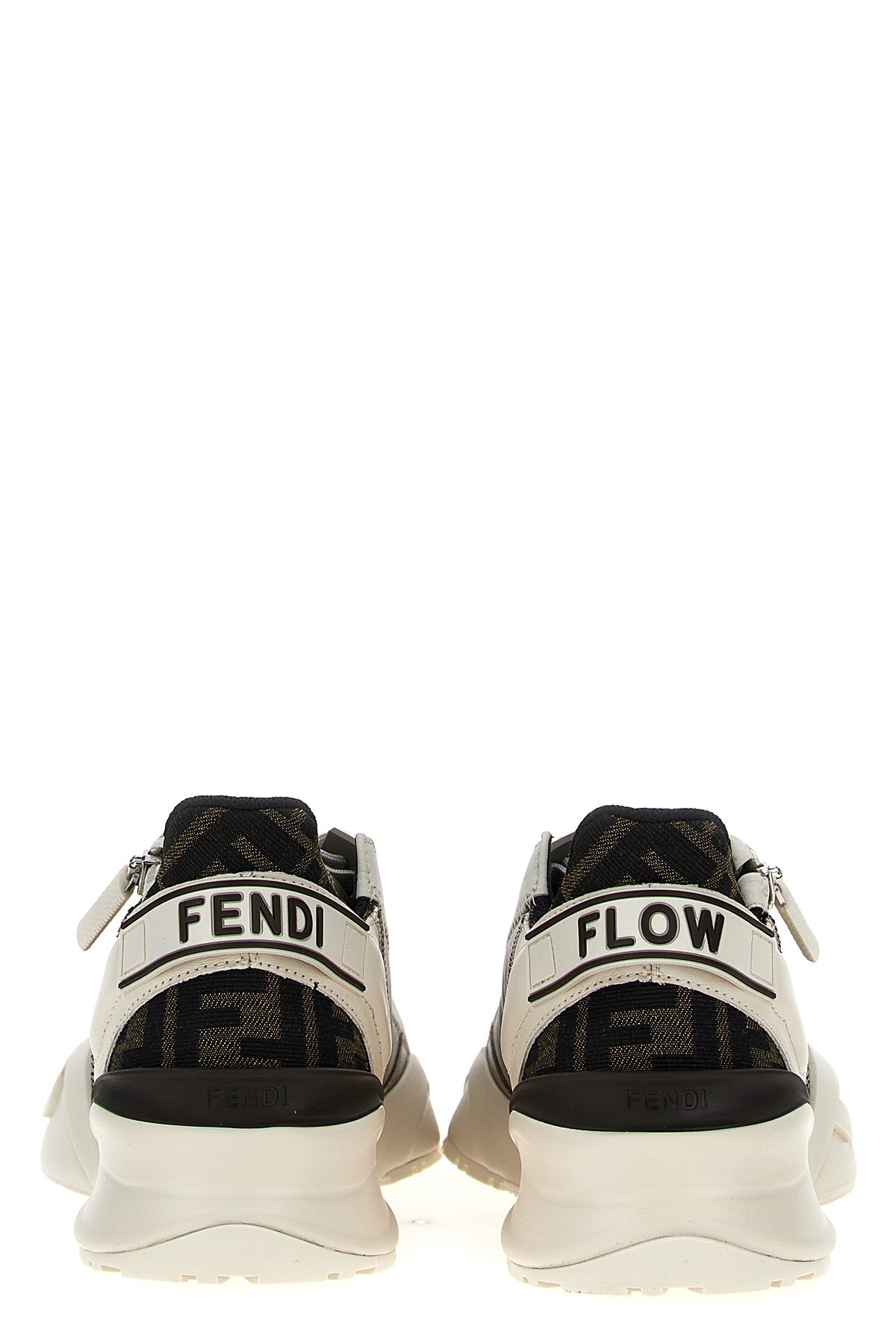 Baskets en cuir Flow avec lacets élastiques, fermeture éclair sur le côté et semelle ondulée avec F gravé, logo Fendi Flow en relief sur le talon, détails en tissu jacquard Ff, finition de la languette en Lycra® Ff, semelle en caoutchouc légère avec détail F en diagonale.