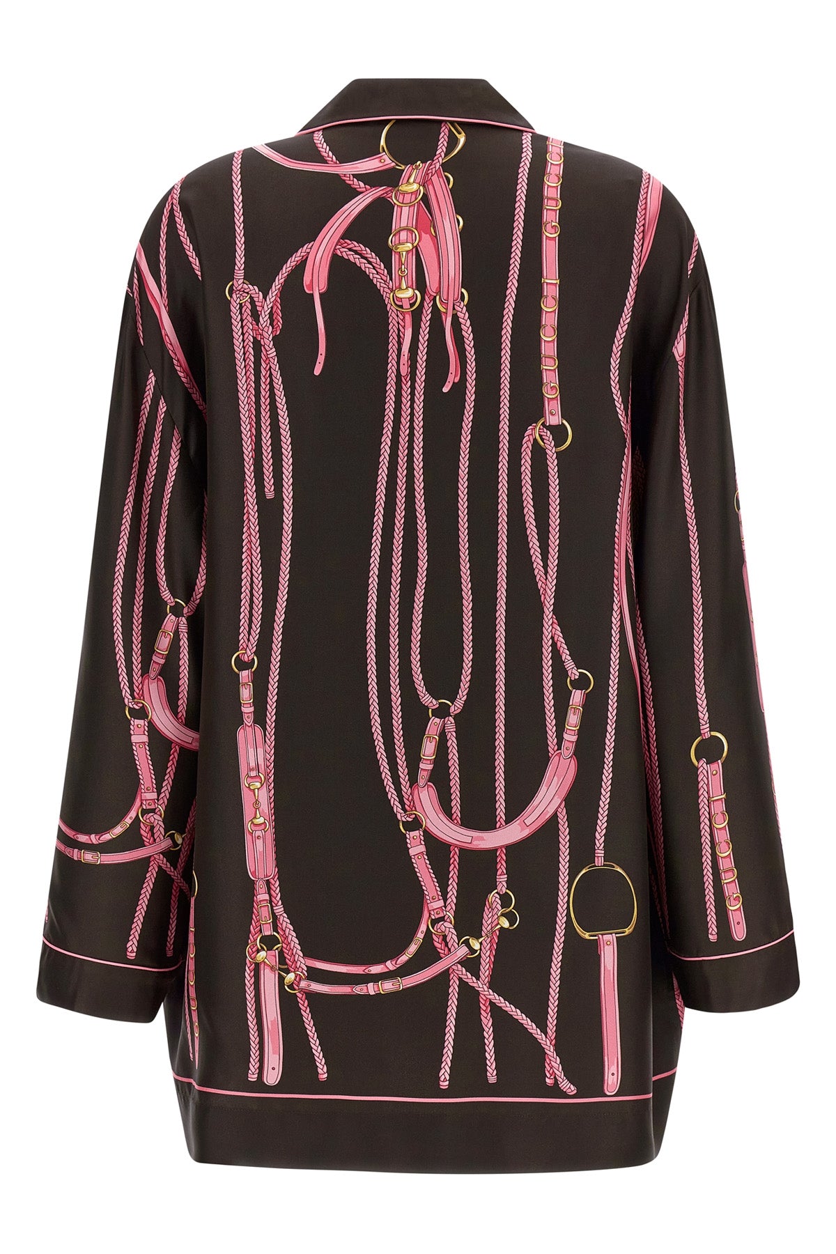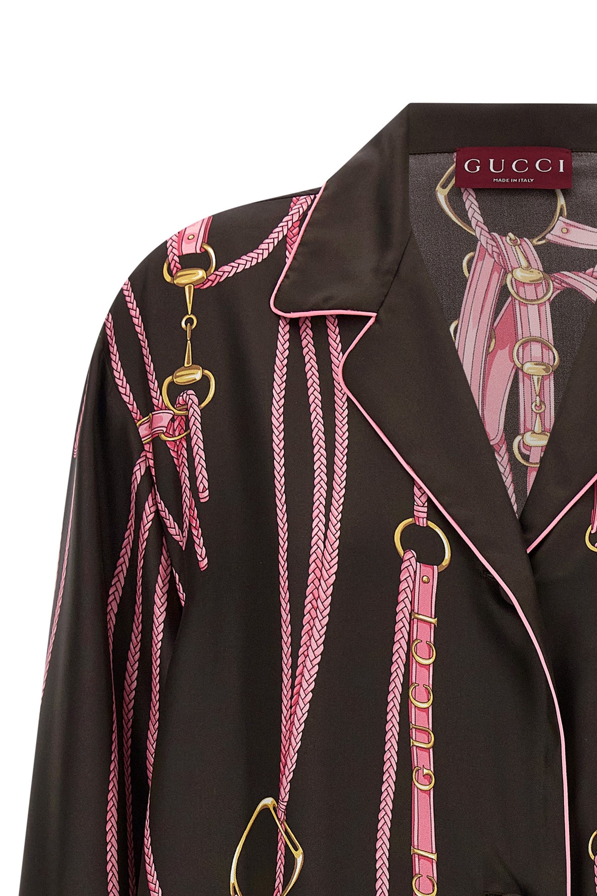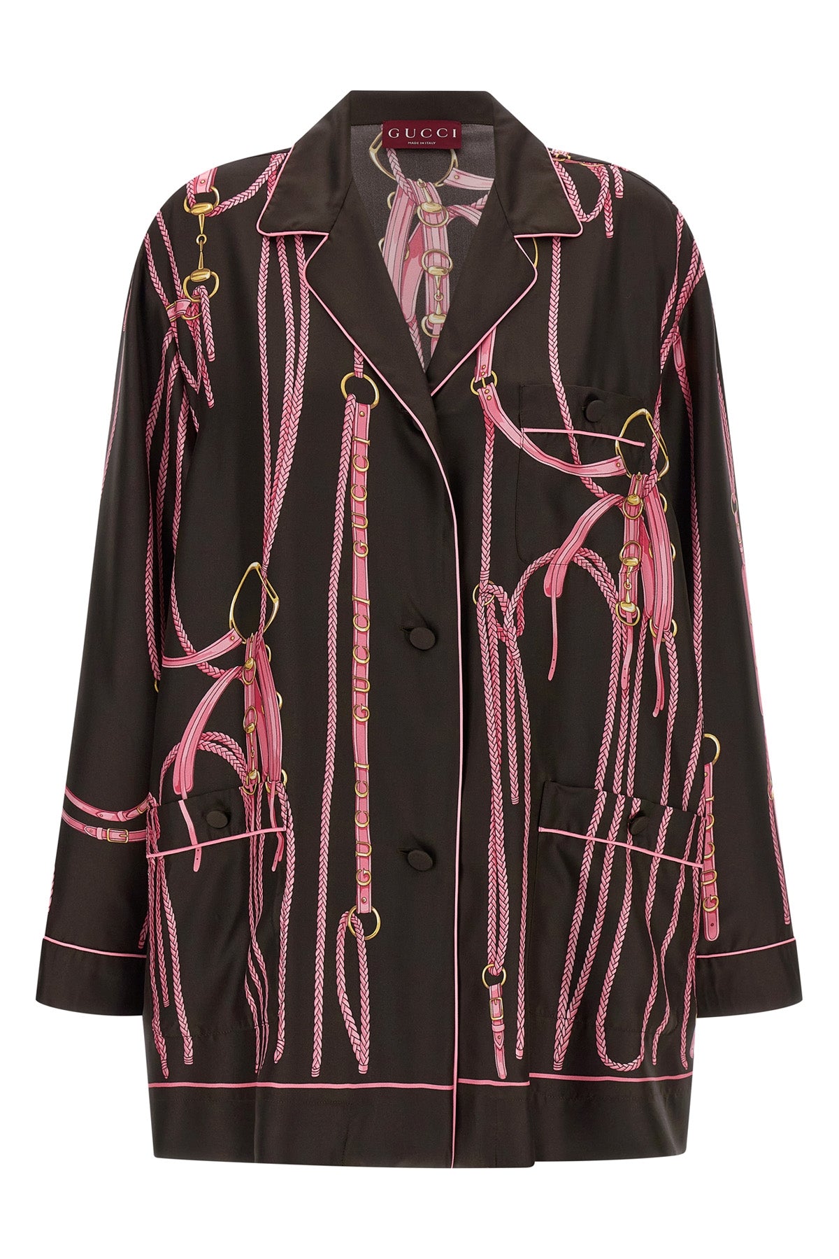Chemise en soie imprimée de motifs de pinces sur toute la surface, style pyjama, avec col à revers pointus, poches avant, fermeture boutonnée sur le devant, passepoil contrastant, manches longues.