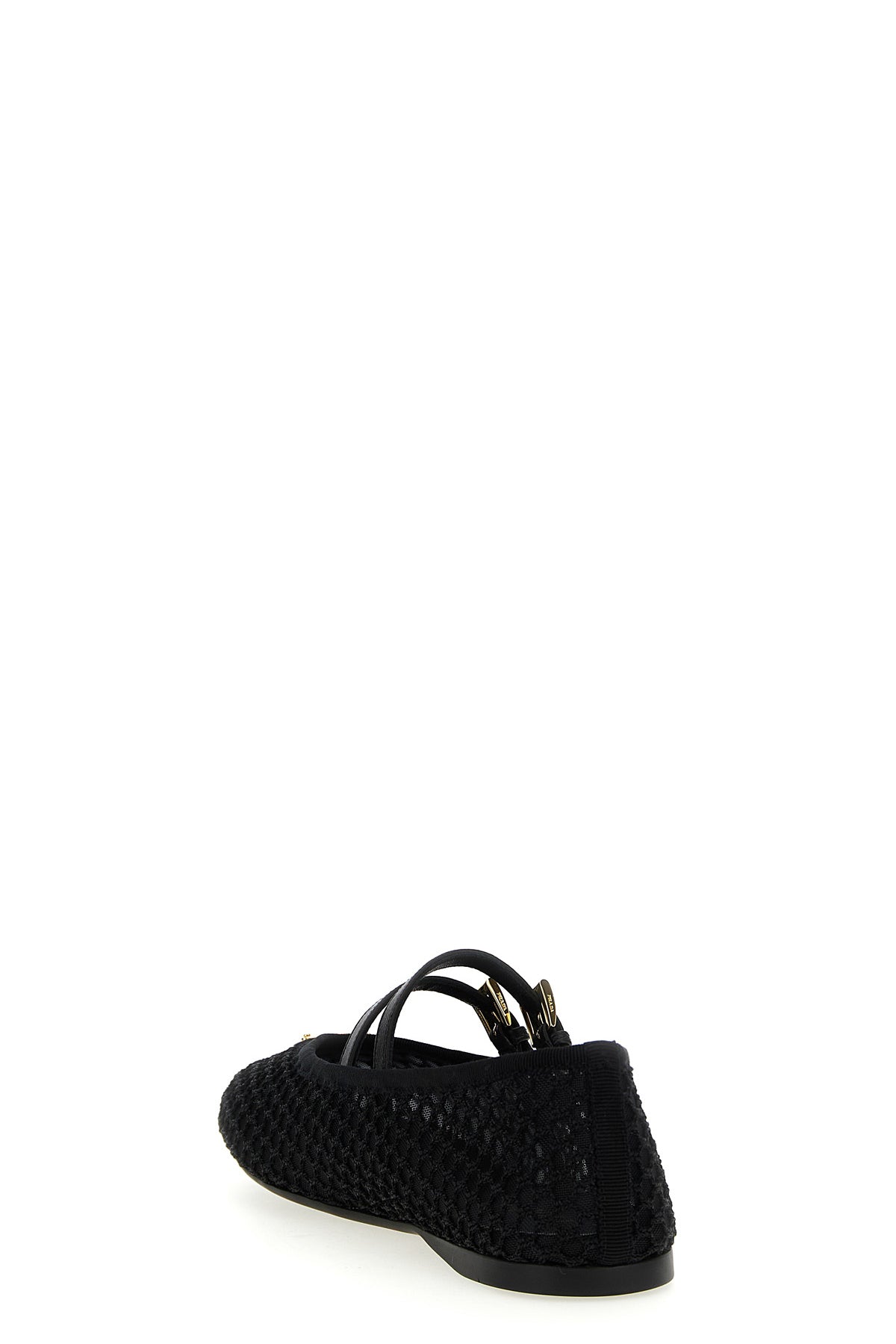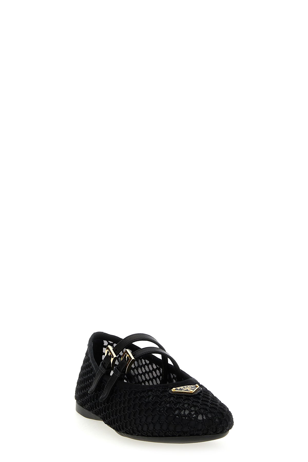 Ballerines en maille avec motif macramé superposé au tissu, double bride réglable en cuir, logo triangulaire en métal émaillé sur le devant, semelle en caoutchouc.