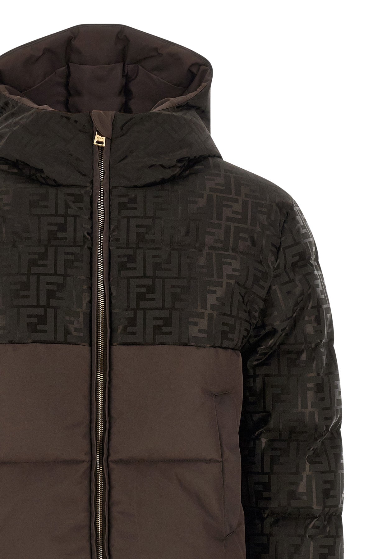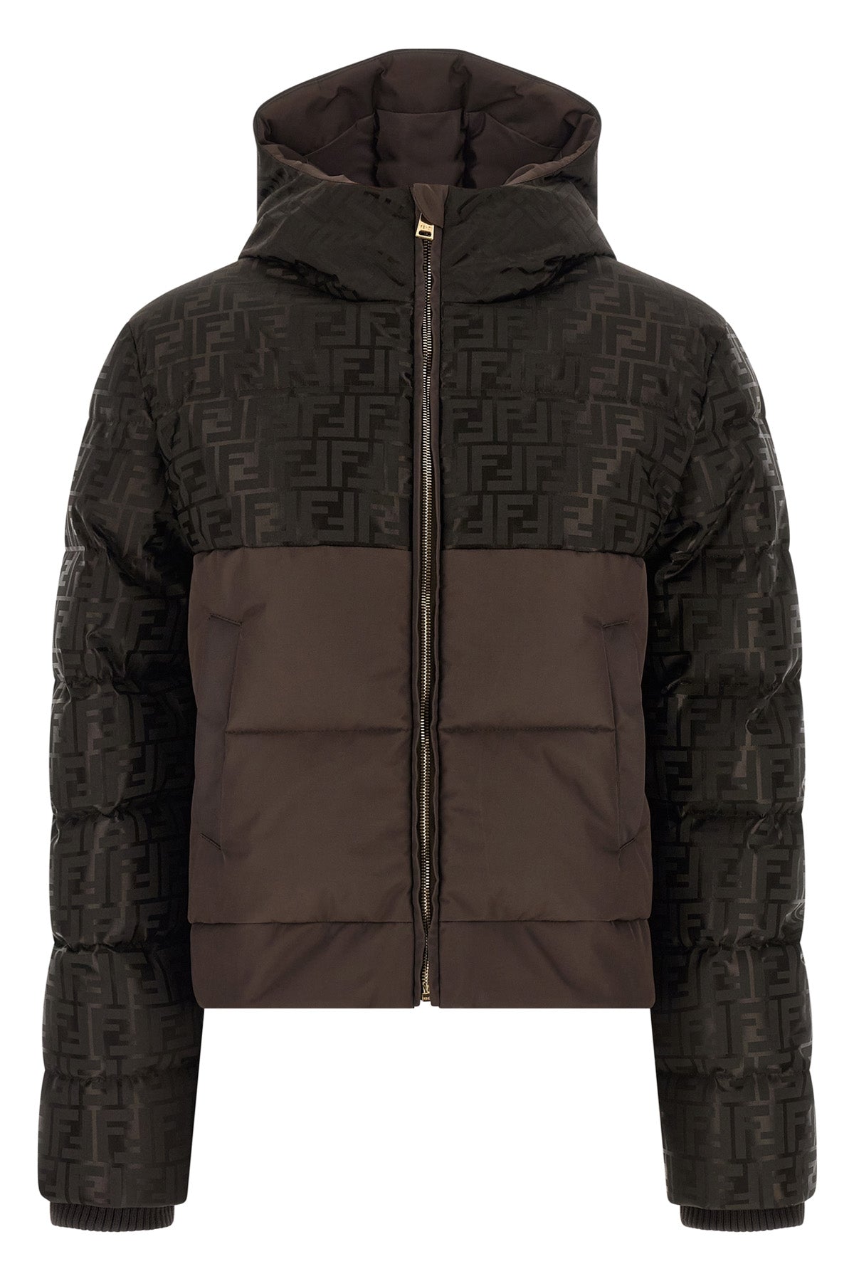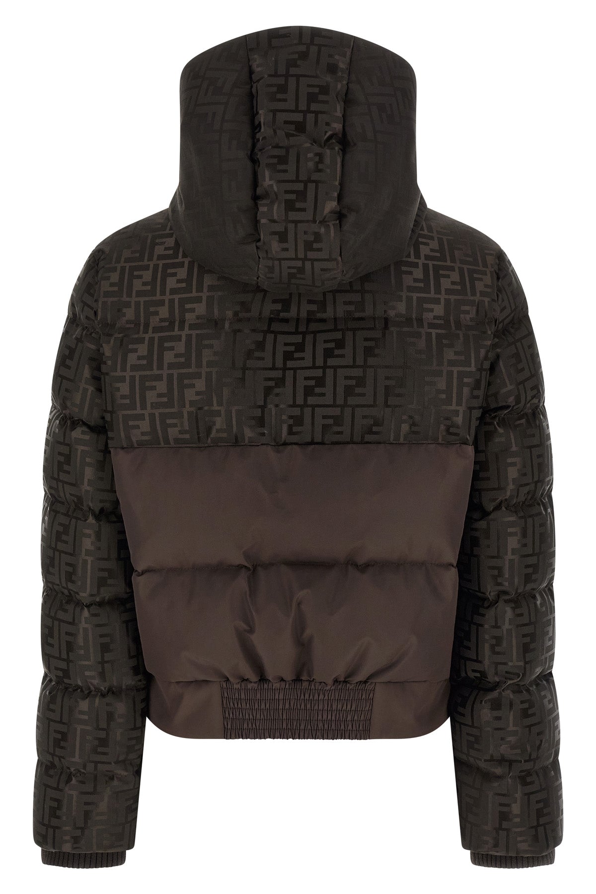 Veste courte en nylon jacquard brillant avec motif FF emblématique, empiècement central avant en nylon mat matelassé et rembourré effet plumes de canard, capuche ajustable, col montant, fermeture éclair sur le devant, poches, manches longues avec poignets en maille côtelée extensible, élastique à l'ourlet arrière.