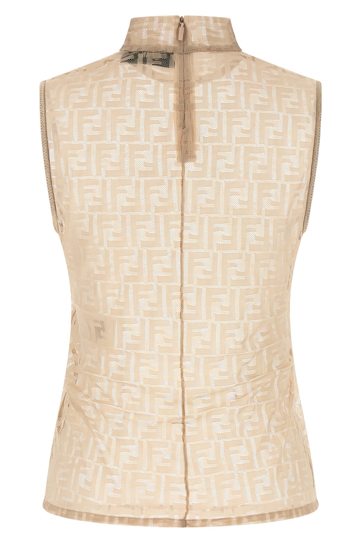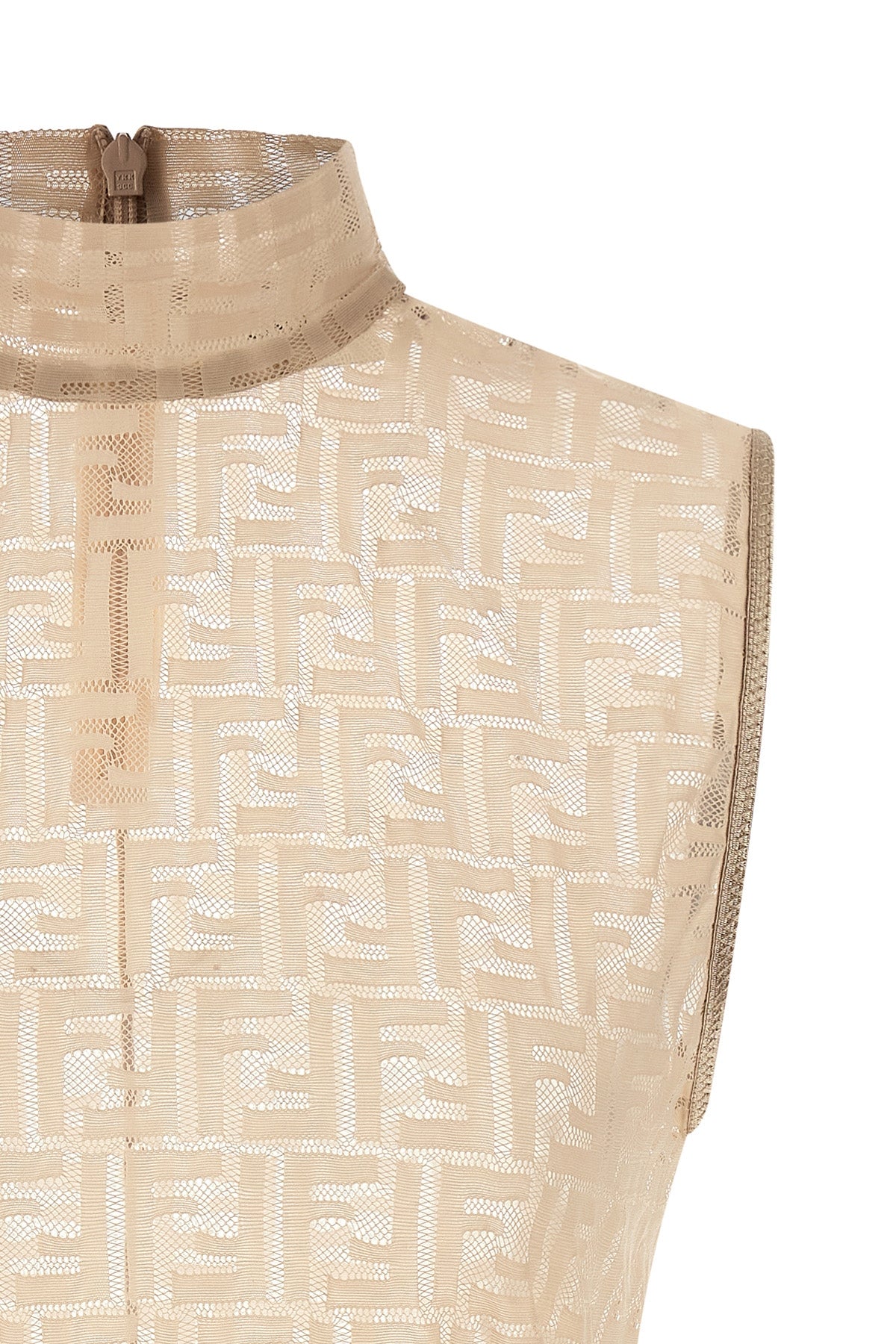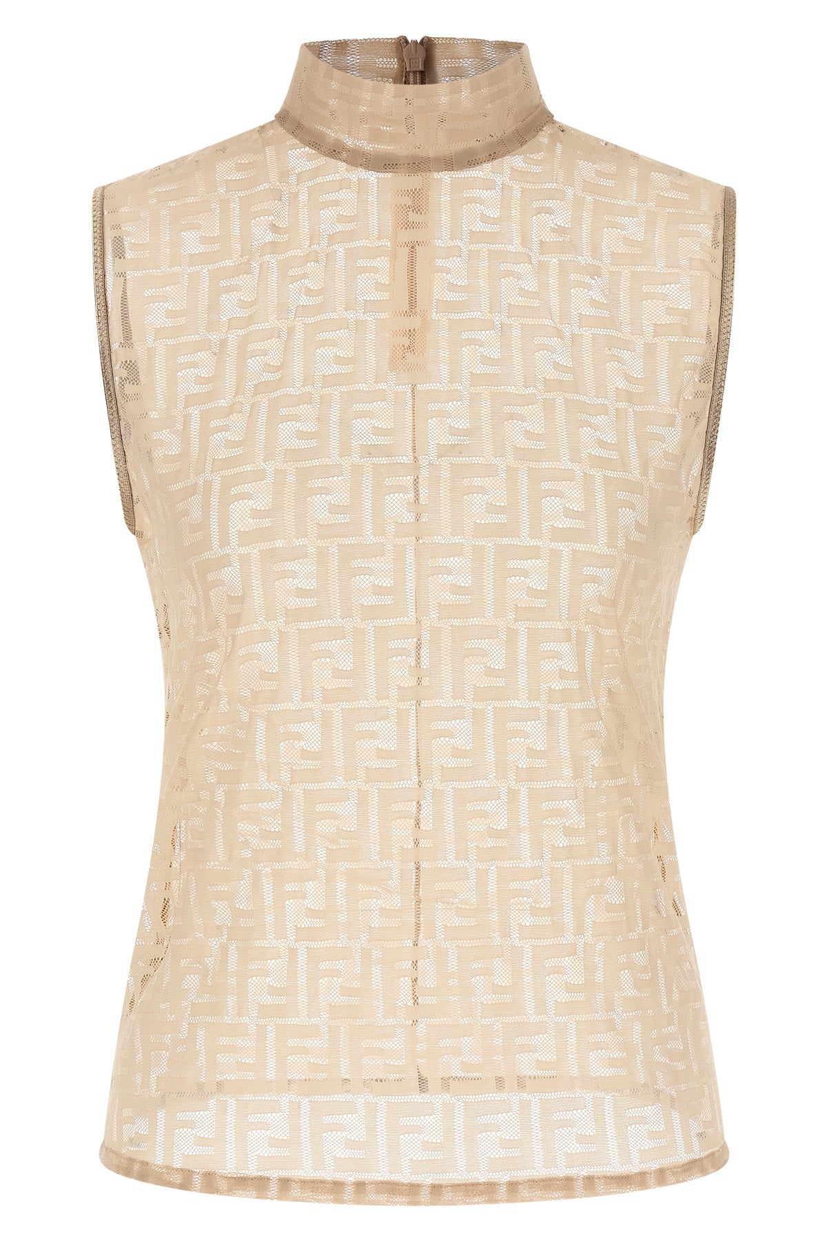Top en jersey de dentelle entièrement recouvert de dentelle ' Ff ', transparent, col montant, fermeture au dos avec fermeture éclair invisible, sans manches.
