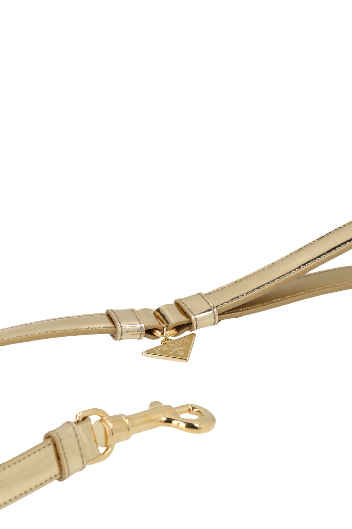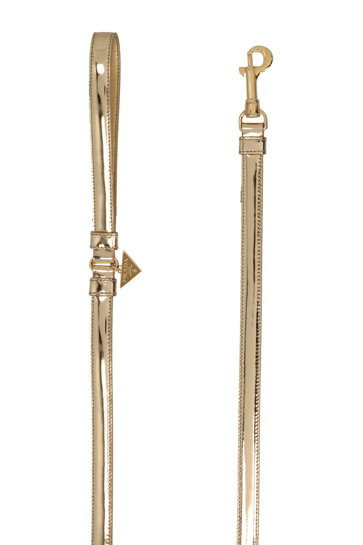 Laisse en cuir doré brillant avec breloques à logo triangulaire.