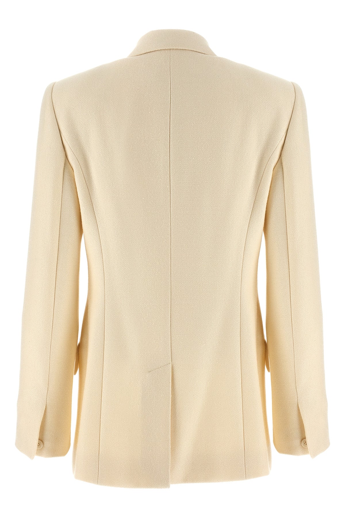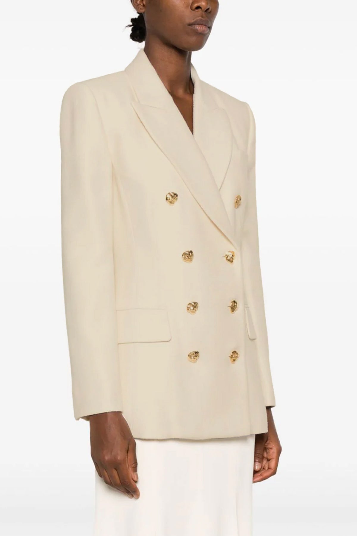 Blazer croisé en laine et soie mélangées, avec boutons métalliques de forme particulière, poches à rabat et revers pointus.
