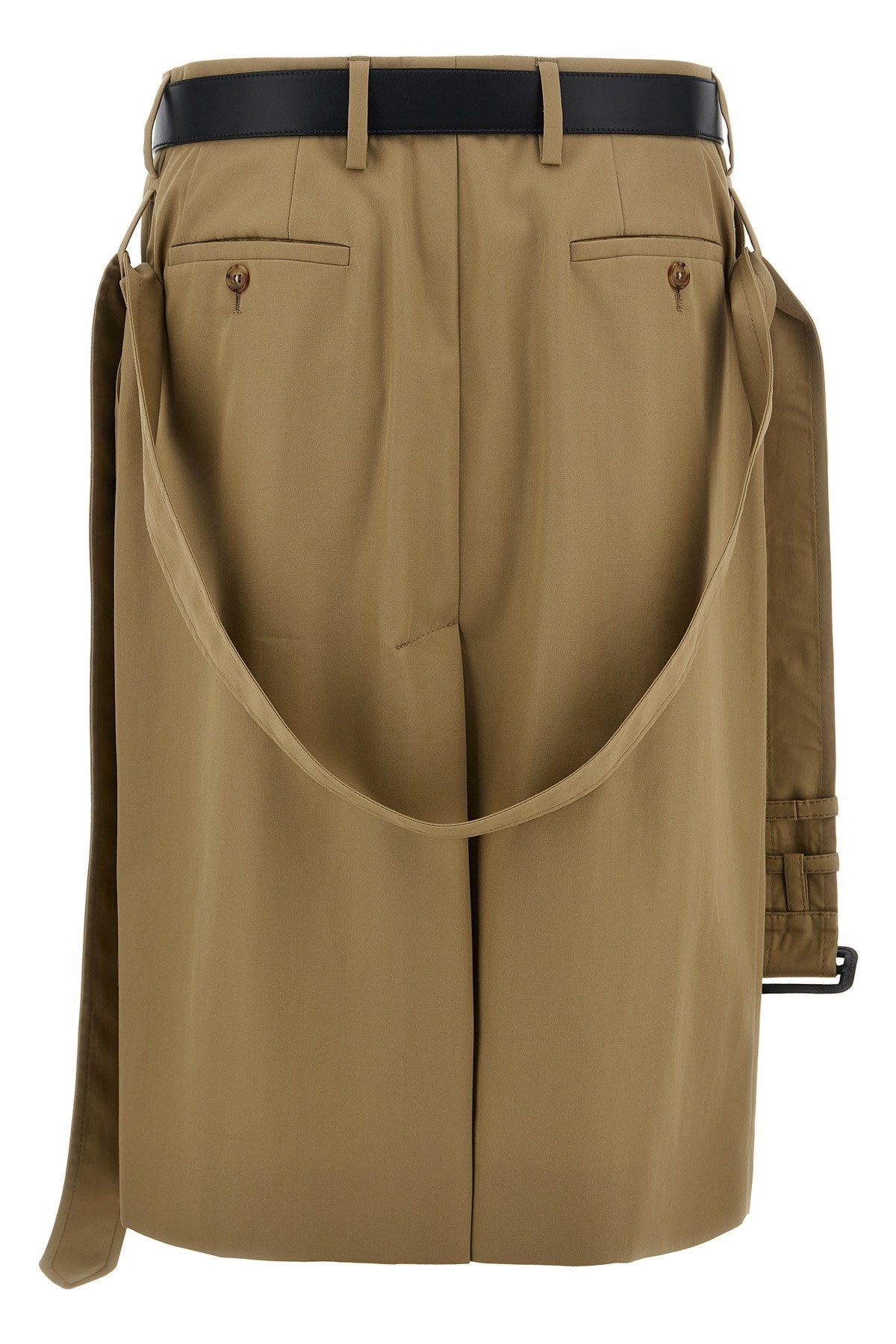 Jupe en sergé de coton avec ceinture en cuir à la taille, fermeture éclair et crochet, poches, fente au dos.