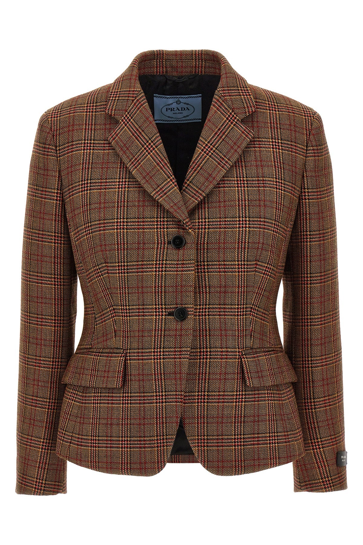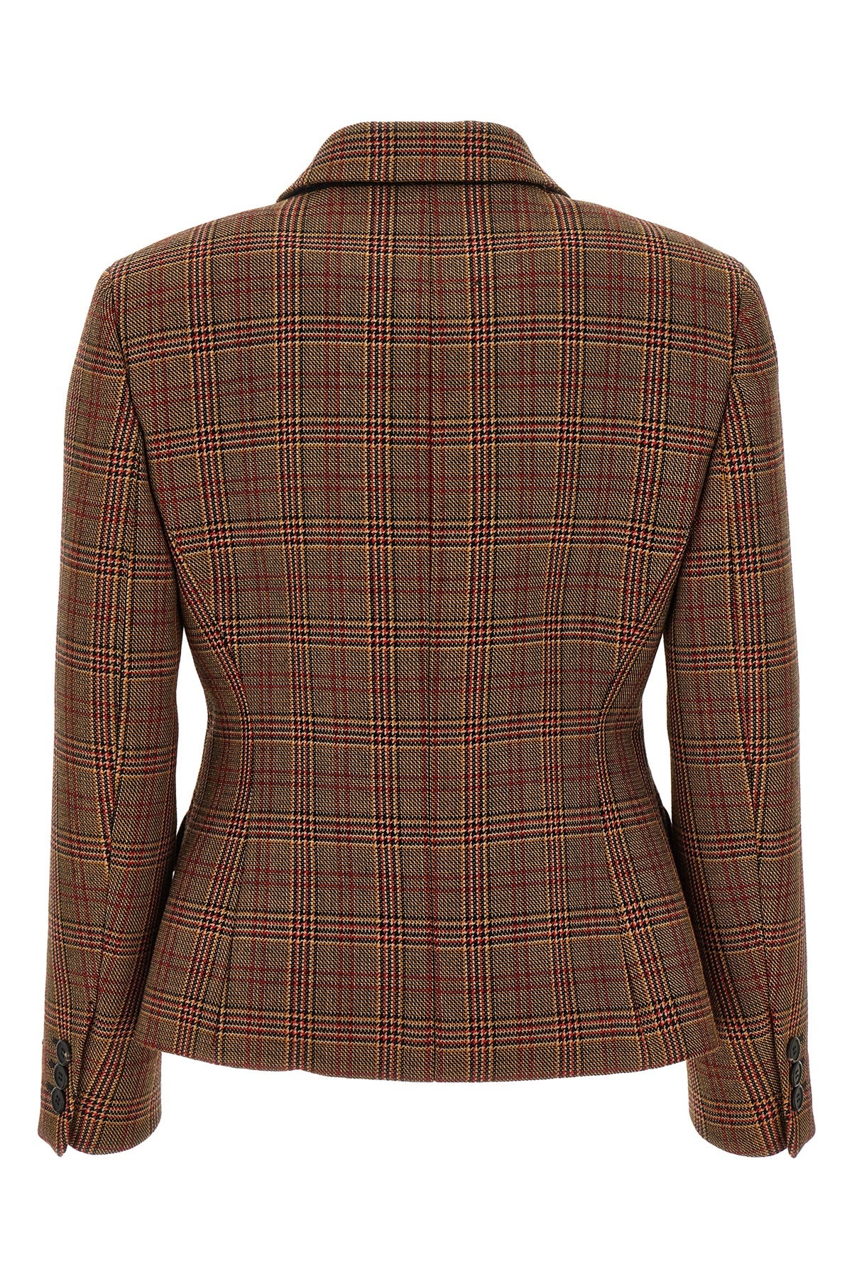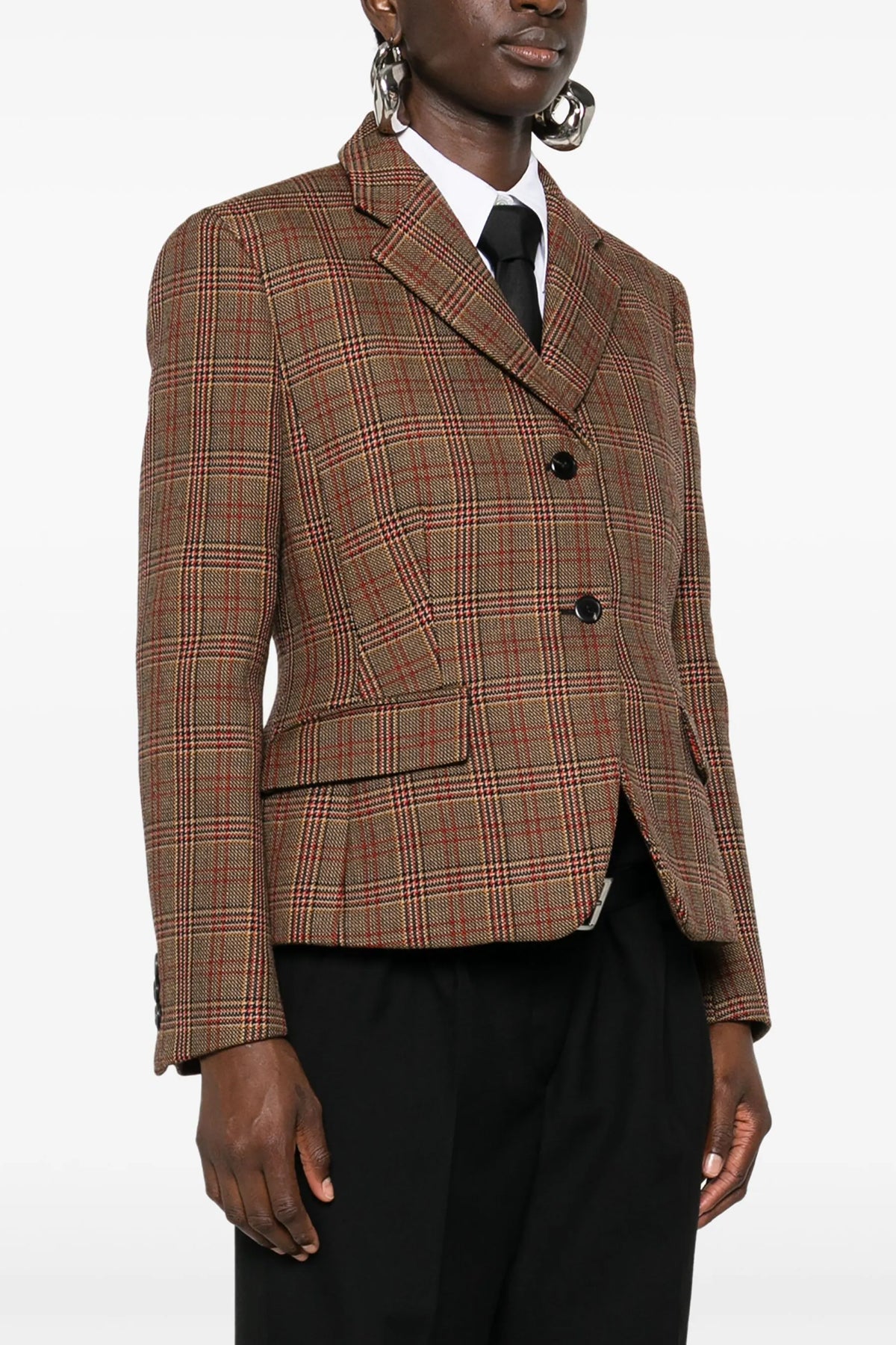 Blazer Prince de Galles en laine à simple boutonnage, taille cintrée, poches, manches longues, épaules structurées.