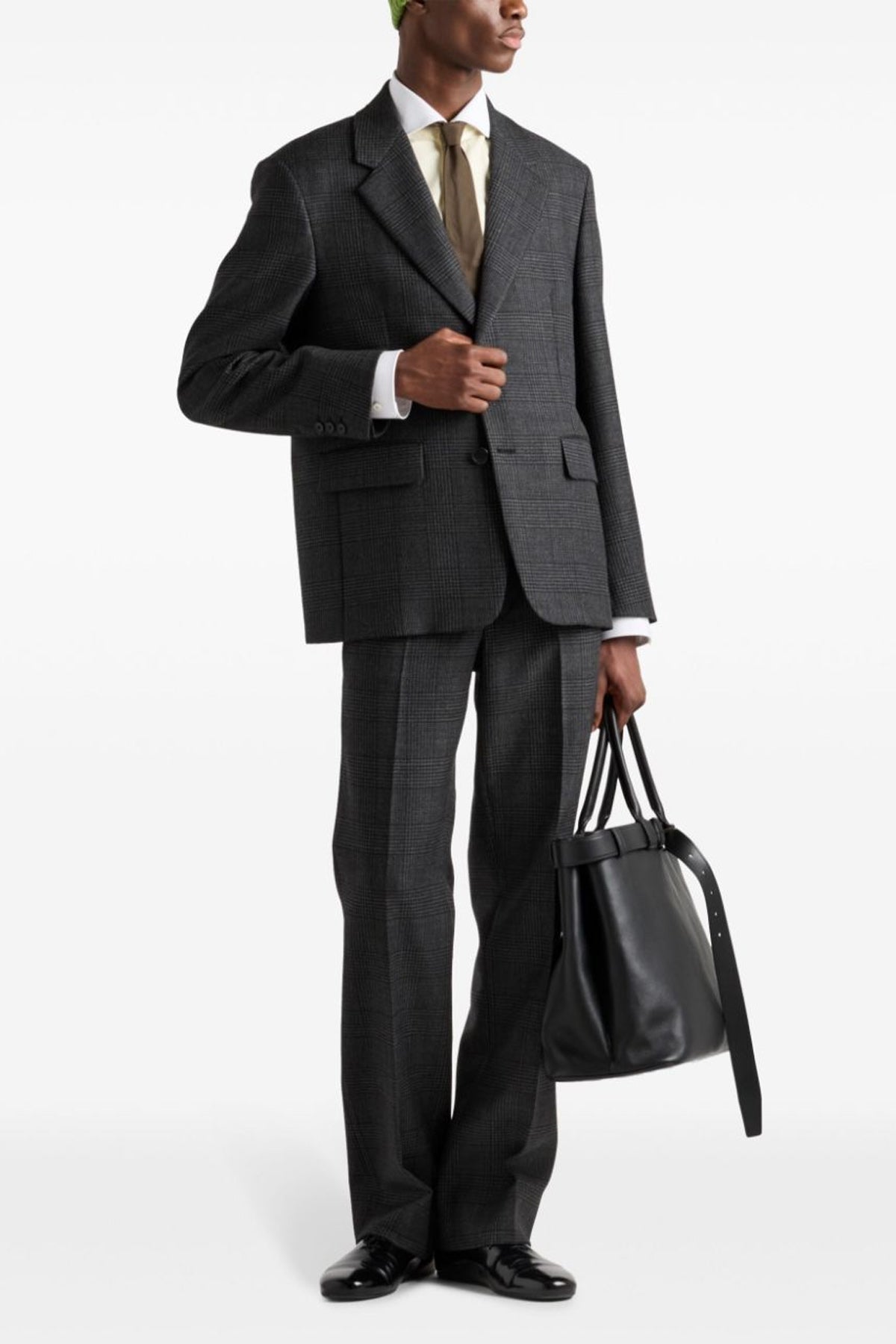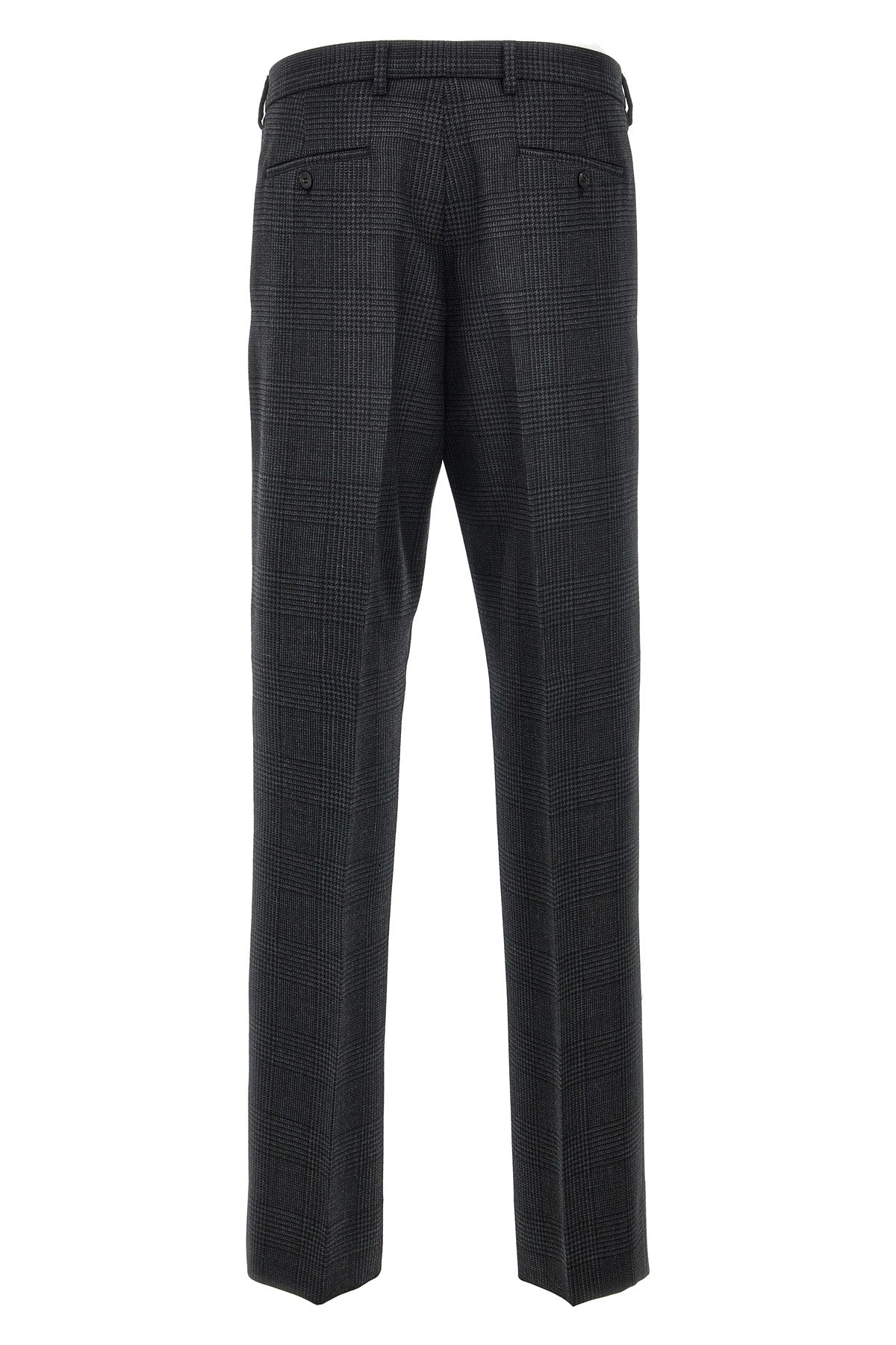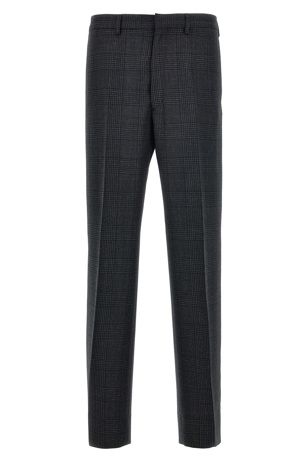 Pantalon en laine à carreaux, fermeture éclair à crochet et bouton, poches, jambe droite avec pli pressé.
