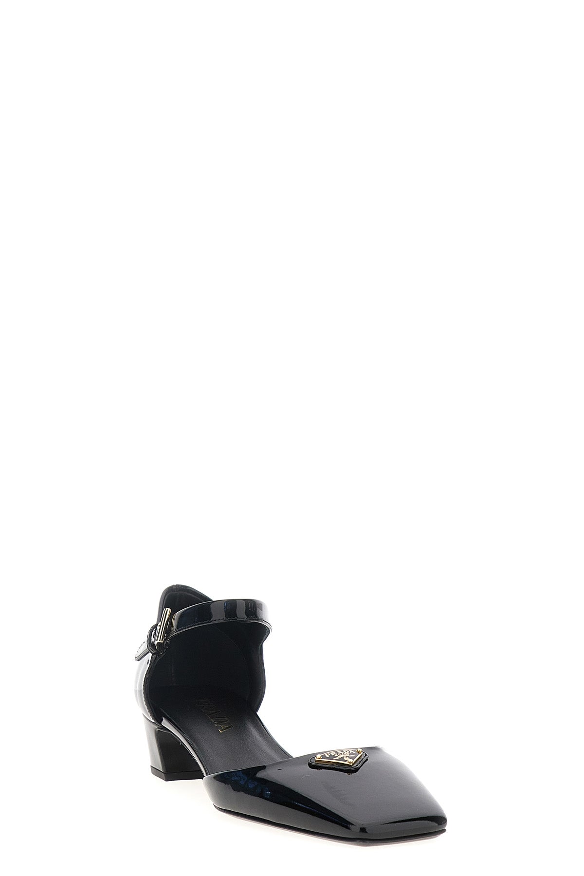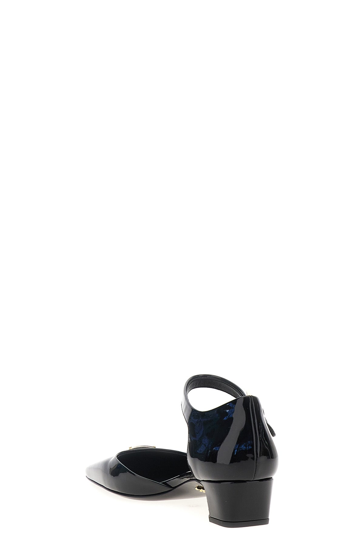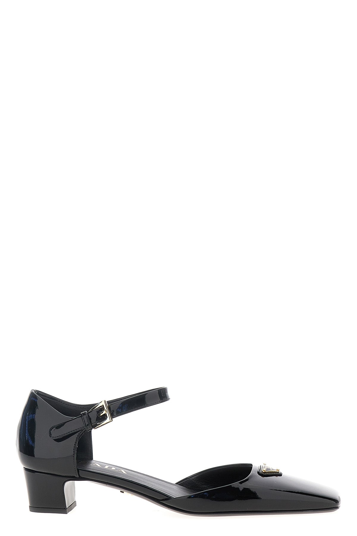 Escarpins en cuir verni avec logo triangulaire appliqué sur le devant, bride réglable et talon recouvert de cuir.